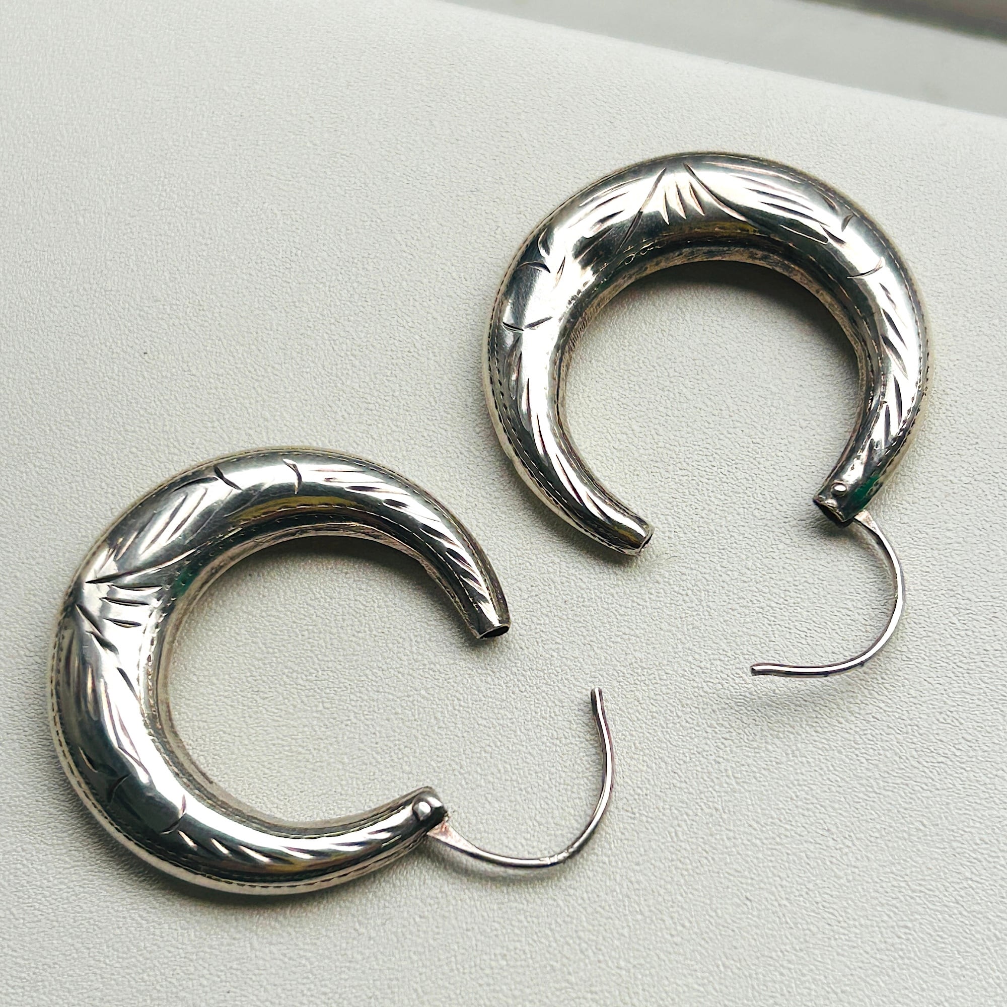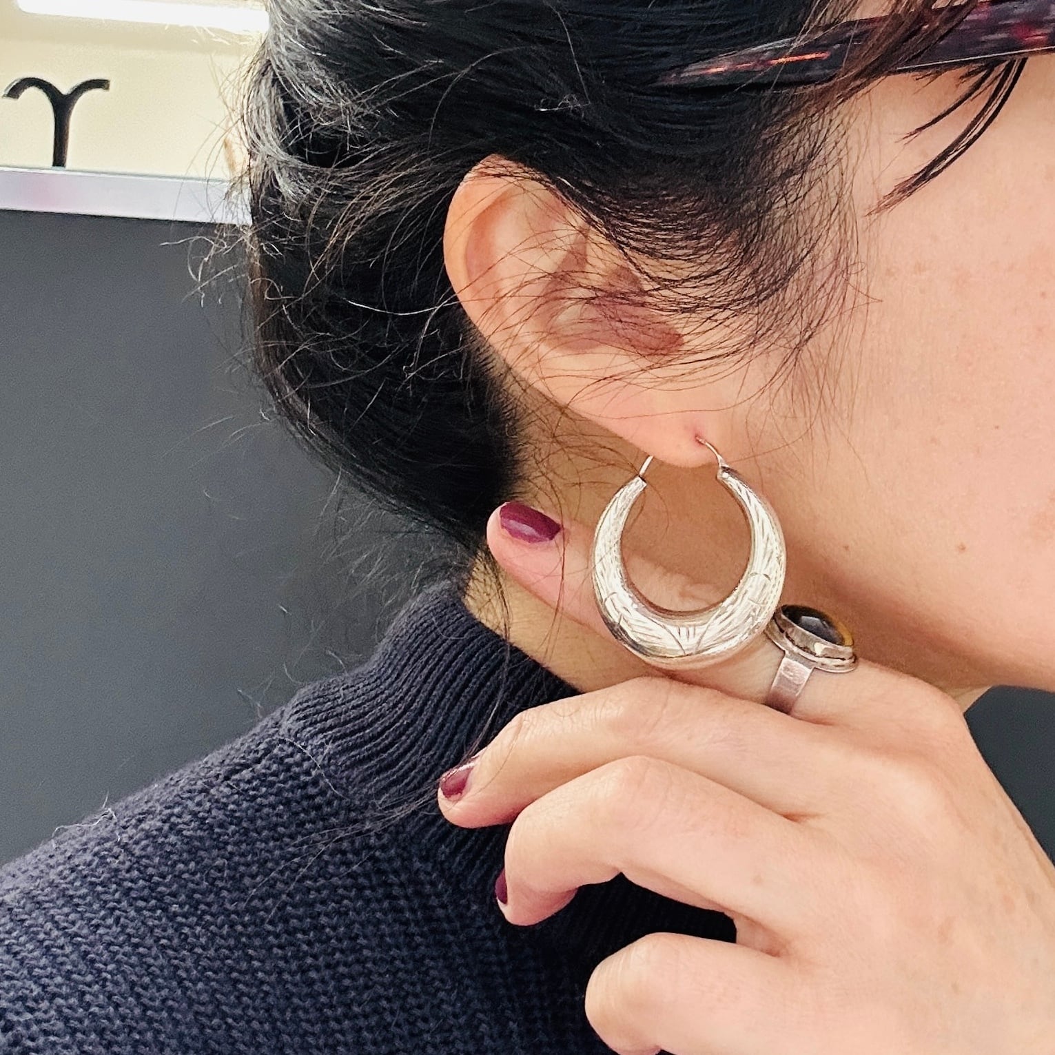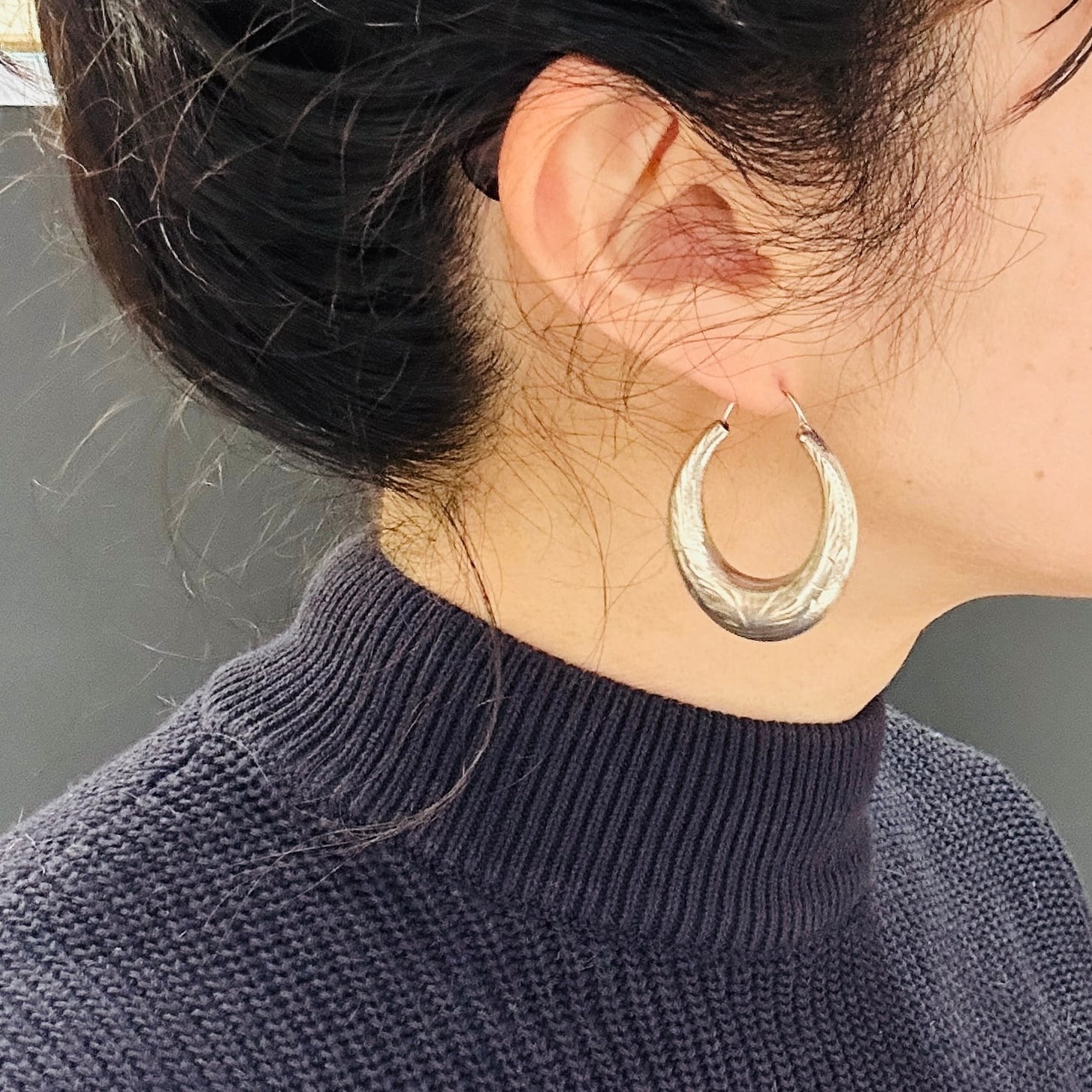次第に大きく広がったカタチのフープピアス。彫り模様が入ってクラシカルでカッコいいです。ピアス針を内側に縮めると穴にはまるようになっています。手元の感覚がすぐに慣れますので着脱に問題ありません。日頃のお手入れはウェットティッシュで拭き取りが一番簡単でオススメです。その他、シルバー磨きクロス、ぬるま湯に洗剤又は石鹸で洗いと濯ぎでキレイになります。中が空洞ですので洗った後はしっかり乾かして下さい。