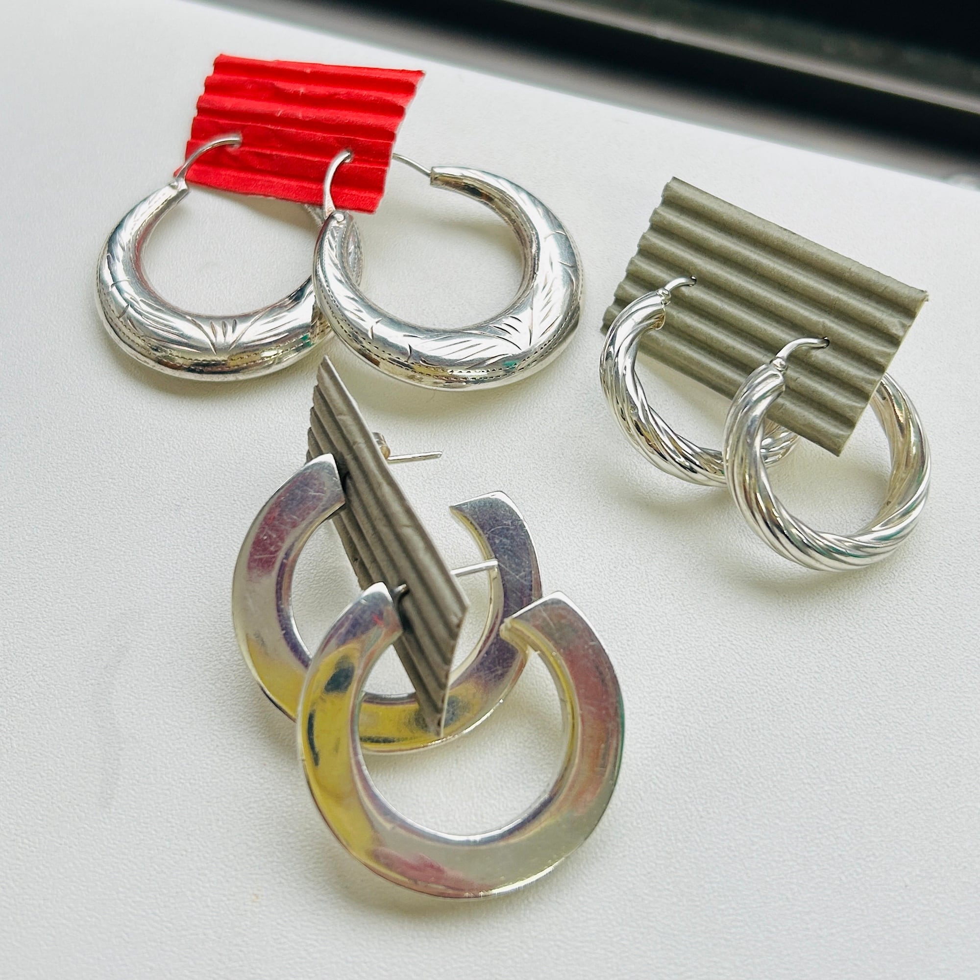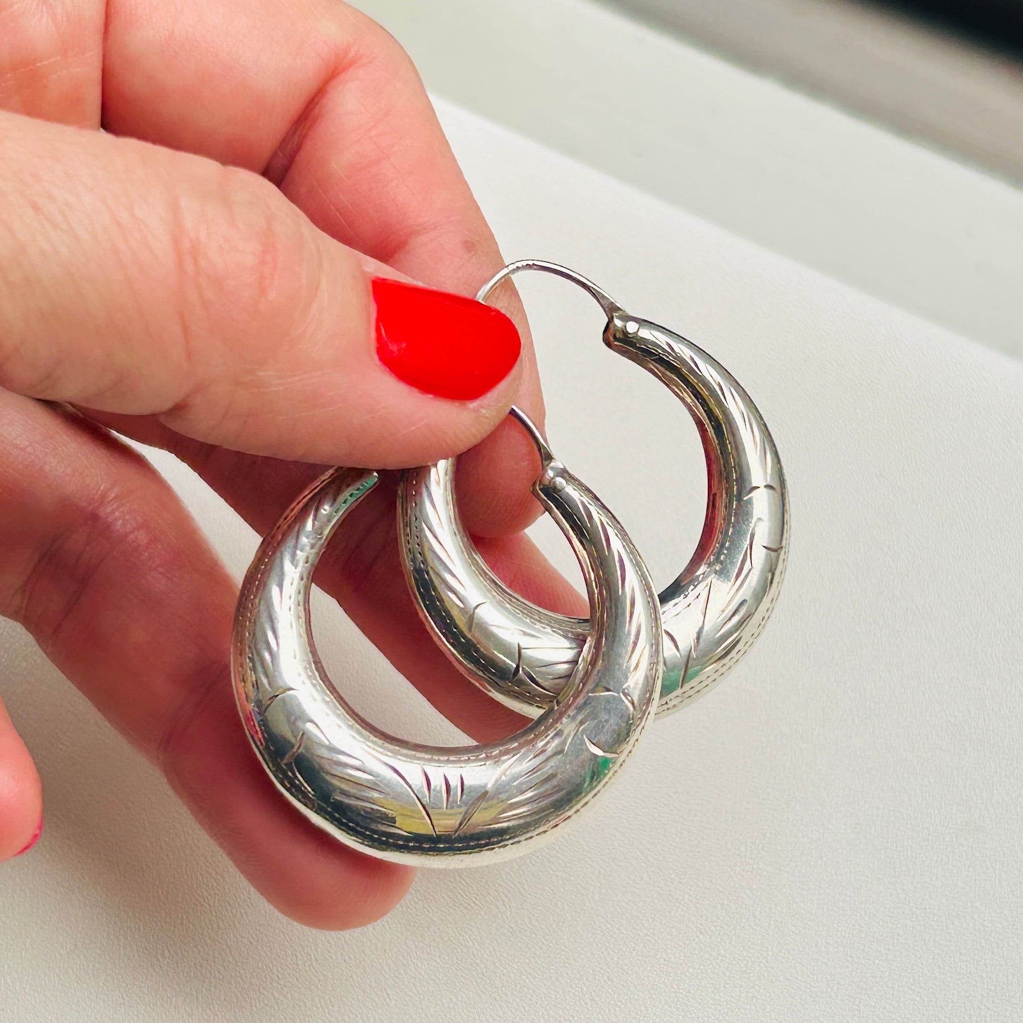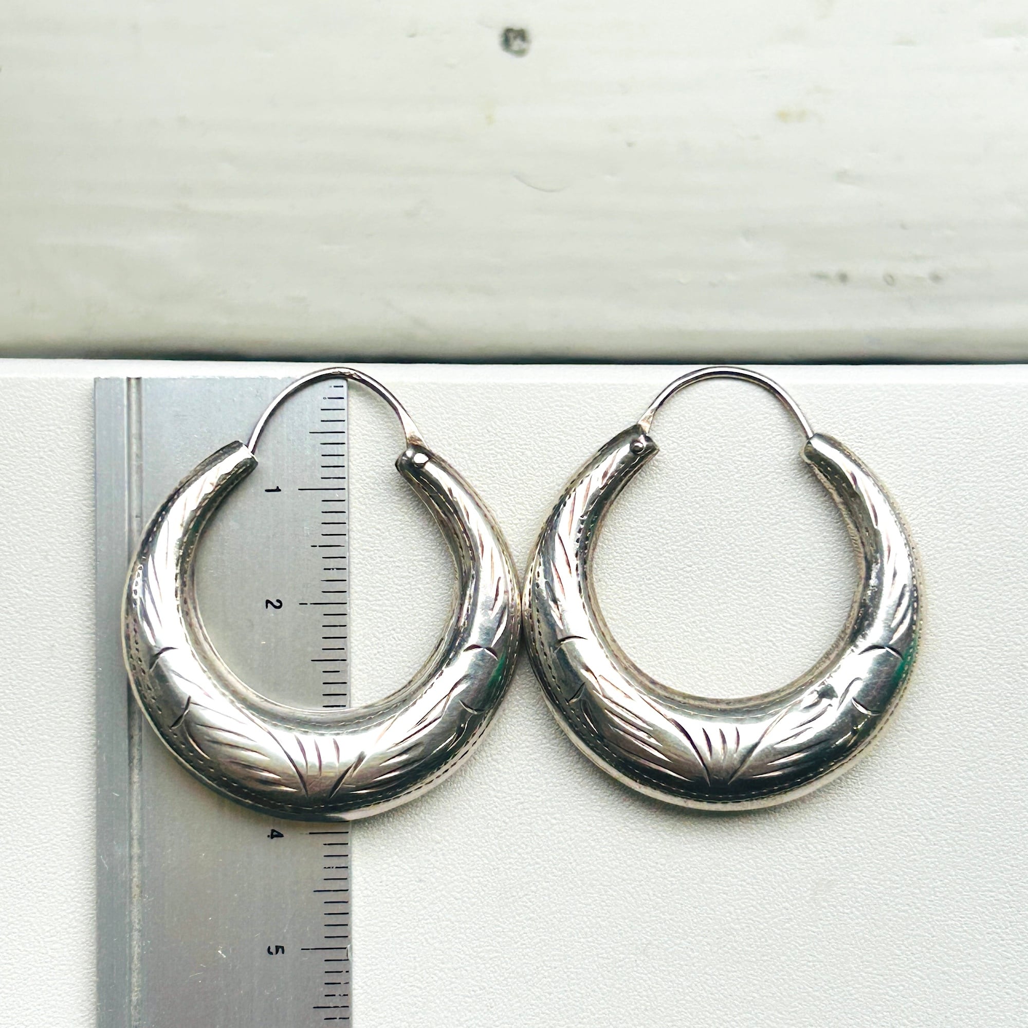 次第に大きく広がったカタチのフープピアス。彫り模様が入ってクラシカルでカッコいいです。ピアス針を内側に縮めると穴にはまるようになっています。手元の感覚がすぐに慣れますので着脱に問題ありません。日頃のお手入れはウェットティッシュで拭き取りが一番簡単でオススメです。その他、シルバー磨きクロス、ぬるま湯に洗剤又は石鹸で洗いと濯ぎでキレイになります。中が空洞ですので洗った後はしっかり乾かして下さい。