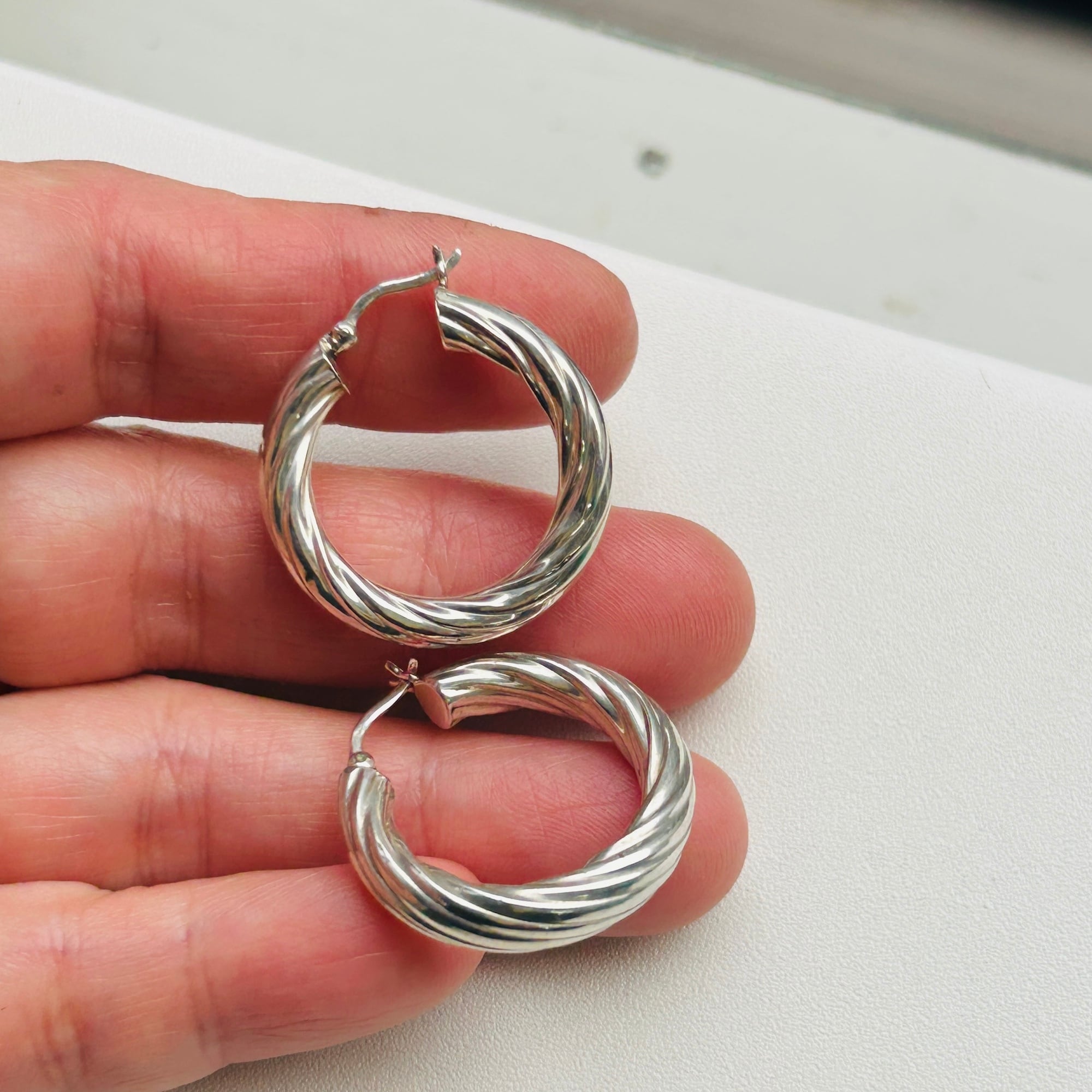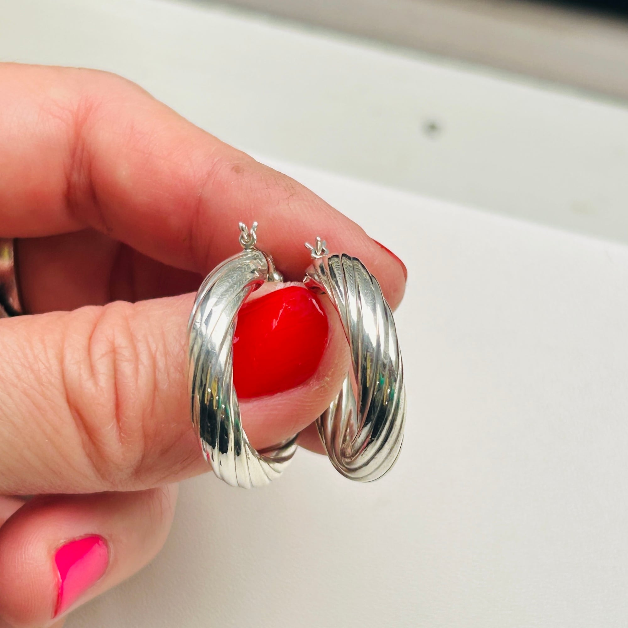 径5mmチューブに捻りリブ模様のフープピアス。凹凸ある模様はよく映えます。どこかクラシカルでカッコいい、大人カジュアルな雰囲気のフープです。片方、針の付け根あたりに小さな穴が空いています。着脱は両手を使って頂くと安心です。針にメーカーマークと「925」。日頃のお手入れはウェットティッシュで拭き取りが一番手軽で簡単です。その他、シルバー磨きクロスやぬるま湯に洗剤又は石鹸で洗いと濯ぎ、液体クリーナーなど。洗った後はしっかり乾かして下さい。