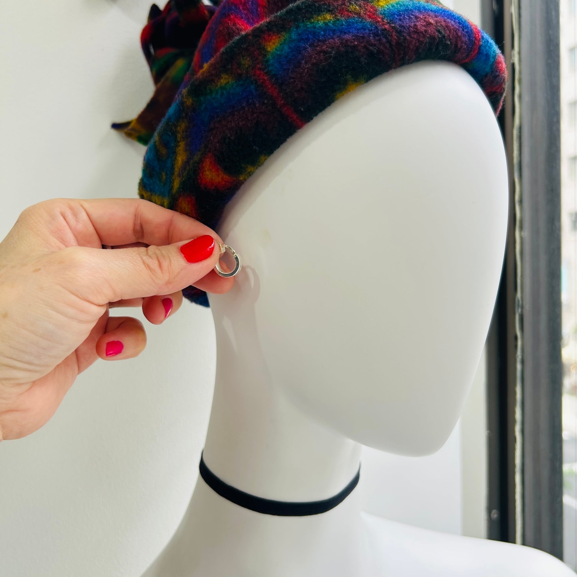 コロンとしたミニフープ。モダンでキュートなピアスです。こちら耳たぶスペースが約4mmと狭いのでご注意下さい。私はごく普通の耳たぶですが針を通してからフックを引っ掛ける時に耳たぶを内側に収めないと針で挟んでしまいます。挟むと痛いので気をつけて下さい。針がフックに留まれば全く問題ありません。着けてる感覚がないくらいの着け心地で耳たぶに痛みは感じません。針に「925」とメーカーマーク。