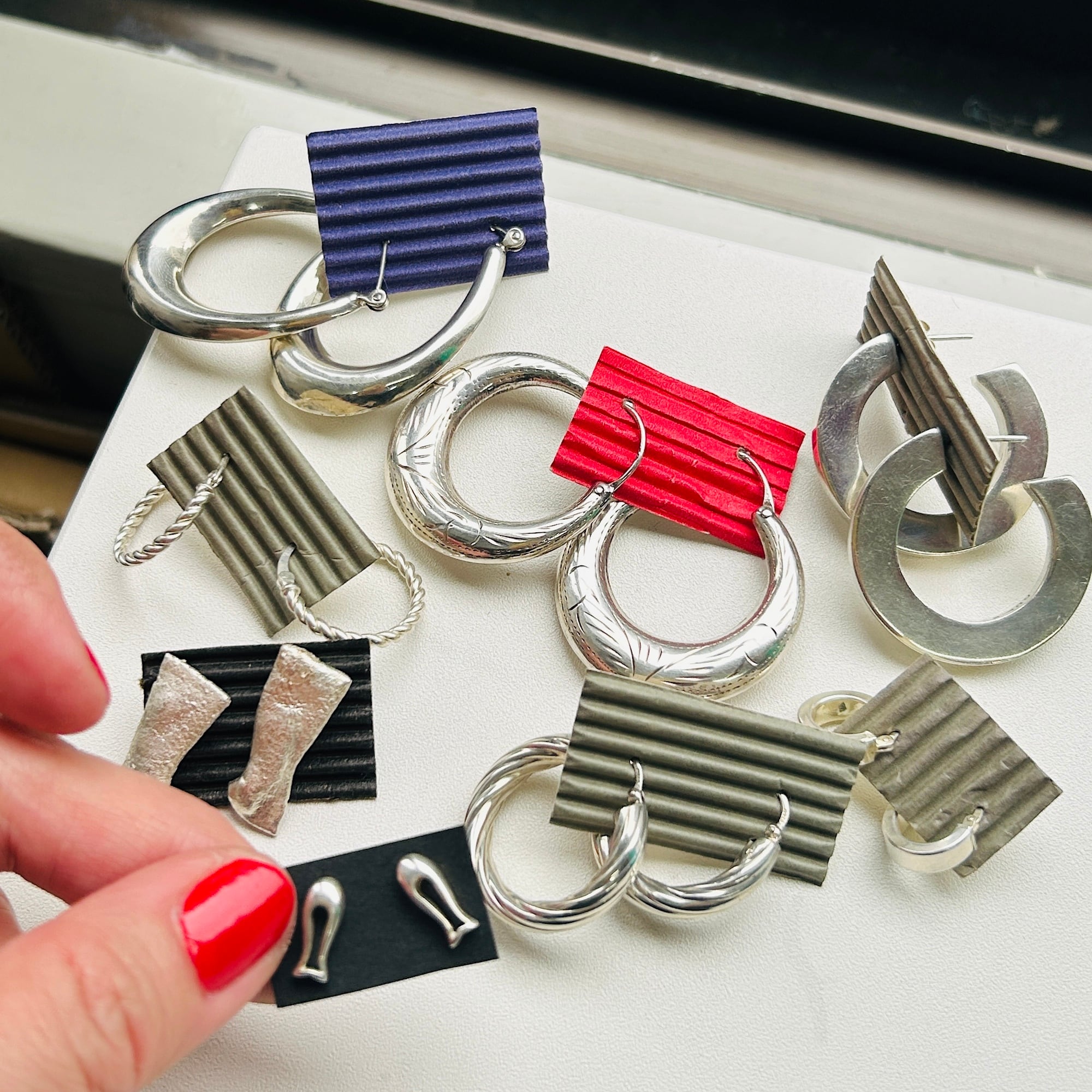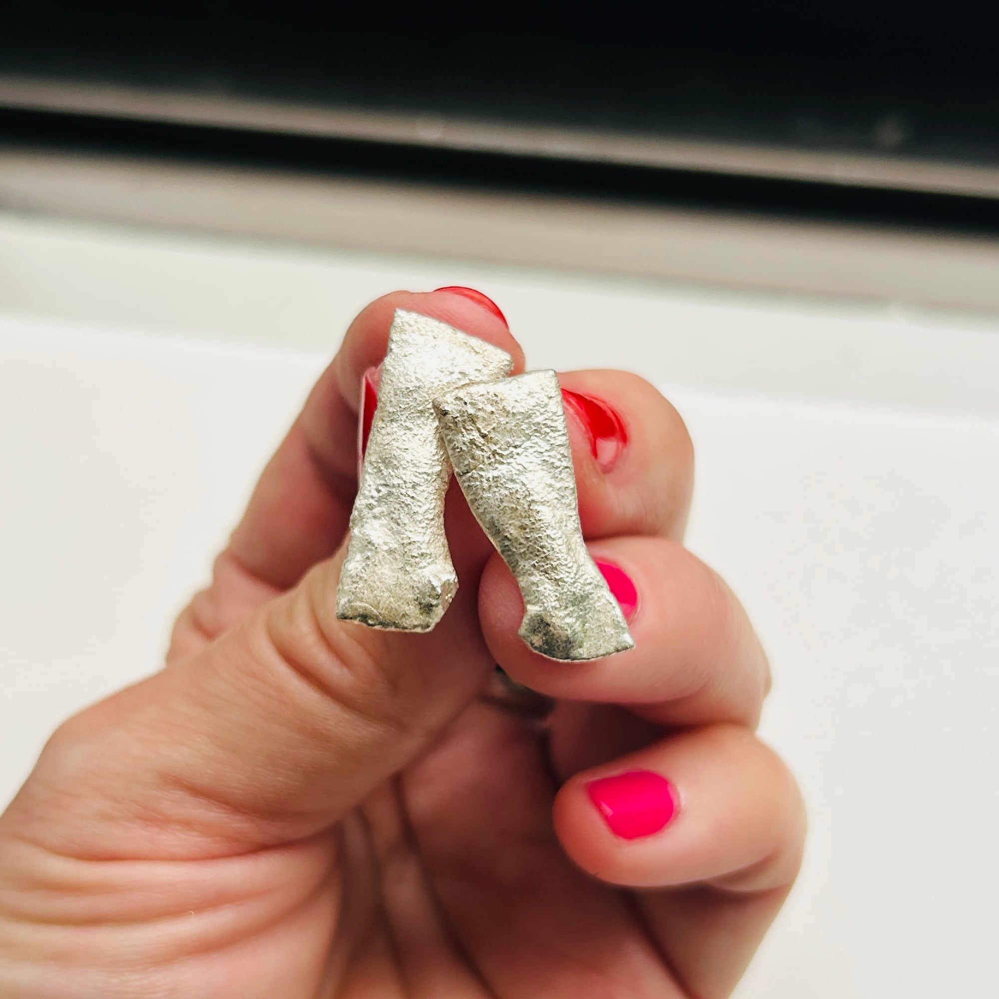 現代作家さんの作品かと思わせる抽象的デザインピアス。ユニークなカタチ・テクスチャーのセミマットシルバーです。針の位置が上位にあるので耳から垂れ下がるように留まって素敵です。刻印なしシルバーです。キャッチに「925」。