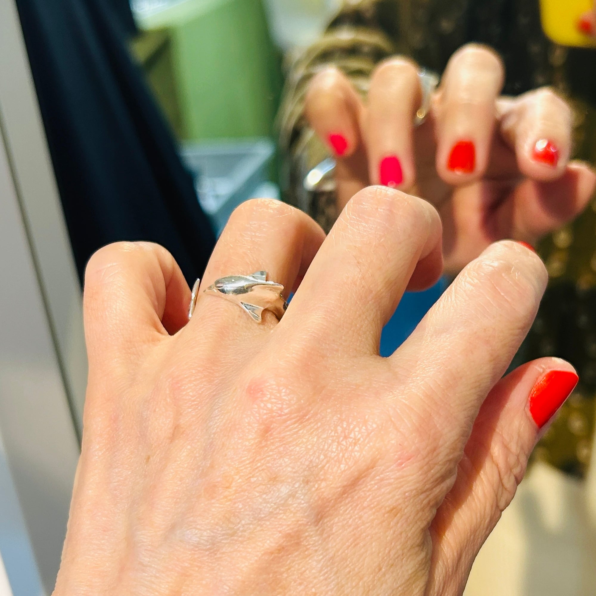 イルカのラップリング。イルカが盛り上がっていて見栄えするデザイン。中厚でシャープ。美しい作りです。海外っぽくて可愛い手元になるリング❤︎