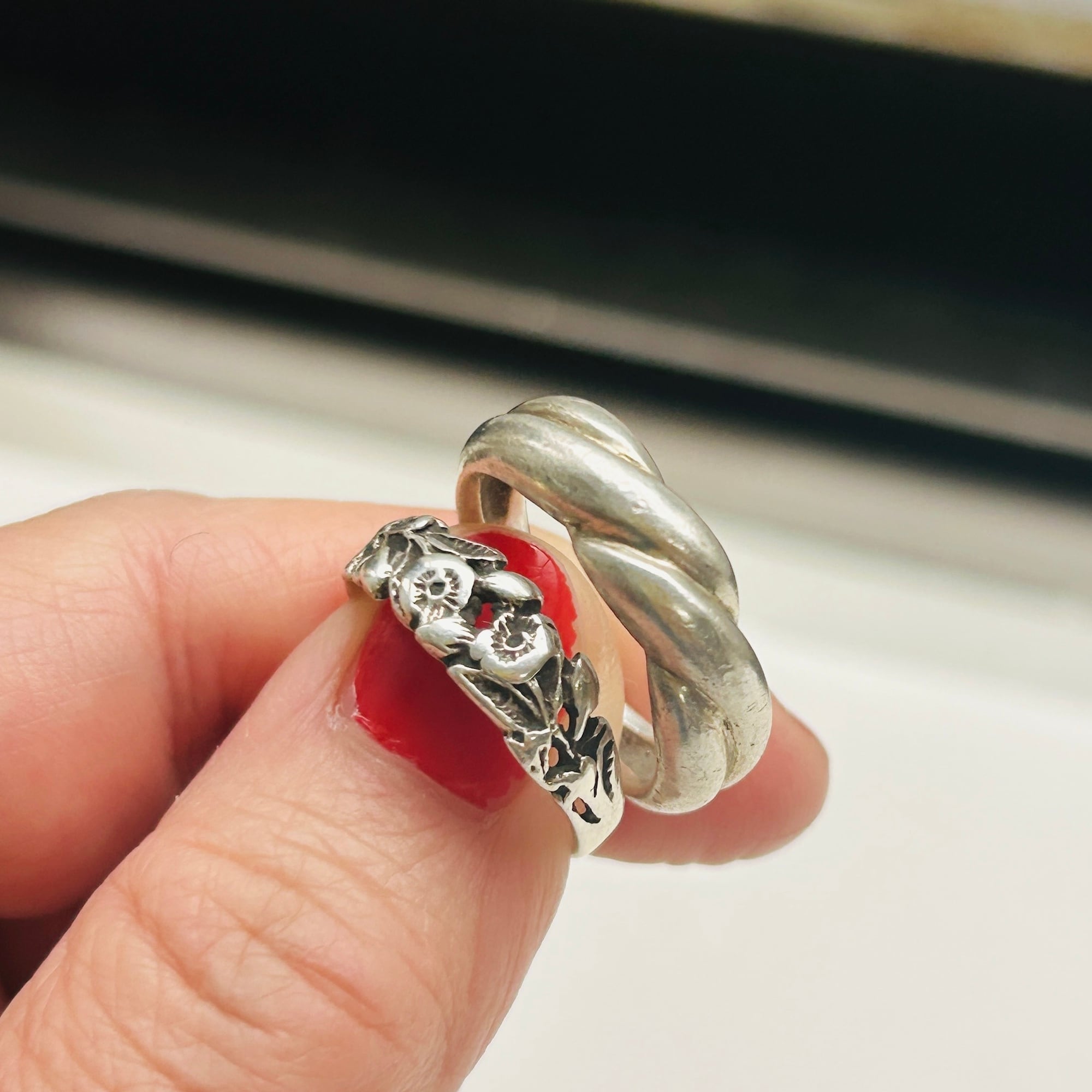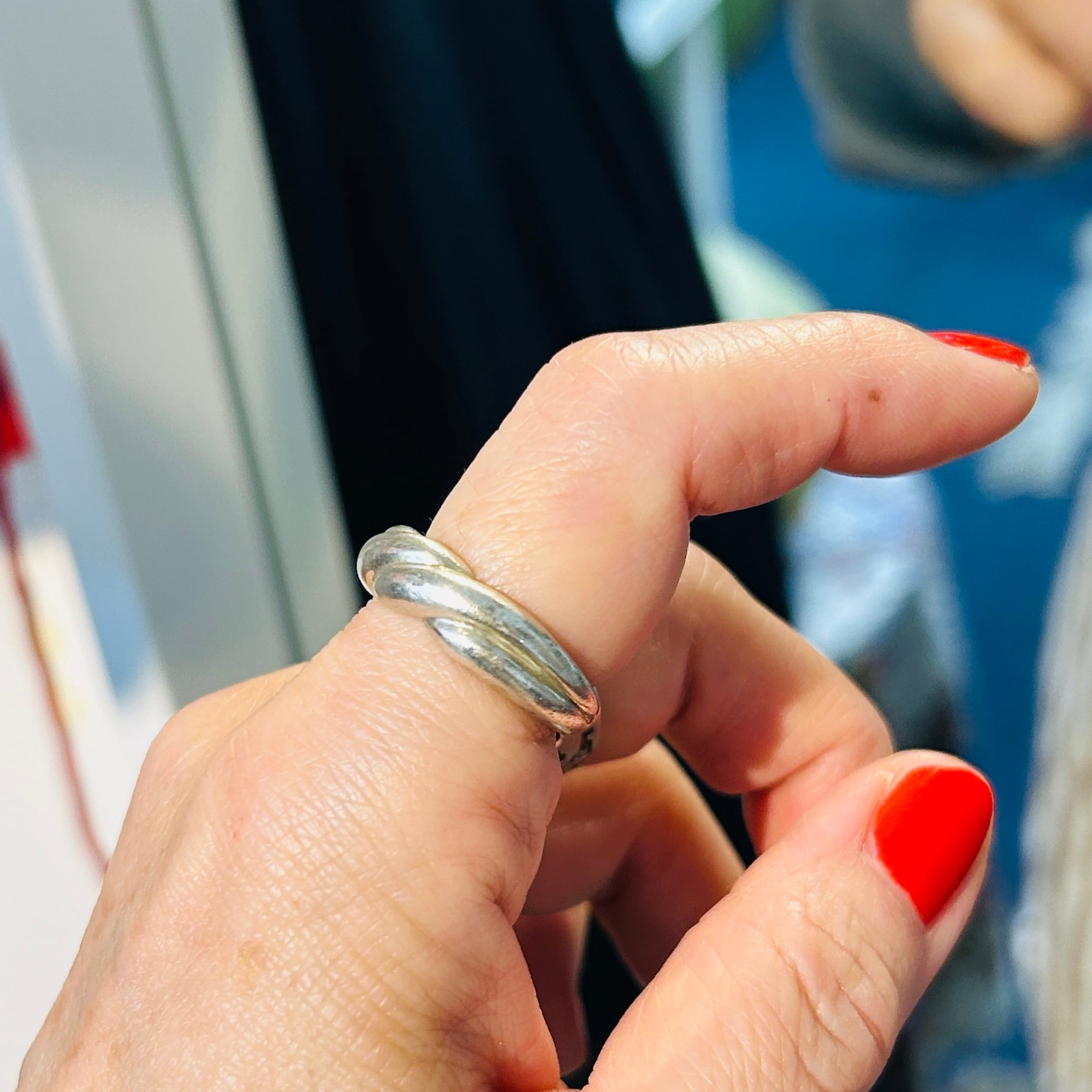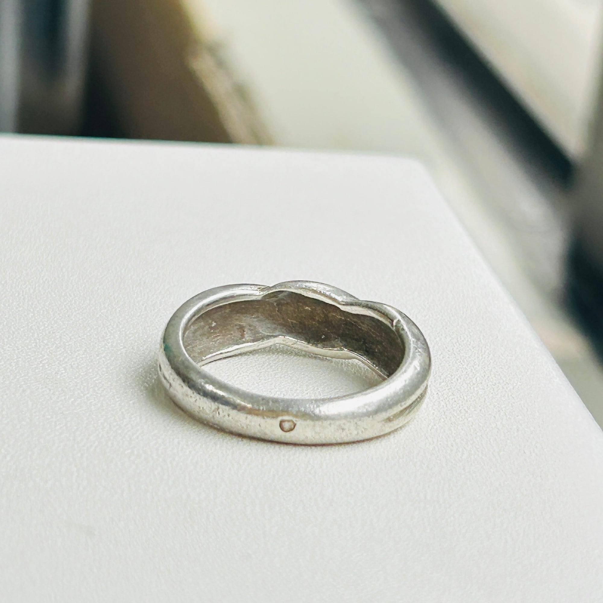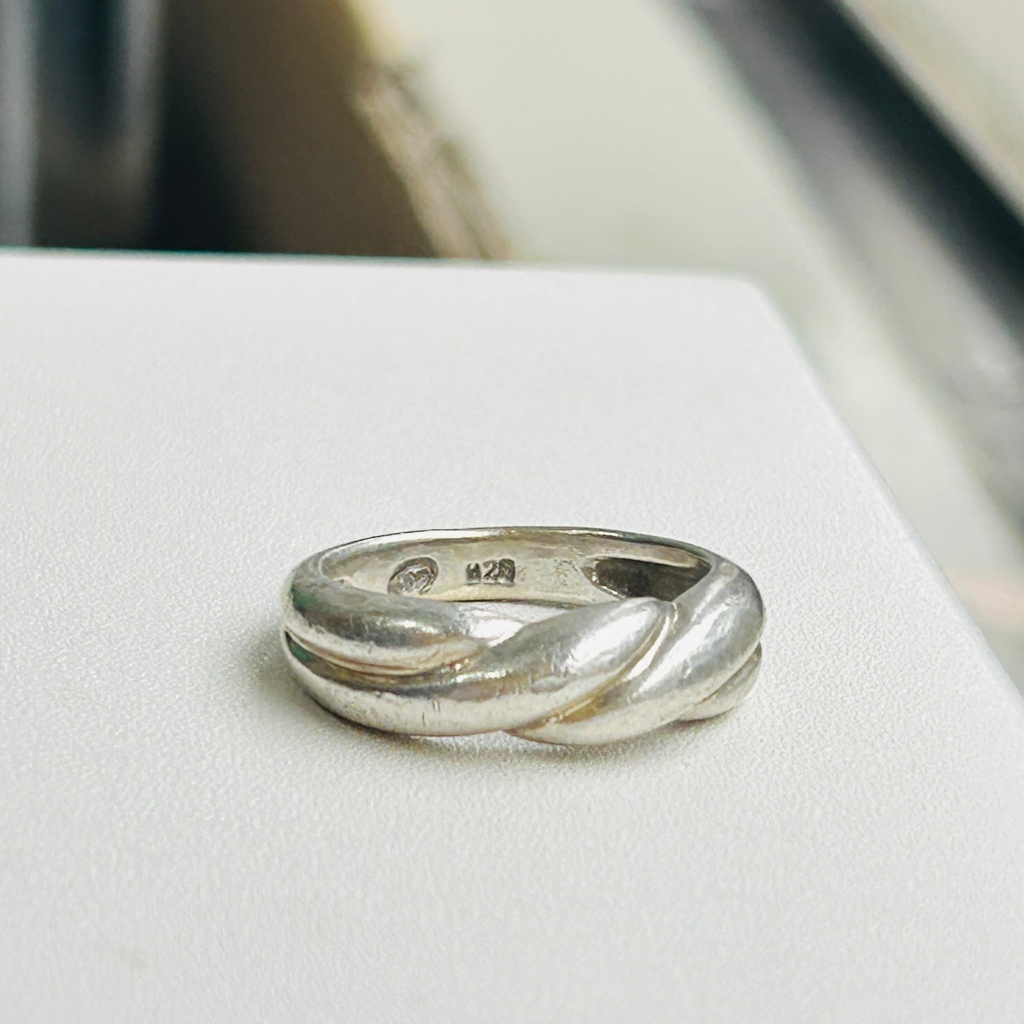 程よいボリュームのツイストデザインリング。フランスから届きました。比較的使い込まれた感じがあるツヤ控えめのシルバーリングです。ヴィンテージらしい風合いも含めて気に入って頂ける方にオススメの素敵なリングです。内側にフランスメーカーマークと「925」、外側にミネルヴァマーク(フランスシルバー800を最低保証。1994年以降に使用された刻印。)私の14号人差し指には少し緩いです。実寸に近い着用感かなと想像します。中厚でしっかりした作りのリングです。