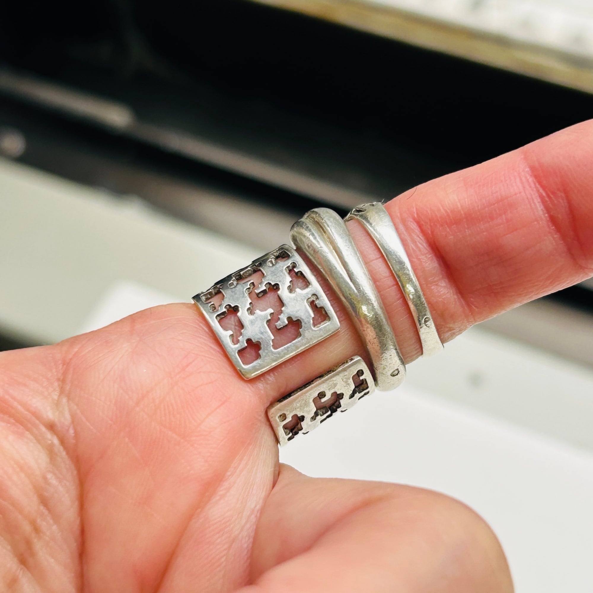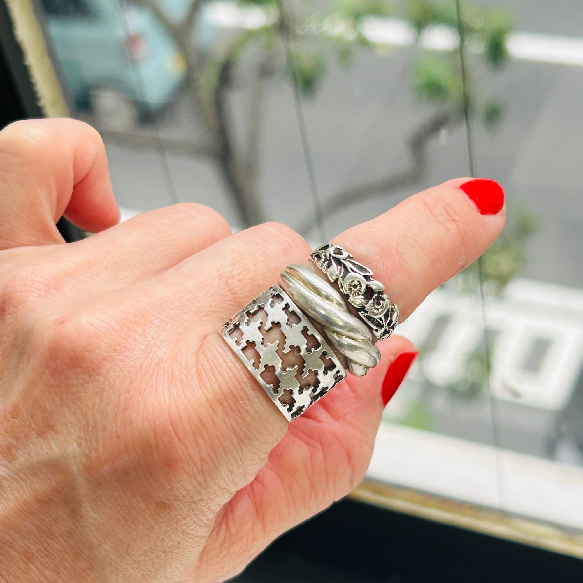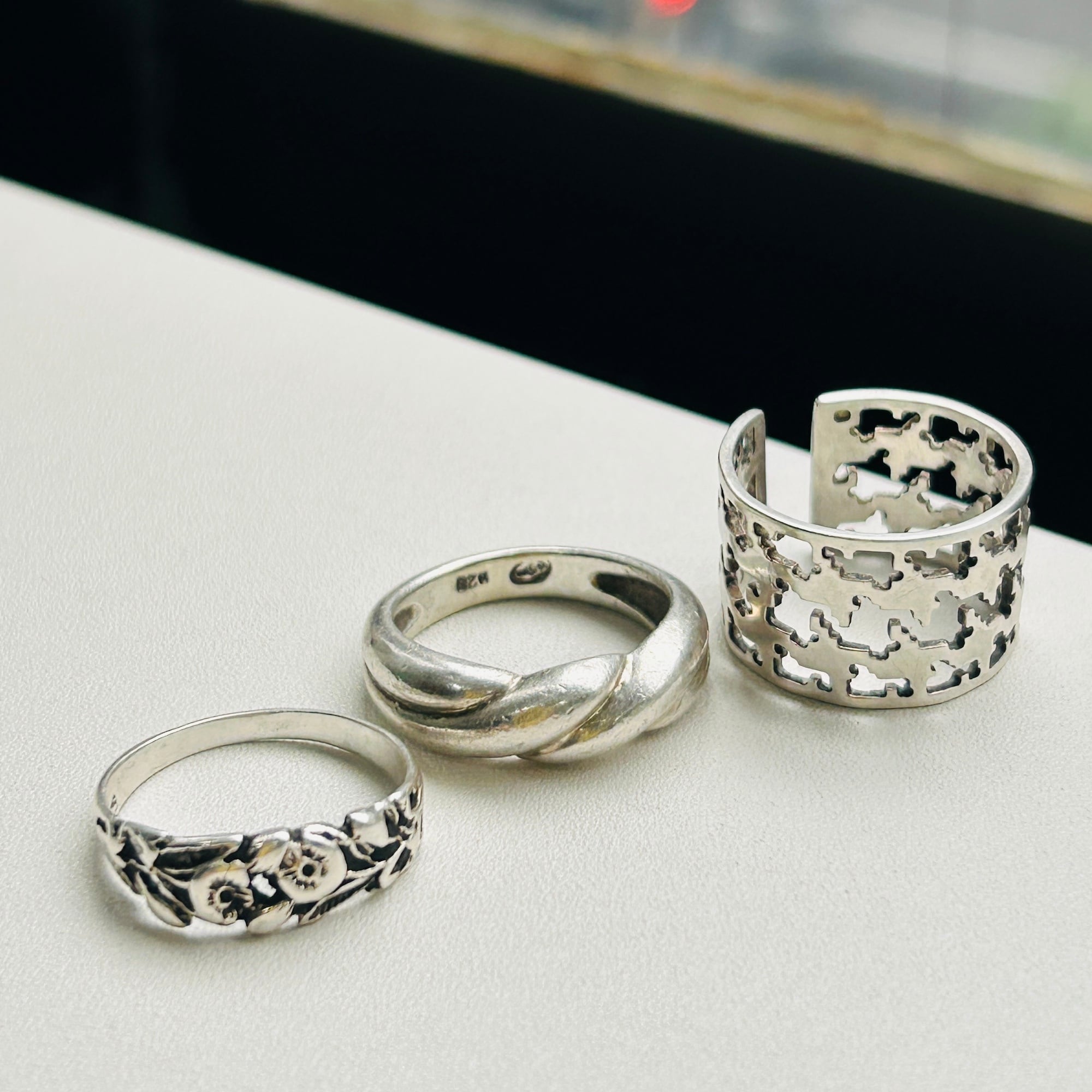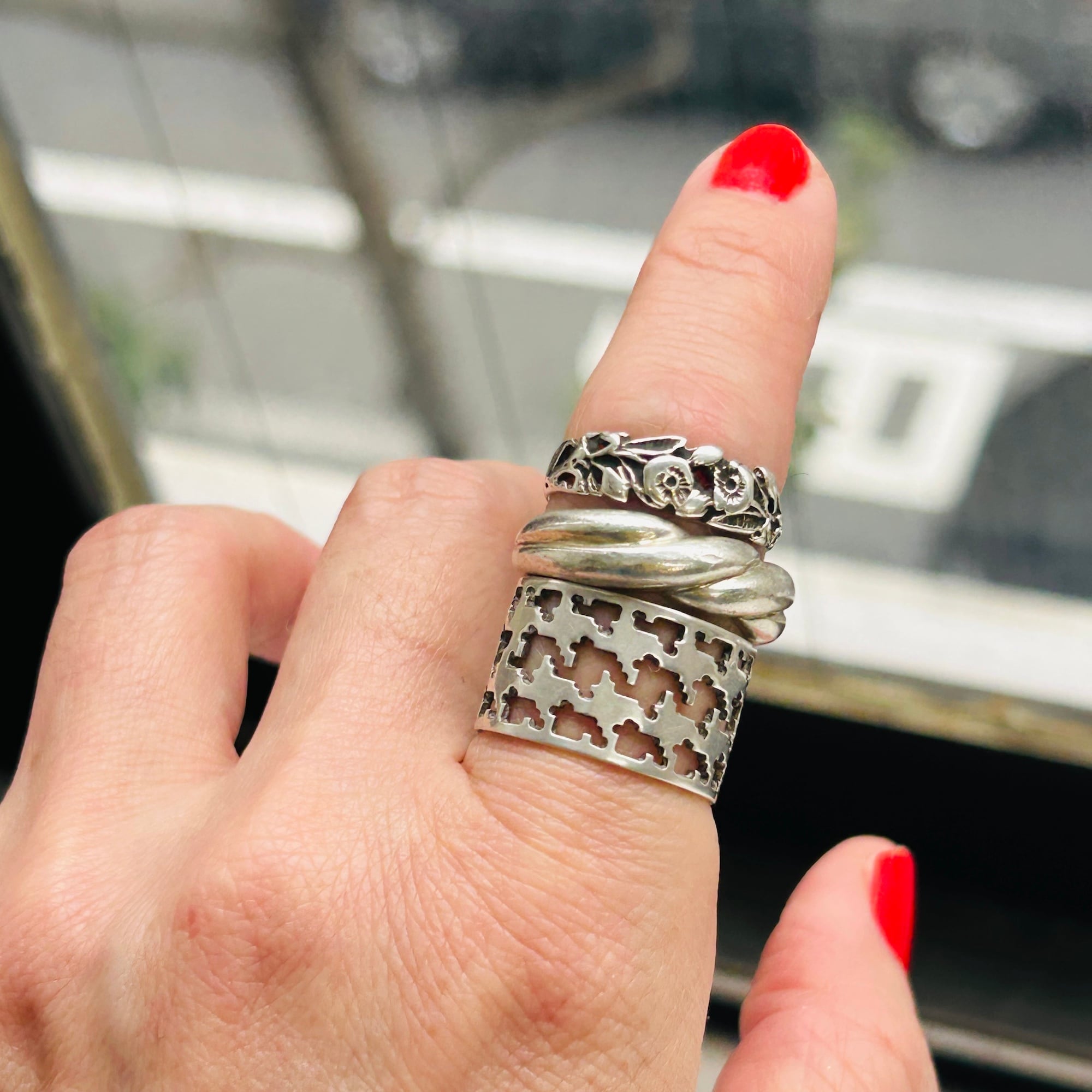 程よいボリュームのツイストデザインリング。フランスから届きました。比較的使い込まれた感じがあるツヤ控えめのシルバーリングです。ヴィンテージらしい風合いも含めて気に入って頂ける方にオススメの素敵なリングです。内側にフランスメーカーマークと「925」、外側にミネルヴァマーク(フランスシルバー800を最低保証。1994年以降に使用された刻印。)私の14号人差し指には少し緩いです。実寸に近い着用感かなと想像します。中厚でしっかりした作りのリングです。