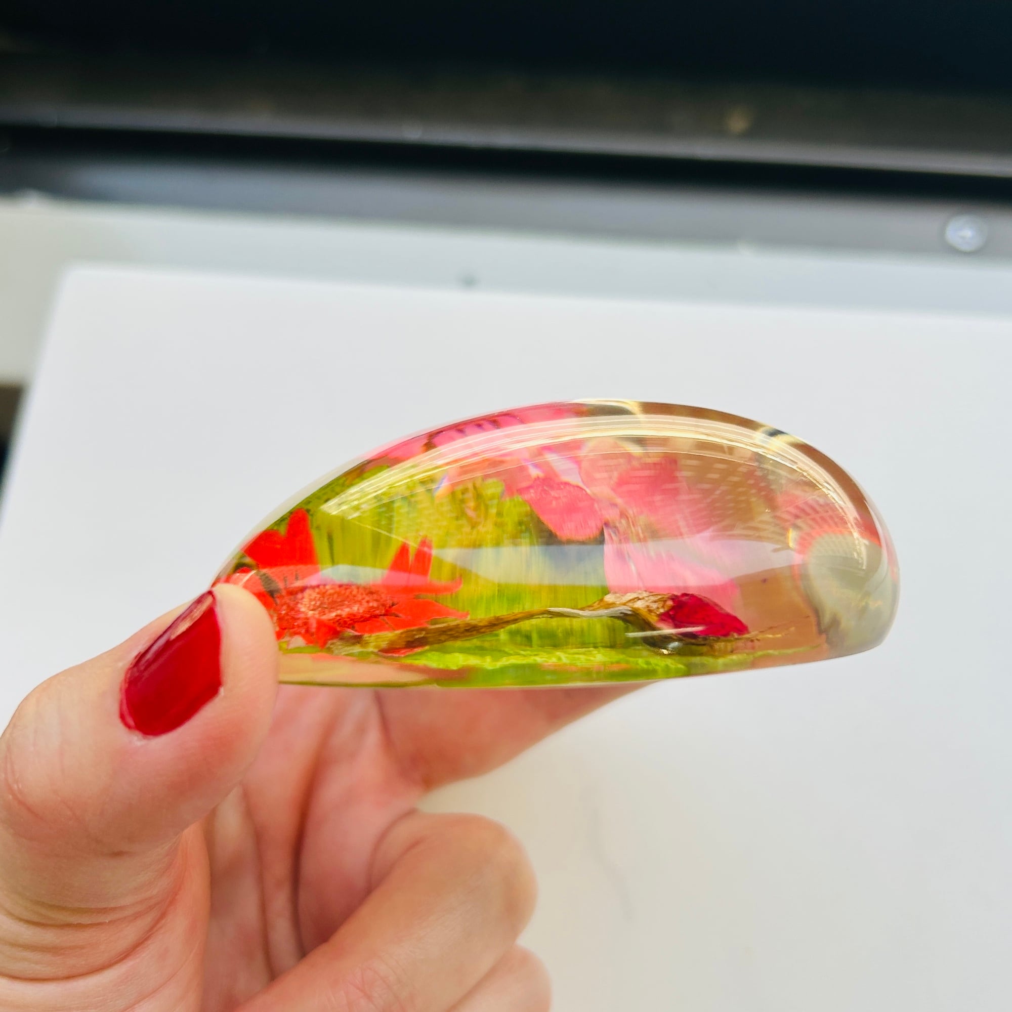 ノスタルジックで可愛いハート型ペーパーウェイト。ピンクのドライフラワーが入っています。ガラスのペーパーウェイトのように重くありませんが紙類を抑えるには十分の重さです。底面にシールを剥がした跡の粘着が少し残っています。できる限り取り除いてお届けします。