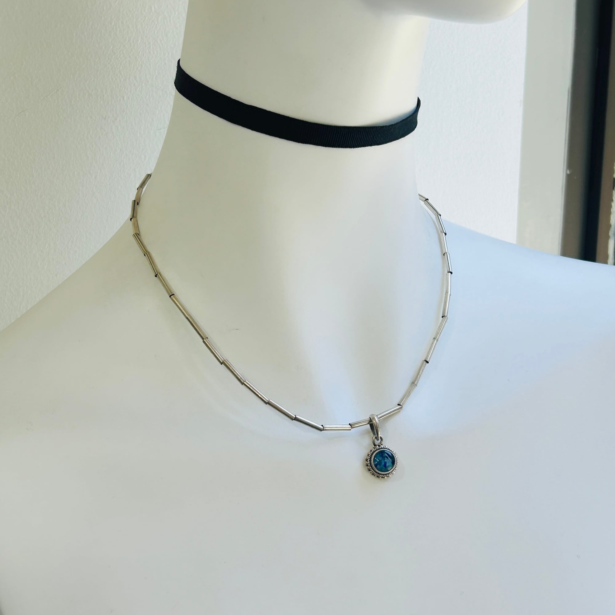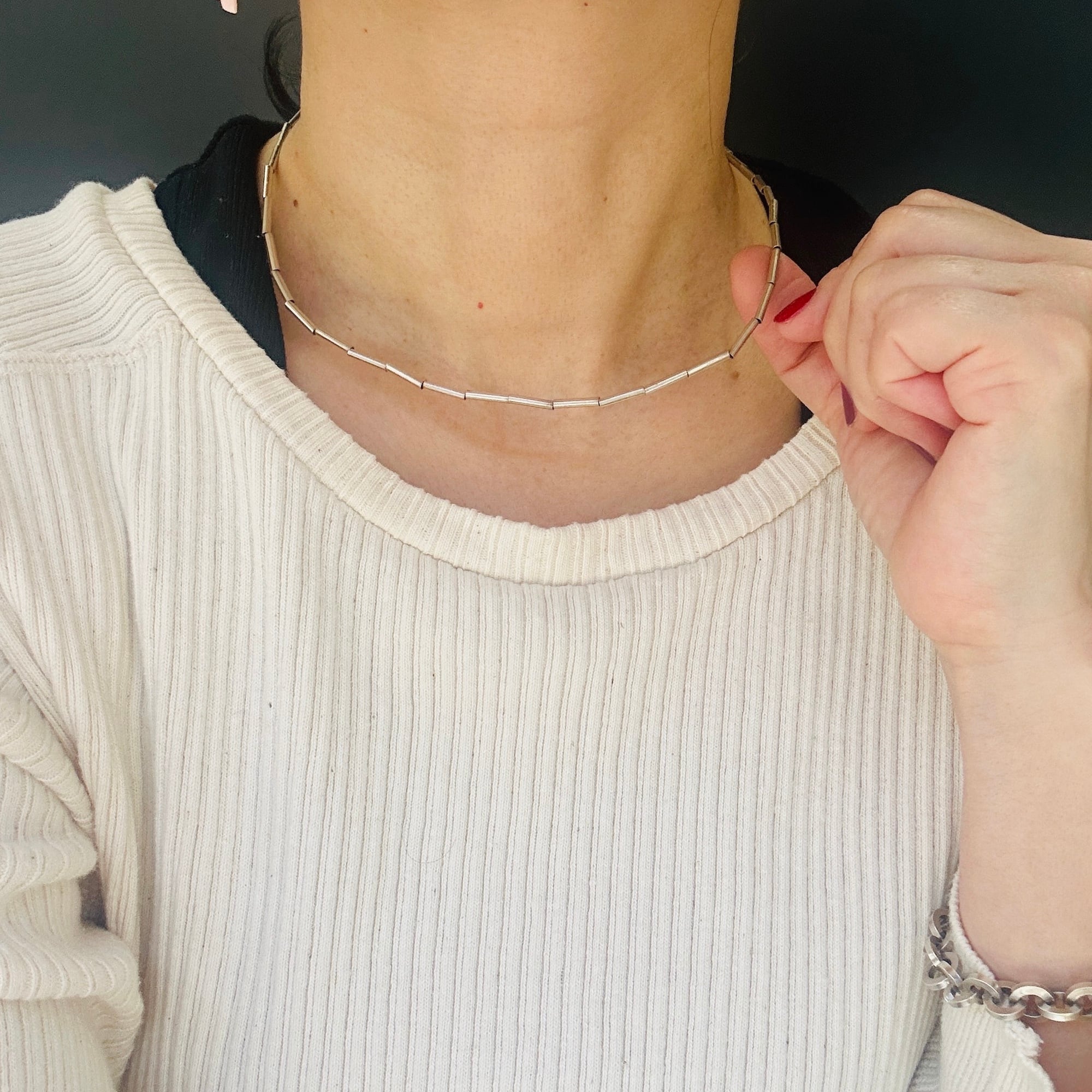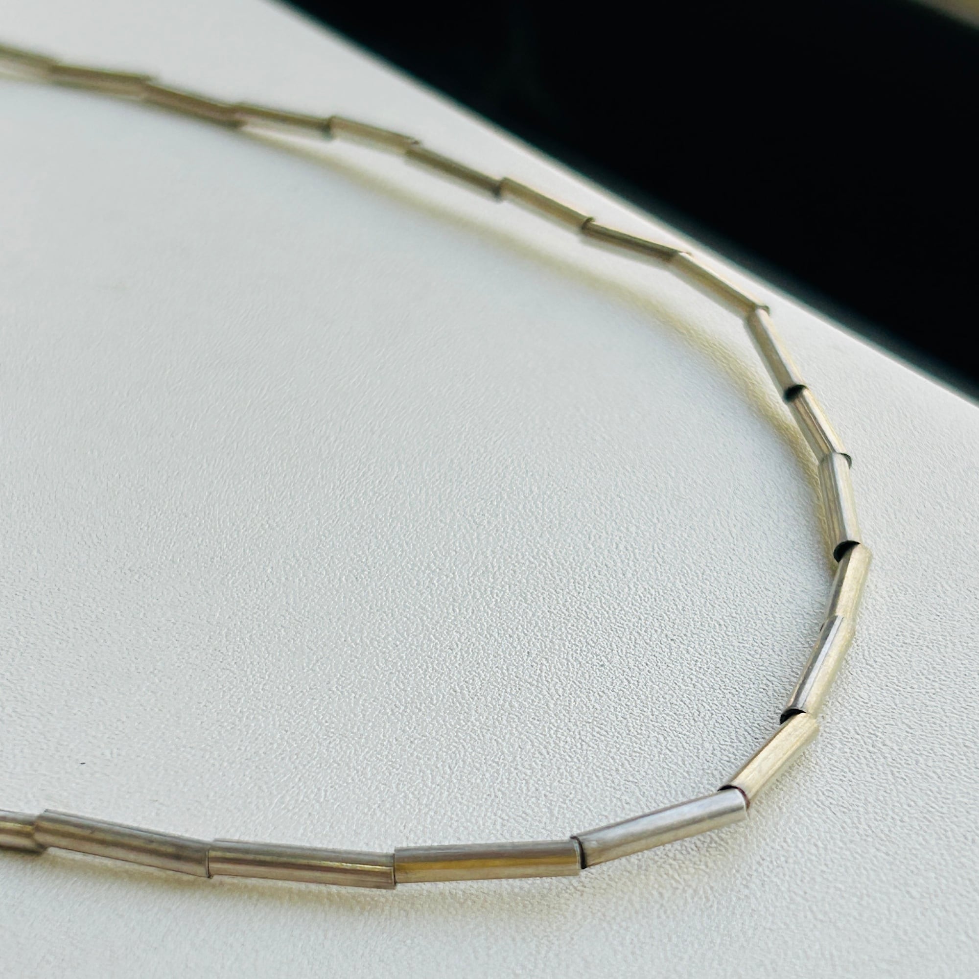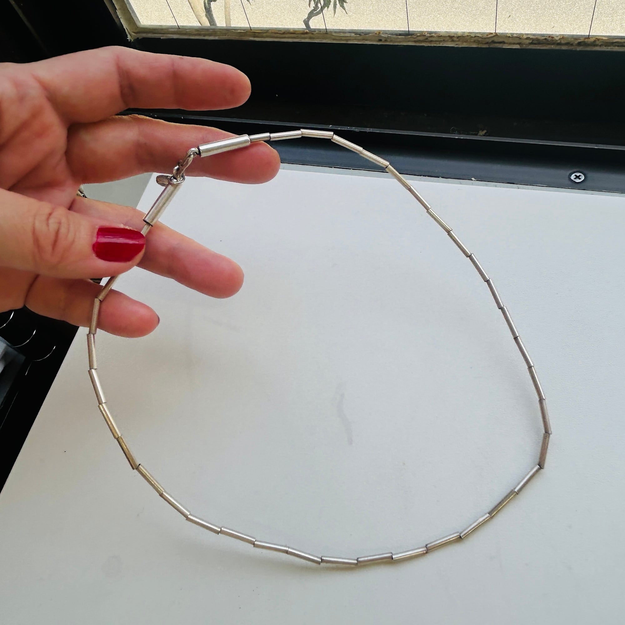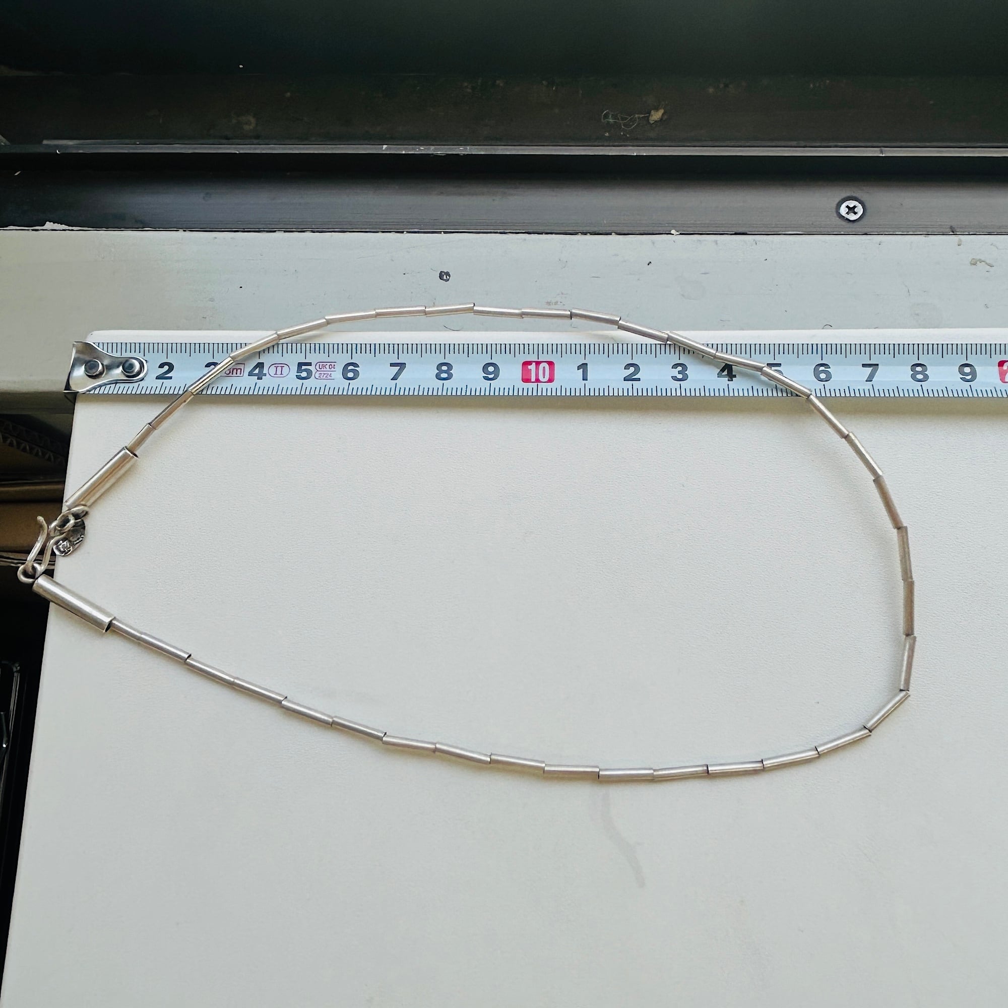 丸竹シルバービーズのネックレス。ちょっとエキゾチックな個性のあるネックレスです。通常のリキッドシルバーよりも太くて硬い丈夫な作りのビーズなので首元でクッキリ見栄えします。中はワイヤーが通っていると思いますがビーズや留め具の隙間から見えません。短めなのでシャツの襟元から見せるのも素敵だと思います。またどのようなネックレスとも合わせやすいです。使いやすい引っ掛けフックです。楕円タグにイーグルマークNo.3。1955〜79年、おそらくメキシコTAXCO製のもの。メキシカンシルバーでは珍しいデザインのネックレスです。
