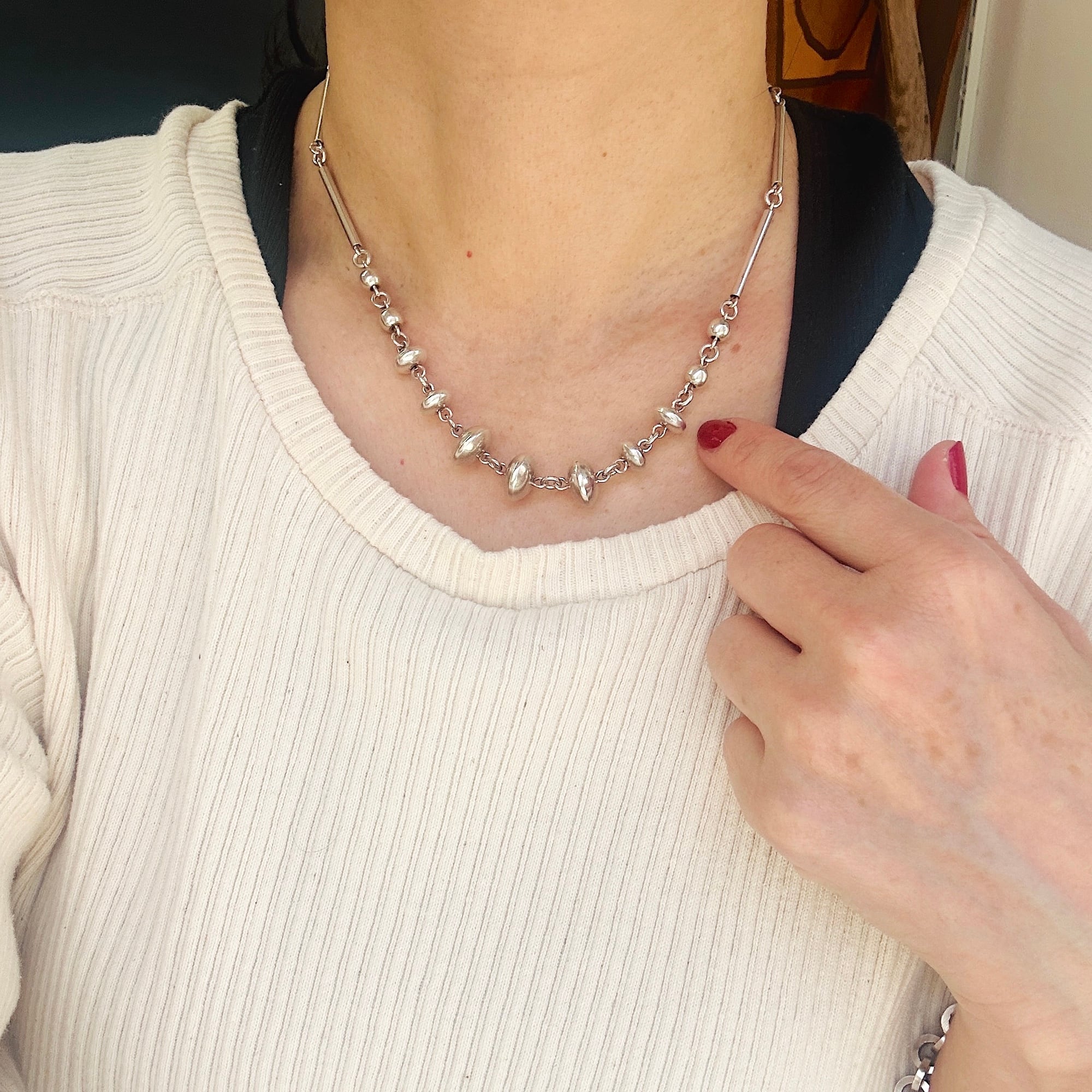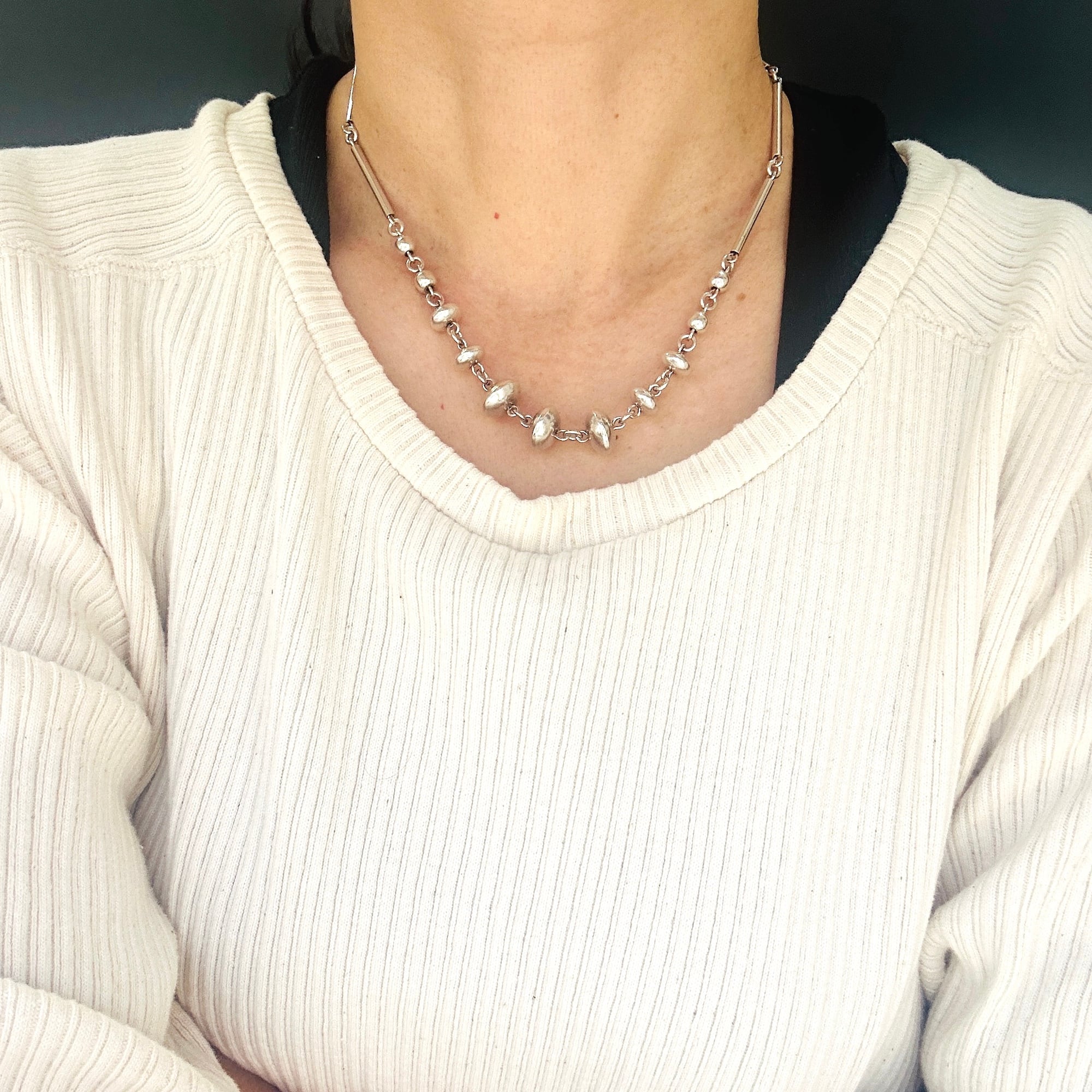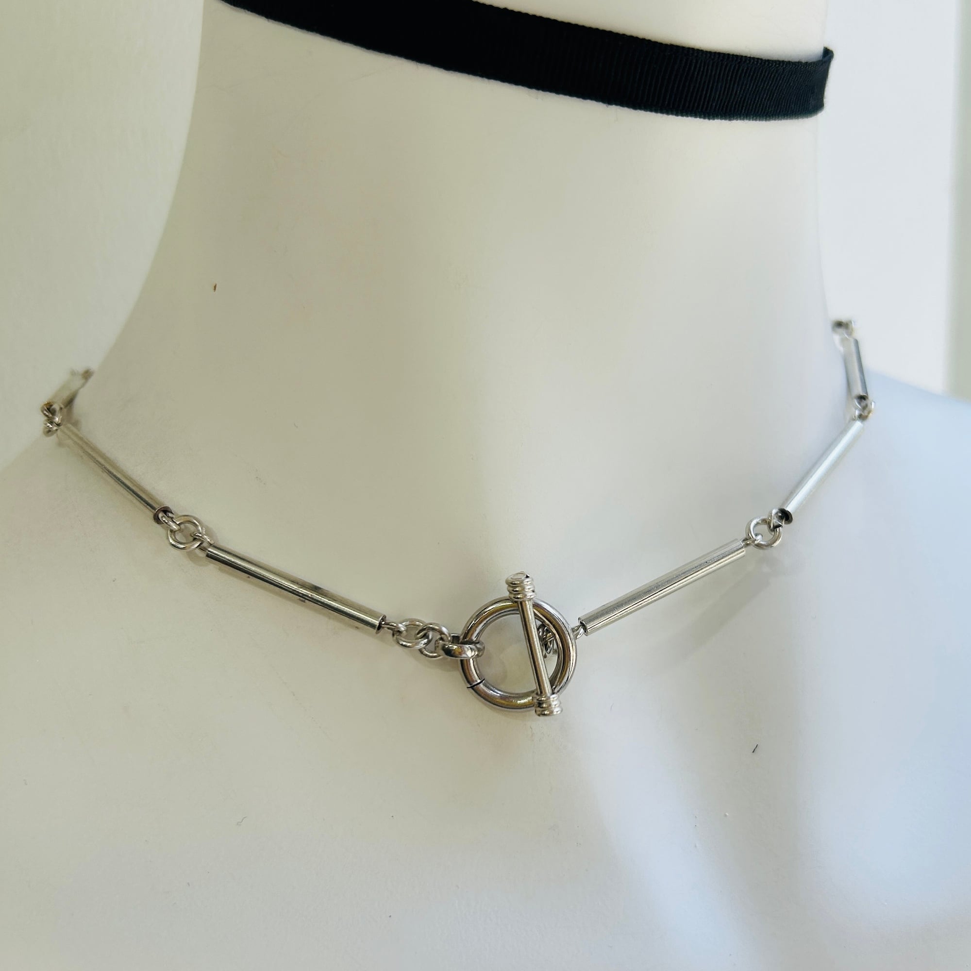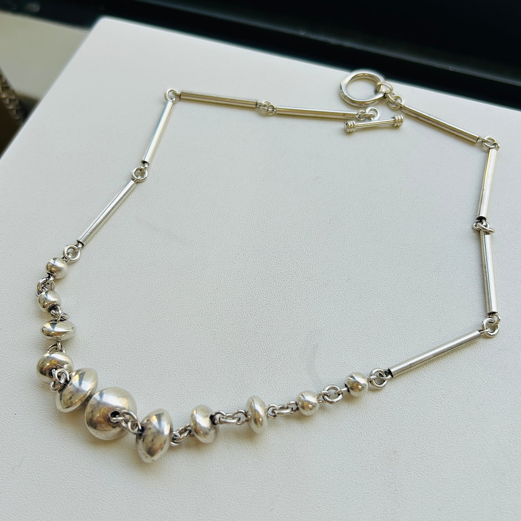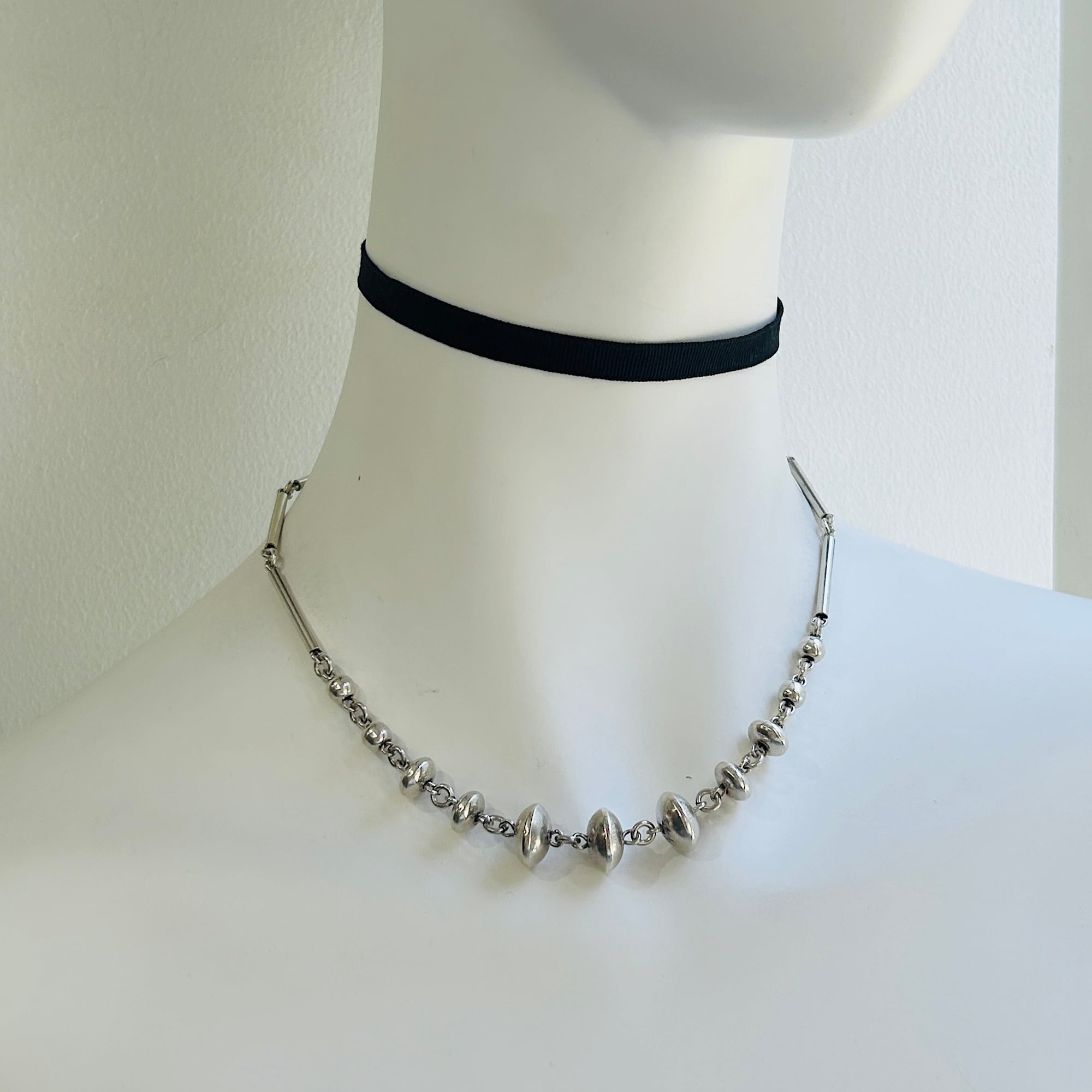 長さ2.4cmの丸筒バーと円盤型ビーズのリンクネックレス。入手当初、Tバーを通す輪が欠損していたので当店在庫のヴィンテージシルバーパーツでちょうどいい輪っかがあったので修理屋さんでつけてもらいました。違和感なくバッチリ仕上がりました。大人のネイティブ・アメリカン風デザイン。都会的でオシャレなネックレスです。刻印なしシルバーです。