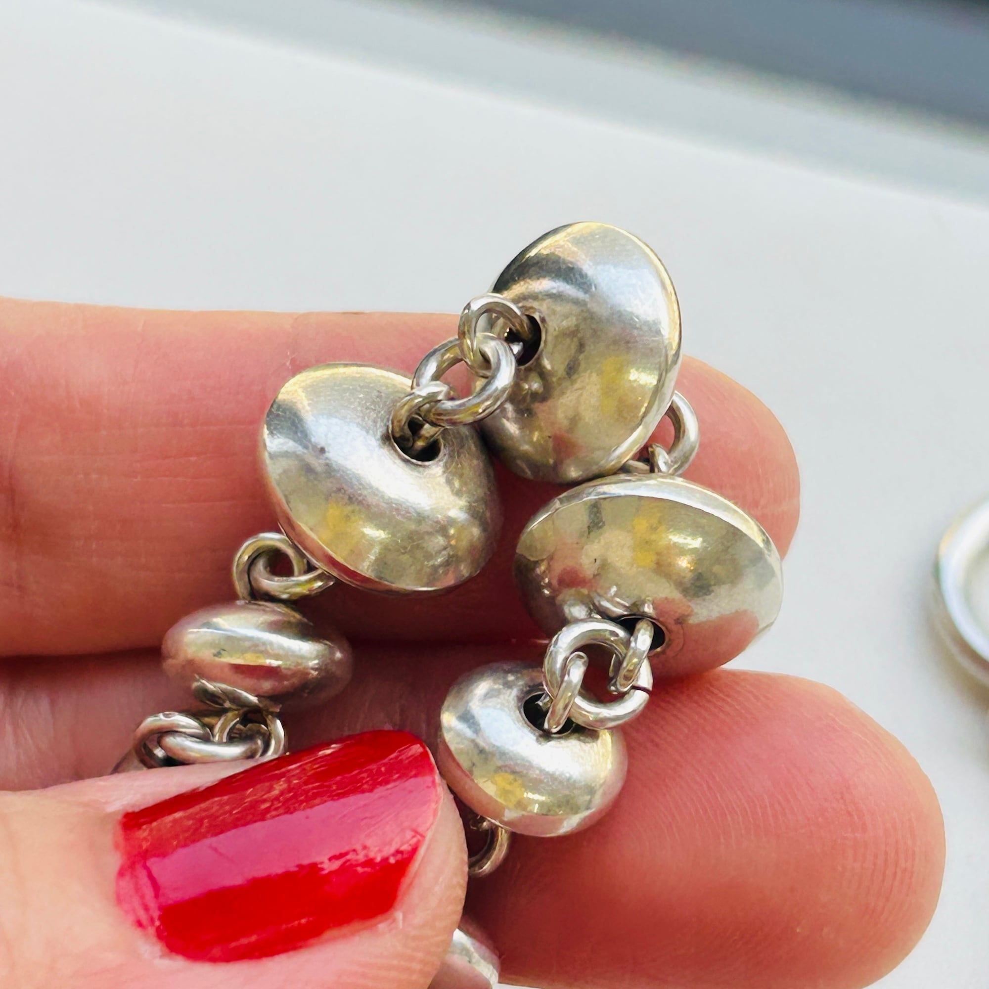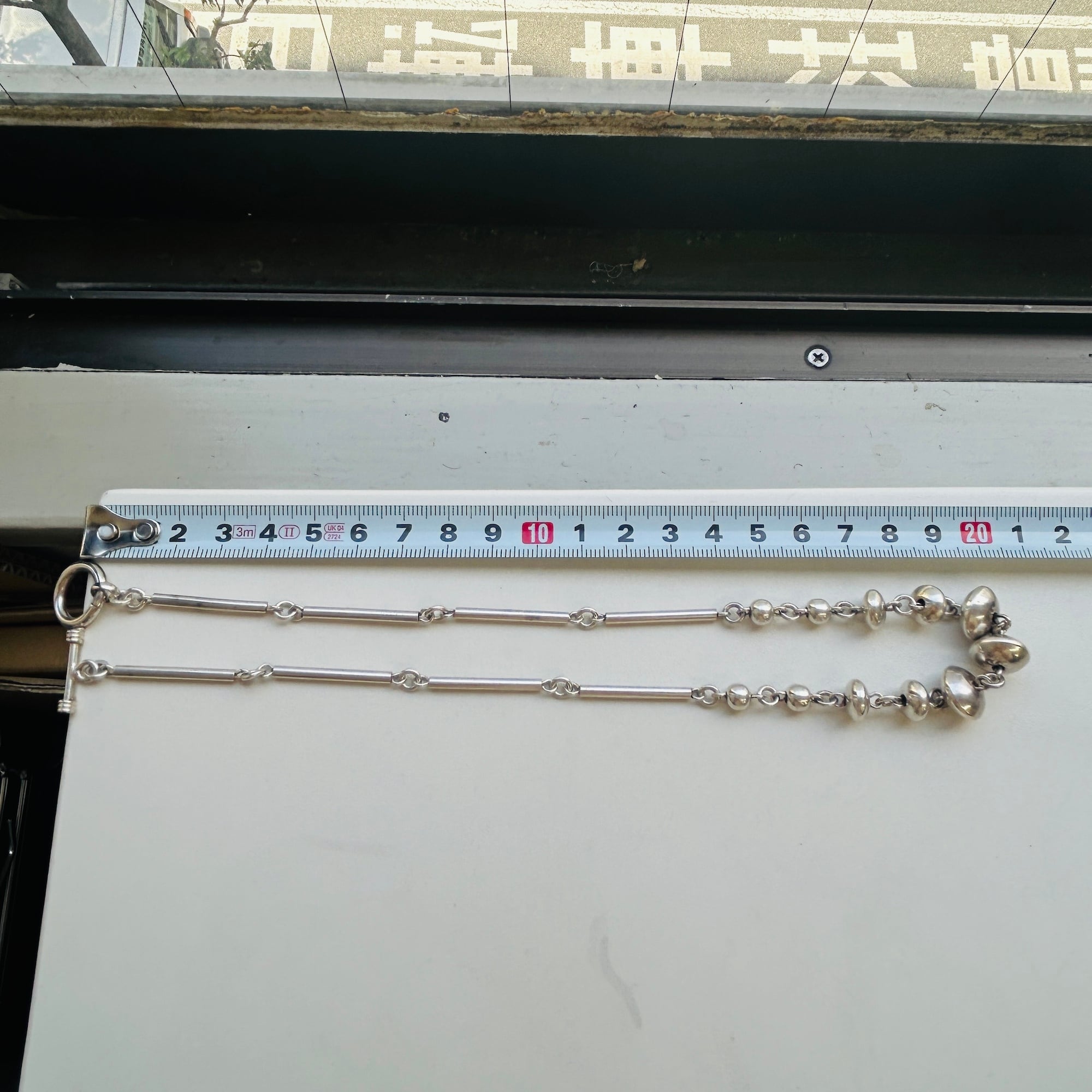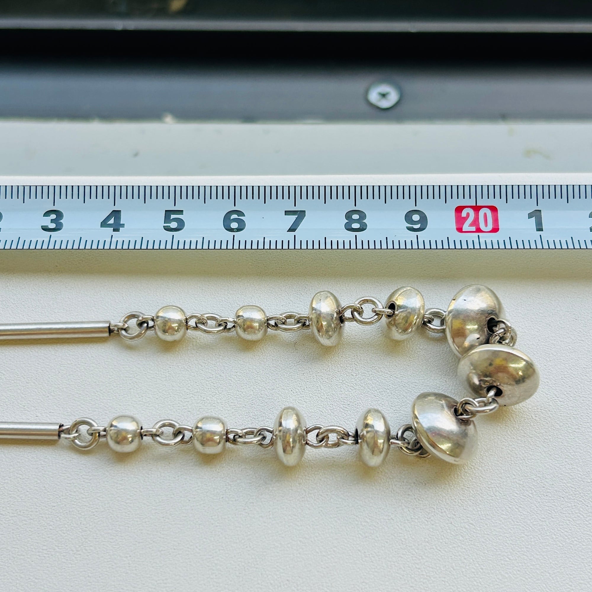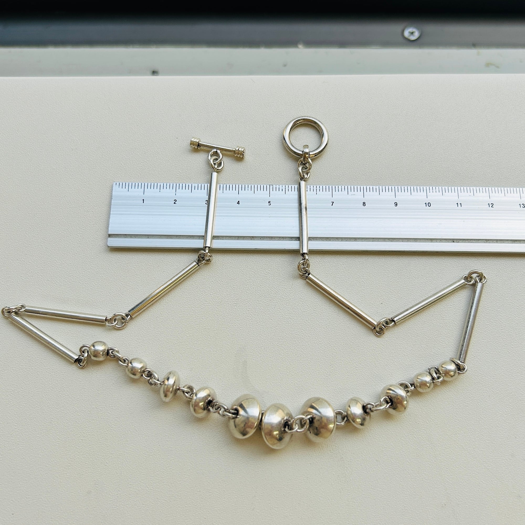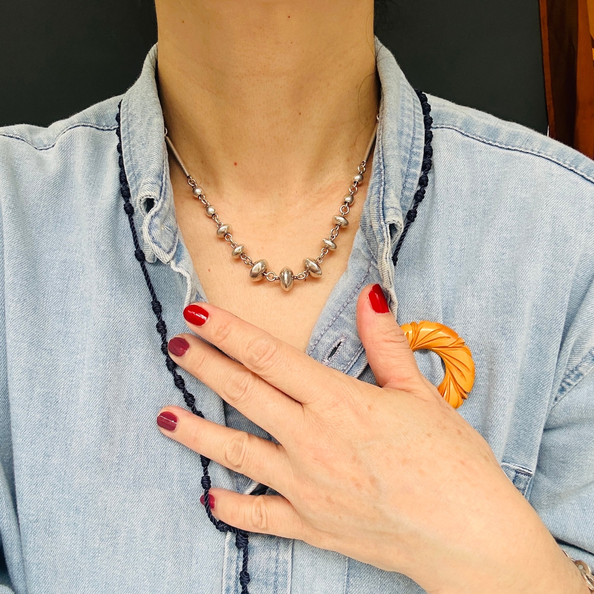 長さ2.4cmの丸筒バーと円盤型ビーズのリンクネックレス。入手当初、Tバーを通す輪が欠損していたので当店在庫のヴィンテージシルバーパーツでちょうどいい輪っかがあったので修理屋さんでつけてもらいました。違和感なくバッチリ仕上がりました。大人のネイティブ・アメリカン風デザイン。都会的でオシャレなネックレスです。刻印なしシルバーです。