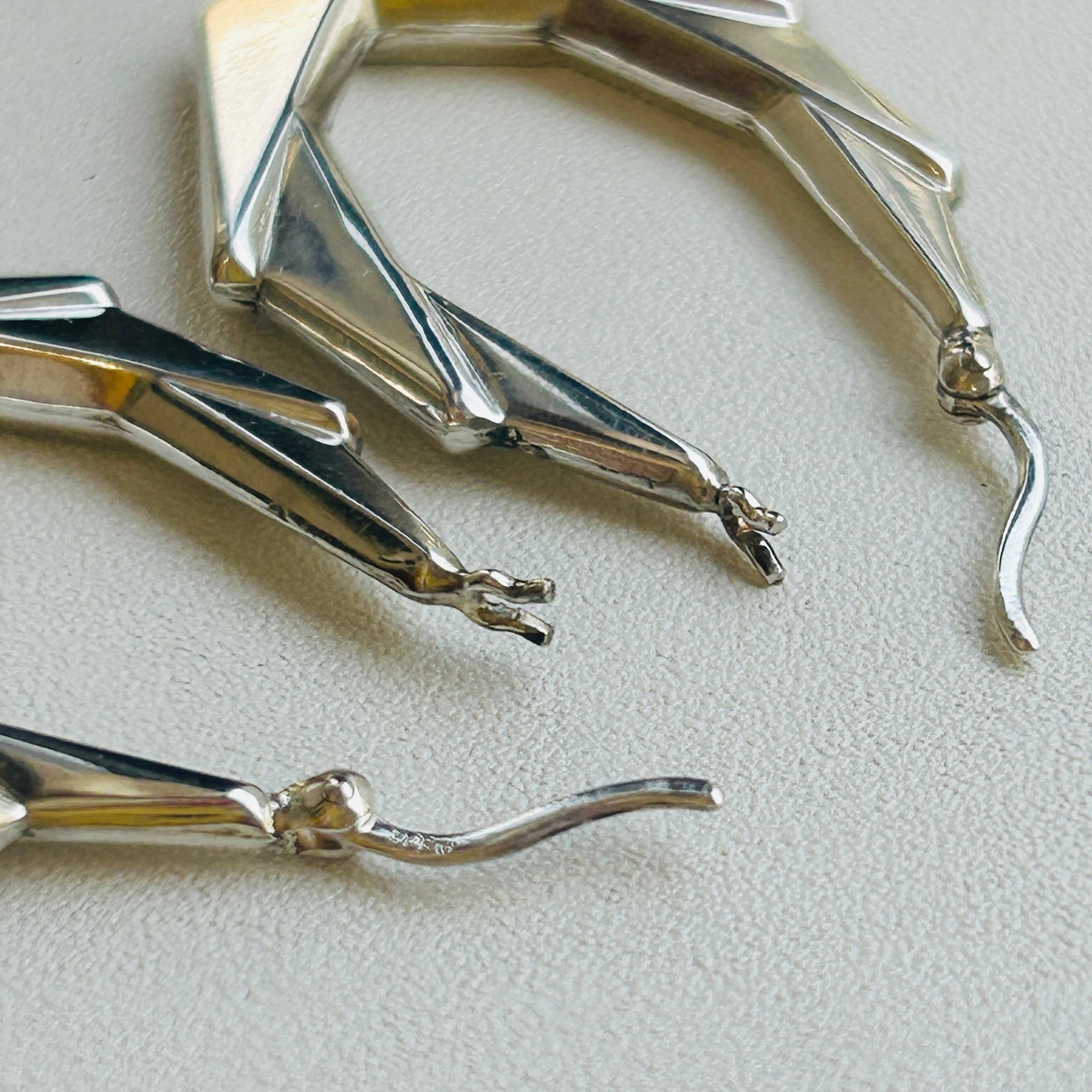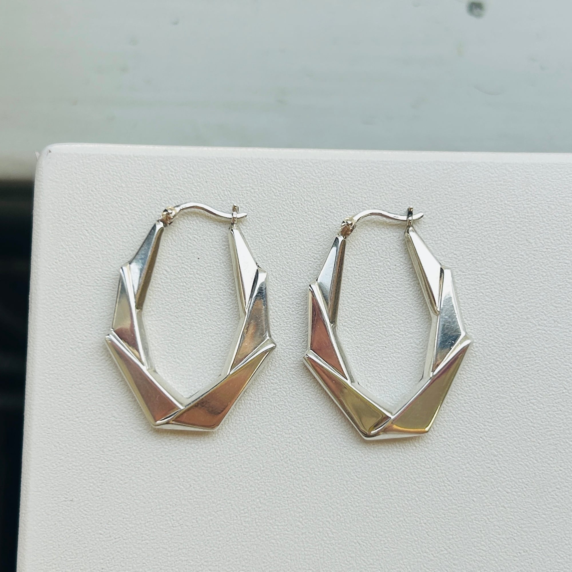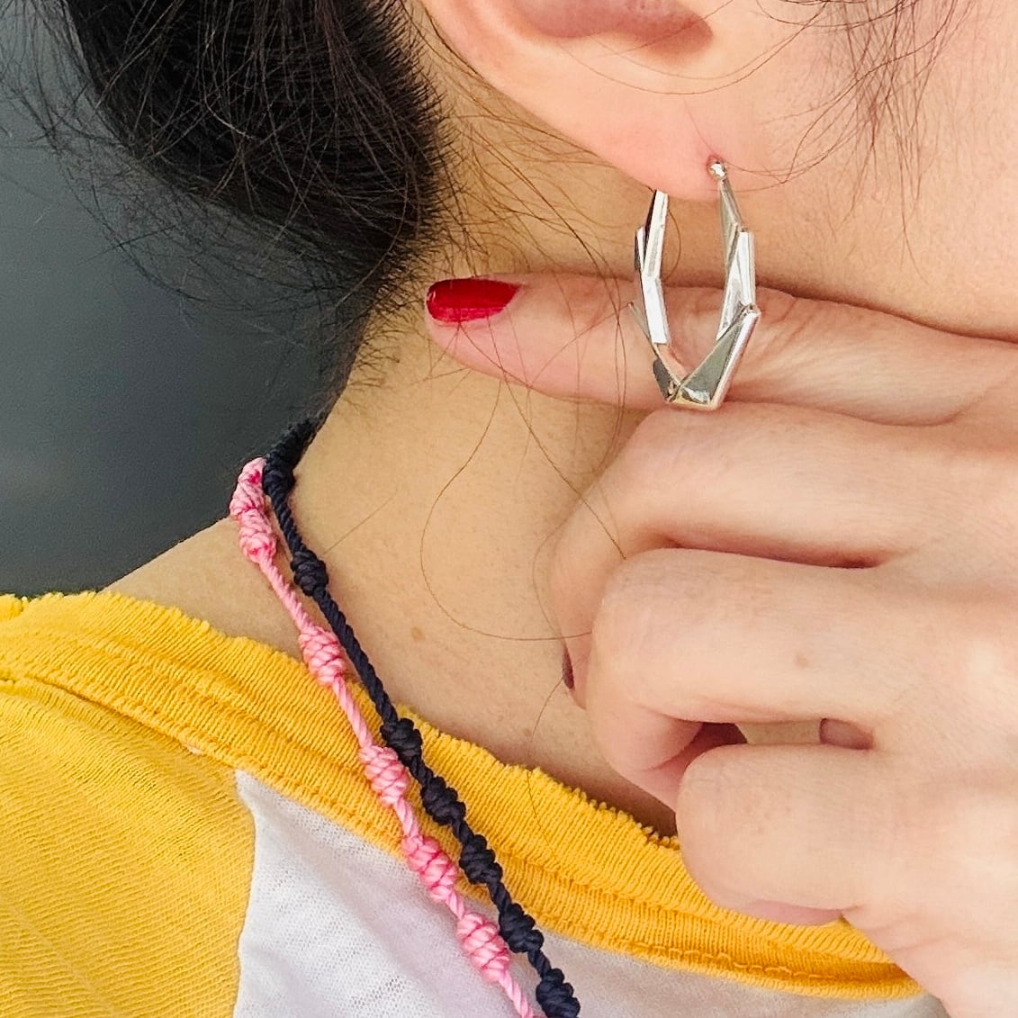 ユニークなデザインの楕円フープピアス。ツルっとした表面でツヤがあるシルバーです。フープの中は空洞になっています。針にメーカーマークと「925」刻印。針はしっかり二股に留まります。着け外しの際には片方の手でフープを、もう片方の手で針を上げたり下げたりすると金具が痛みにくいです。
