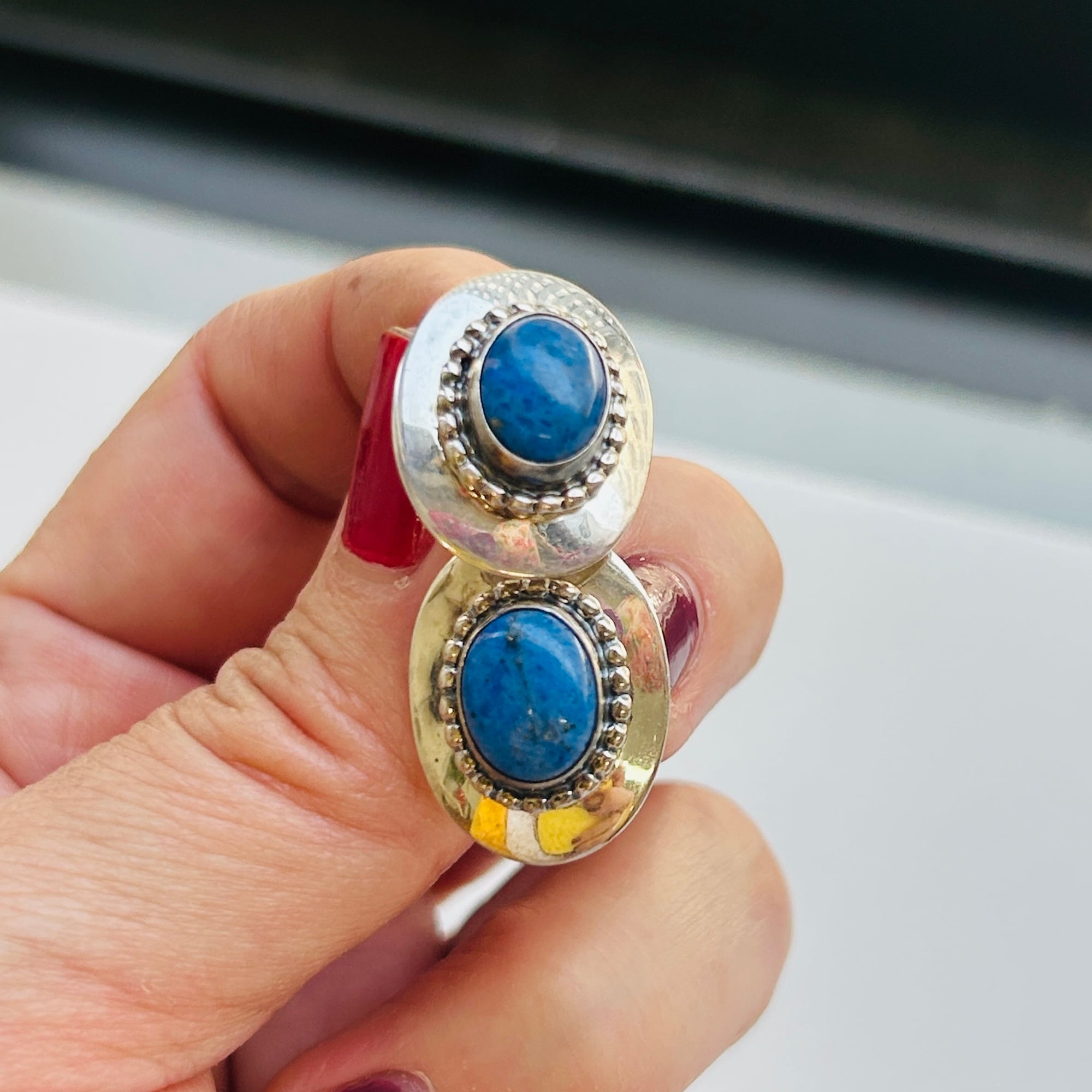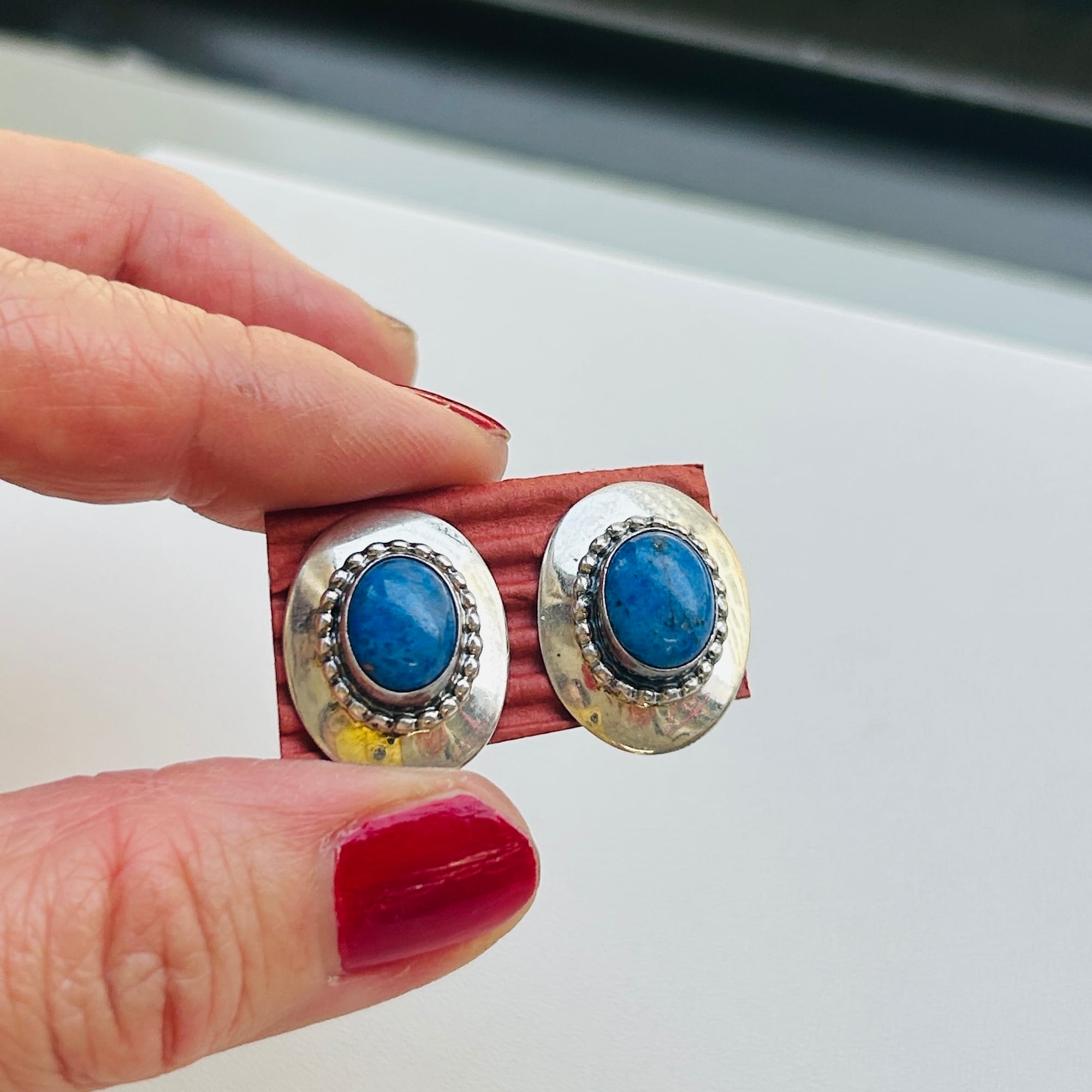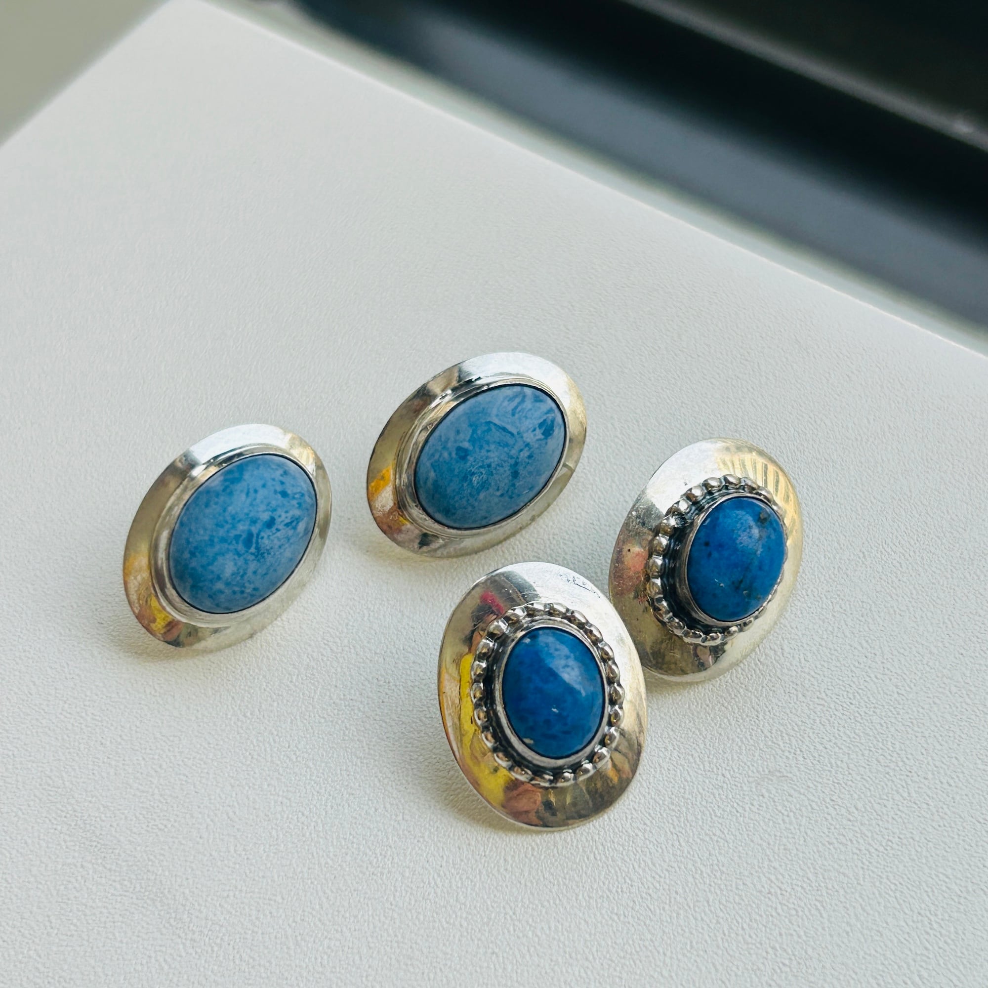 楕円シルバーにペブルフレームのソーダライトピアス。程よい大きさで大人っぽい石付きシルバーピアスです。カジュアルスタイルをちょっと格上げしてくれそうな爽やかデザイン:)キャッチが欠損していたのでシリコンキャッチをお付けしてお届け致します。裏にメーカーマークと「925」。