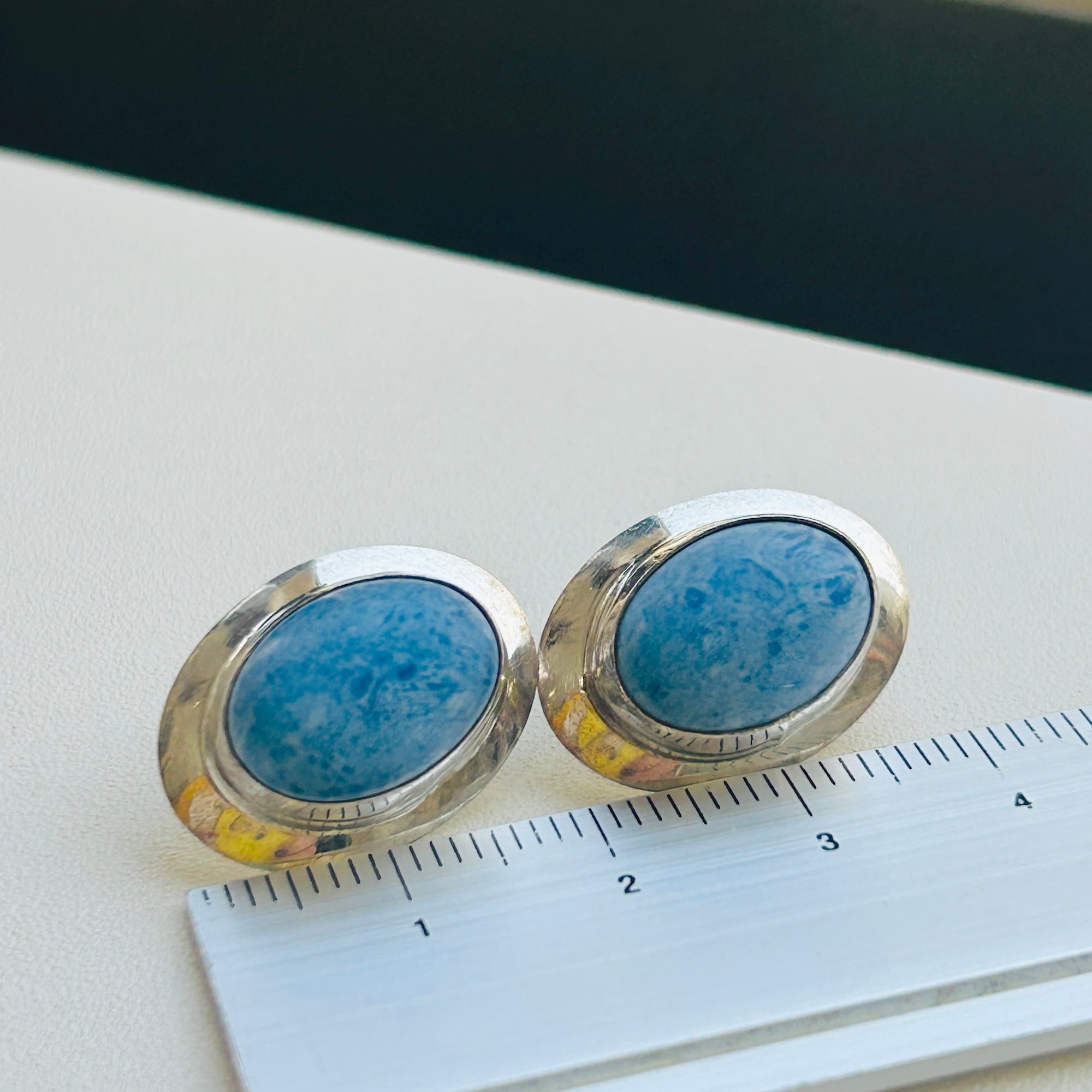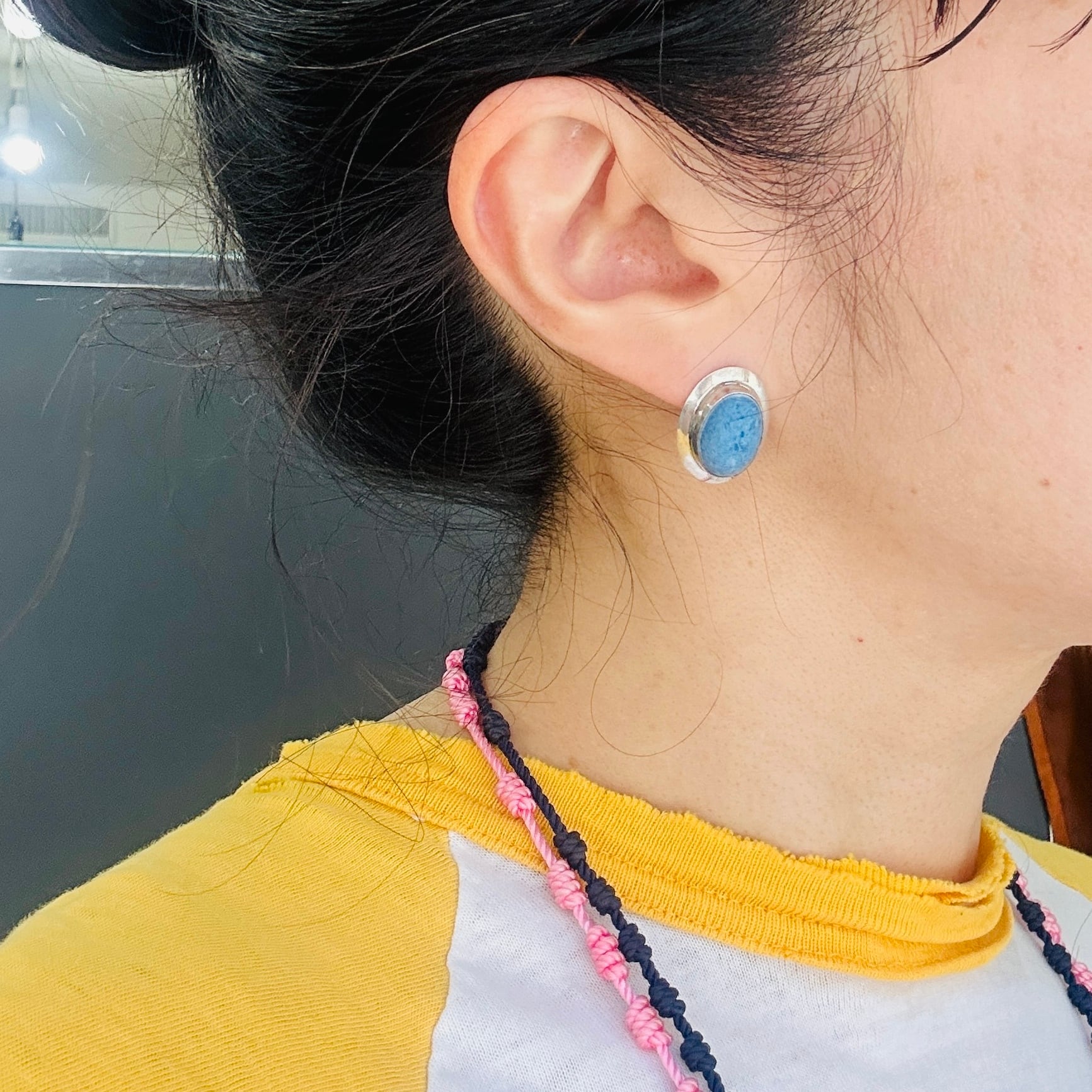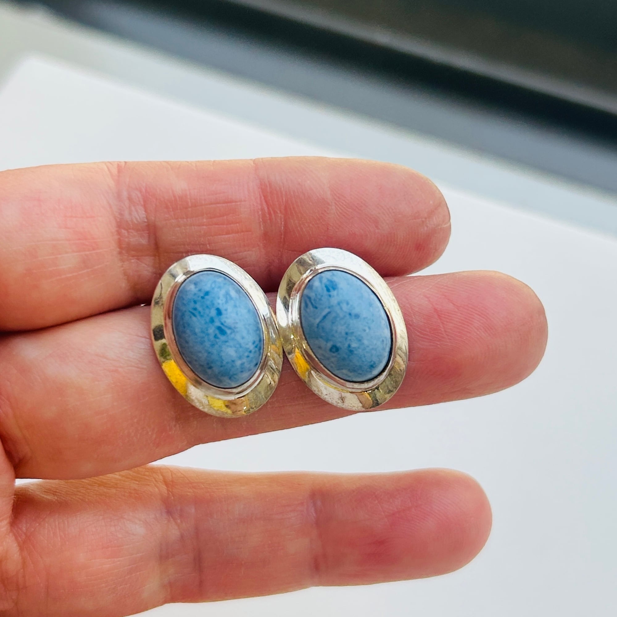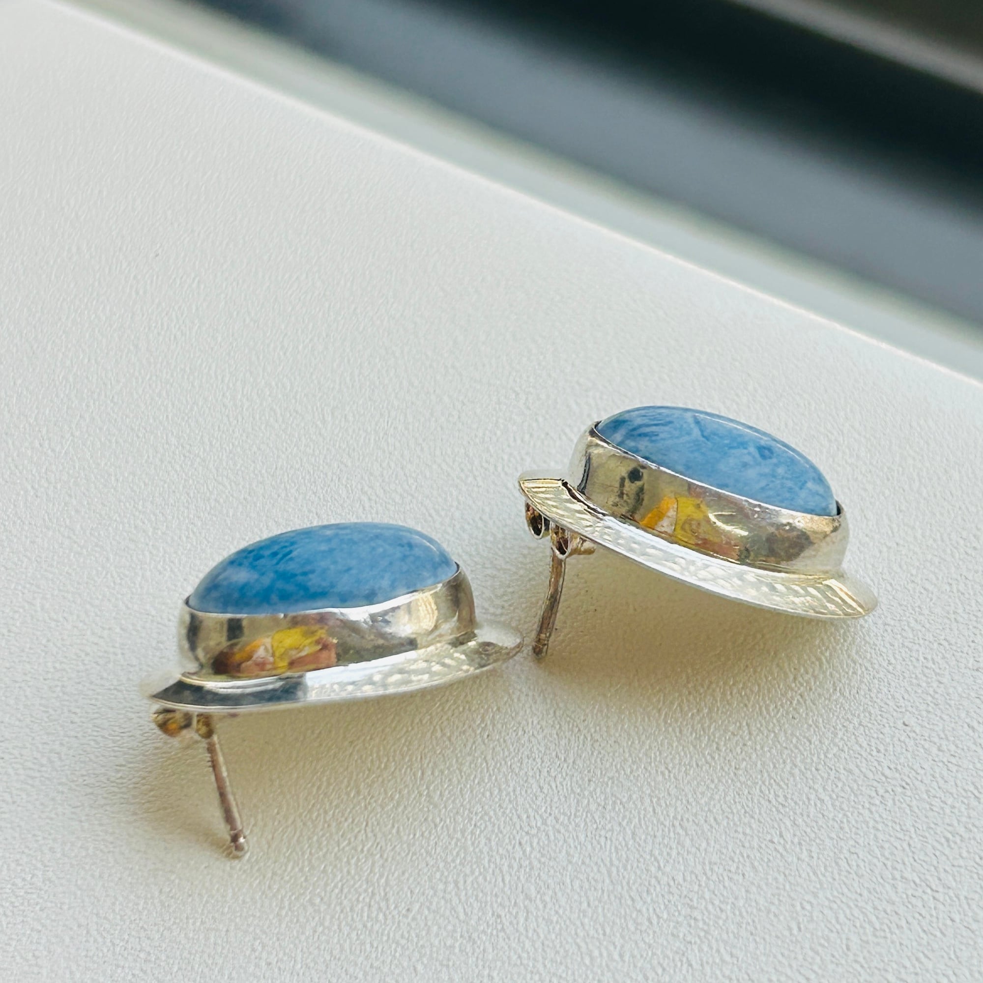 スカイブルーとシルバーの爽やかシンプルピアス。モダンなネイティブ・アメリカンジュエリーだと思います。シルバー部分はシャープな薄造り。針の位置はかなり上位にあるので耳たぶから垂れ下がるようについてくれます。「Sterling」刻印。