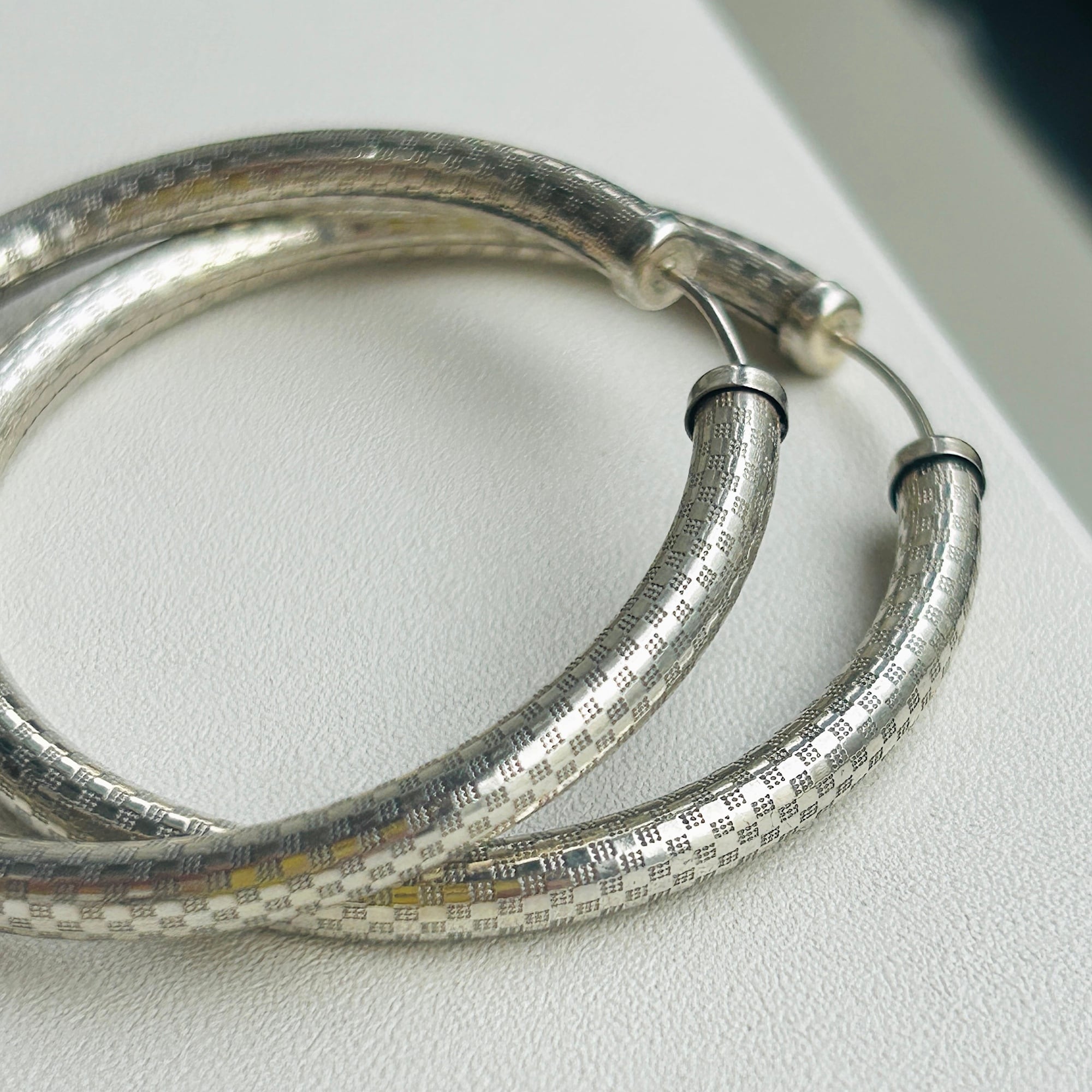 全面に模様が施された太めチューブフープ。キャッチのないフープです。針を後ろ側の穴に差し込みます。差し込むというより引っ掛ける程度です。元々穴にハマった状態で記憶されているので耳に通してから穴さがしに苦労することはありません。引っ掛ける程度で頼りなく感じますが少々引っ張っても外れないですしフープの輪を広げない限り取れないので問題ありません。フープは正面から見て両サイドに広げて下さい。軽い着け心地でボリューム大なピアスです:)
