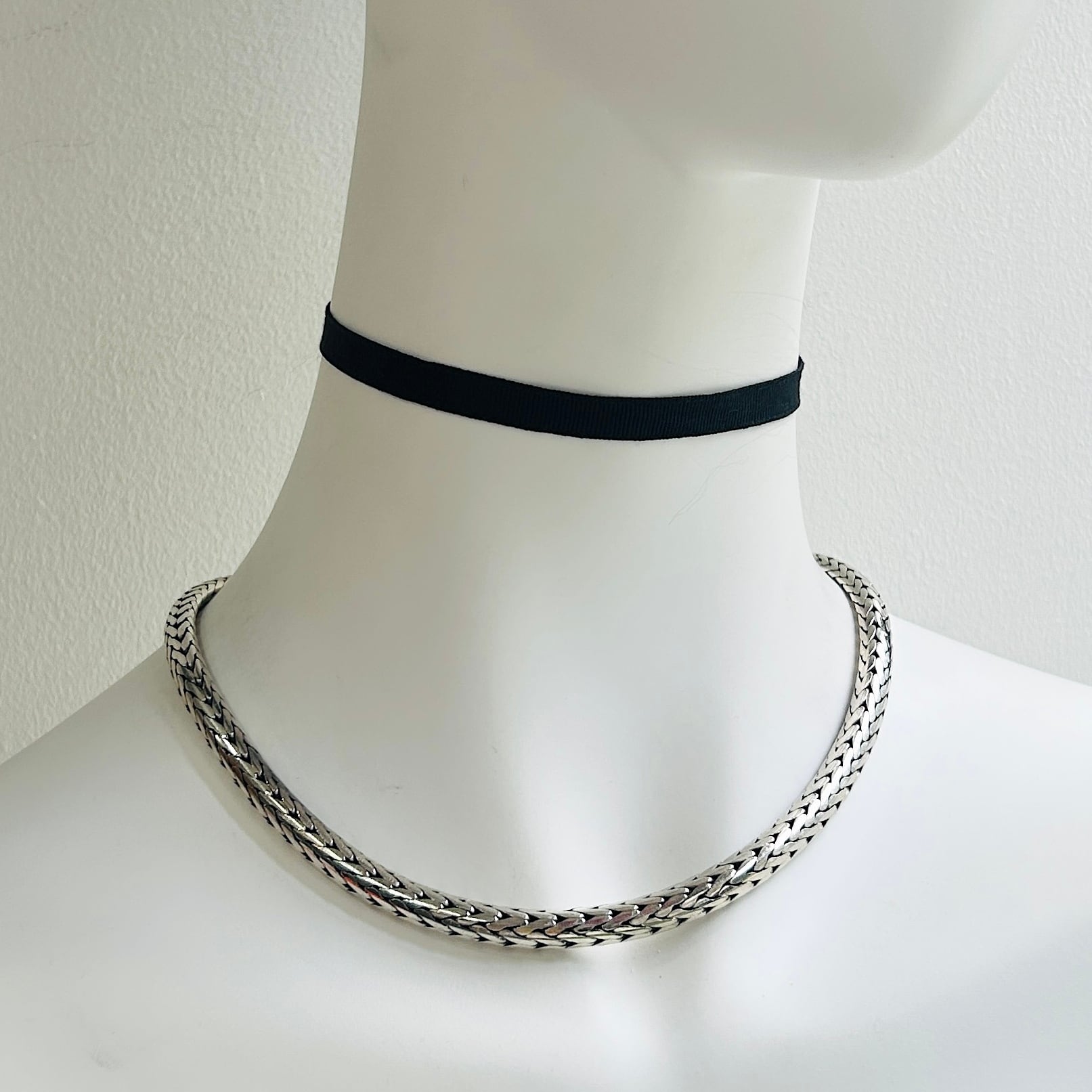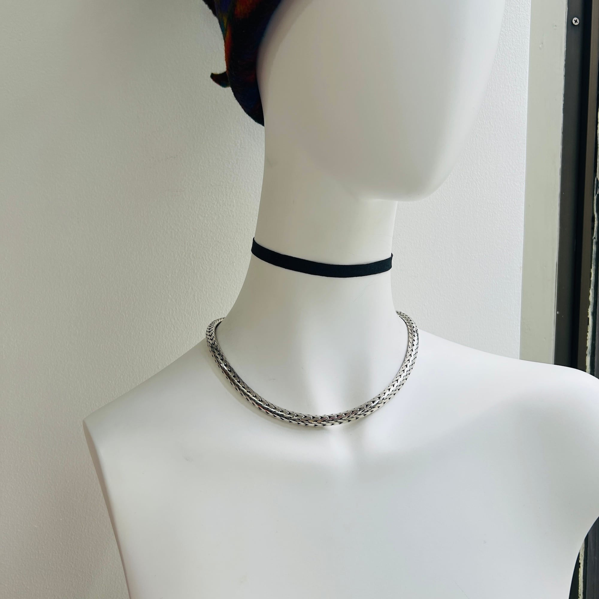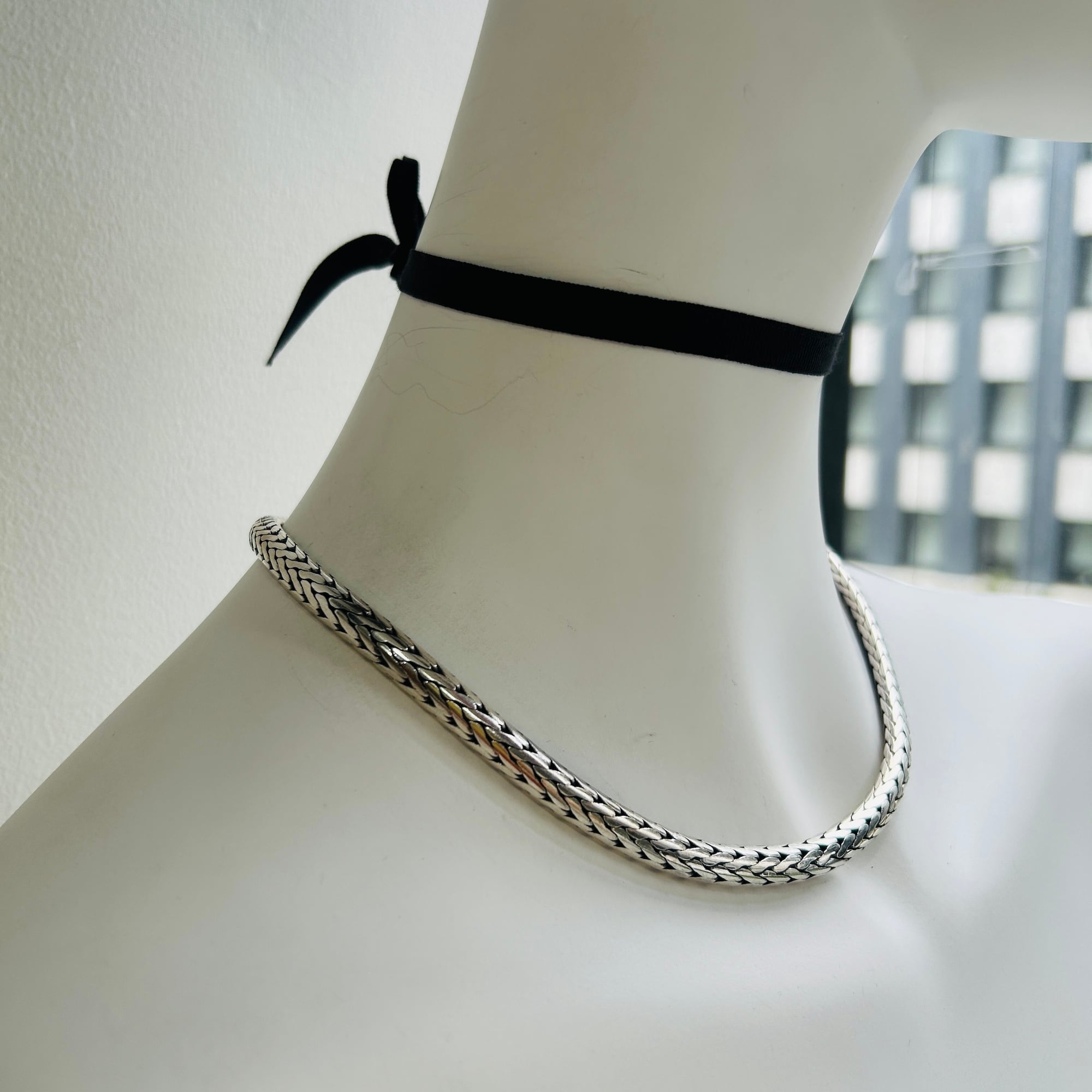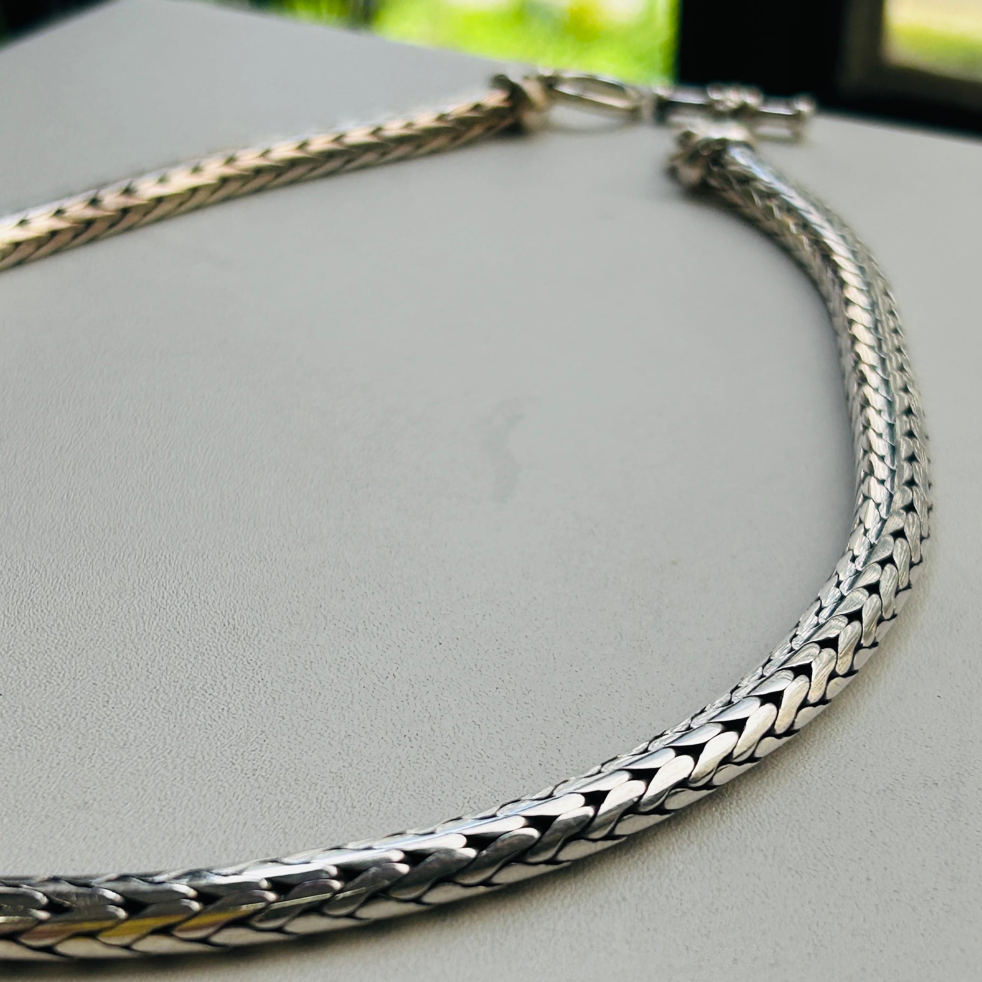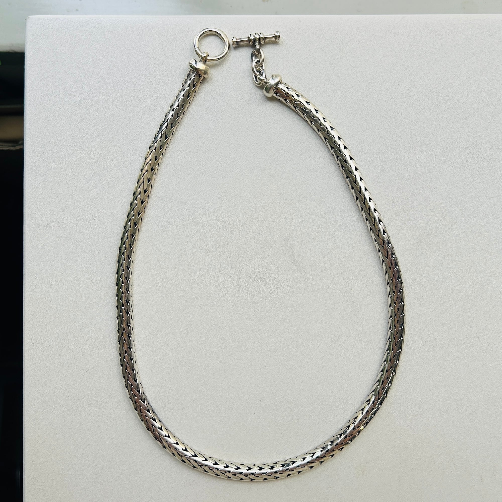 ズシっとヘビーなネックレス。細かいコマが沢山詰まった綱のようなチェーン。エキゾチックでクールです!強度が高く、柔軟性は通常のチェーンほどありません。チェーンの形は底面はフラット、表面は丸い山型になっています。男性でしたら首の付け根あたりにくるチョーカーサイズかと思います。Tバーと輪っかに通すトグル金具。金具を正面に着けてもユニークです。また輪っかにチャームを着けるのもオリジナリティが出てGOODアイデア。輪に「BA」「925」。