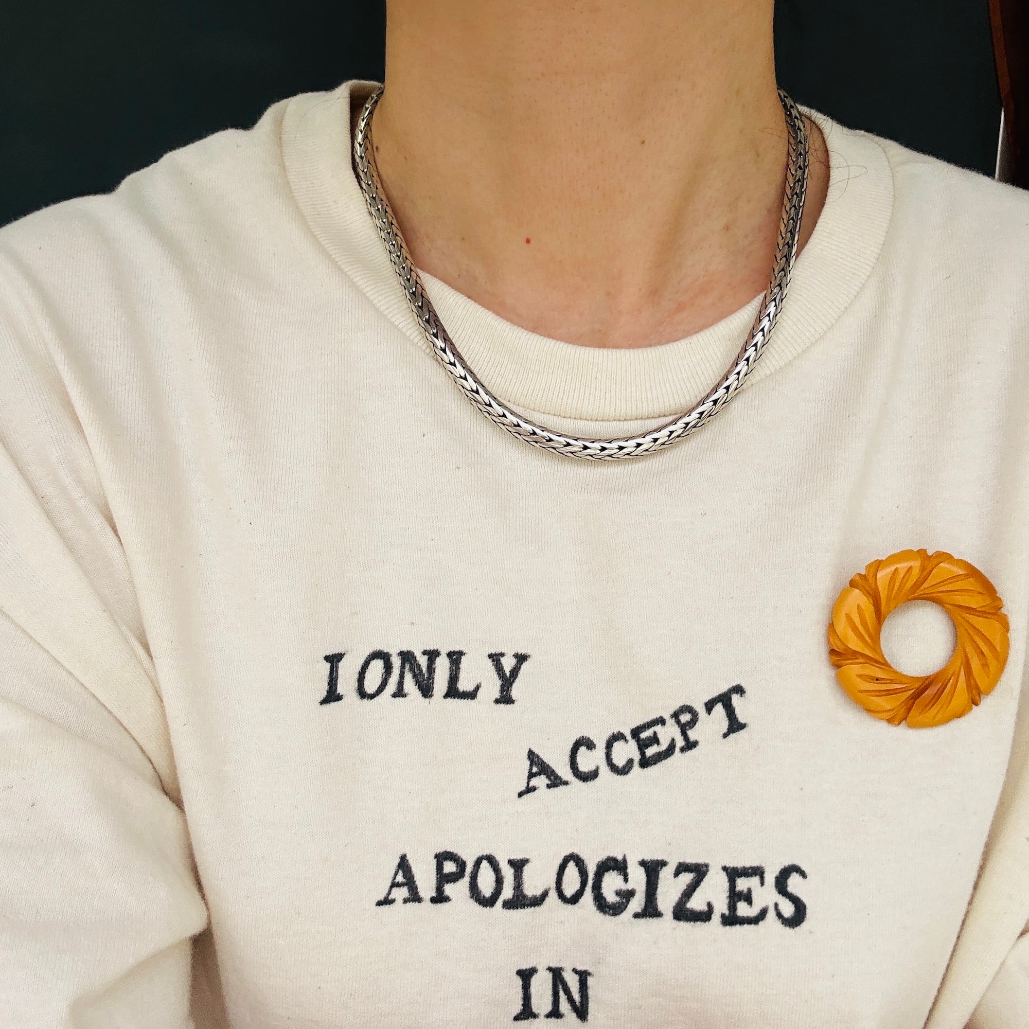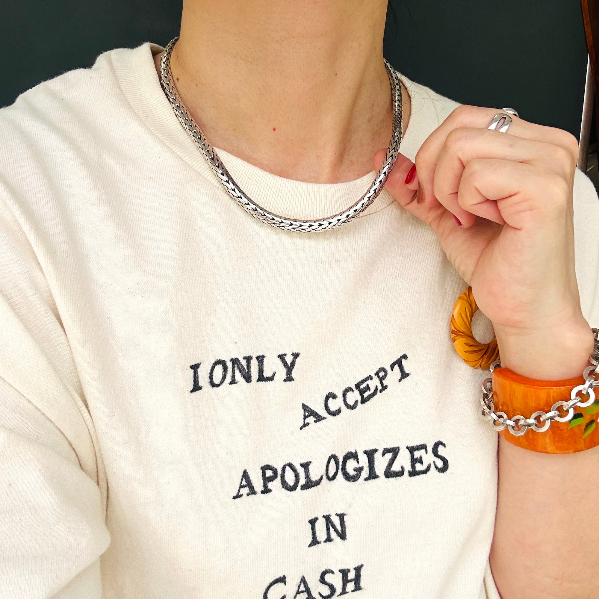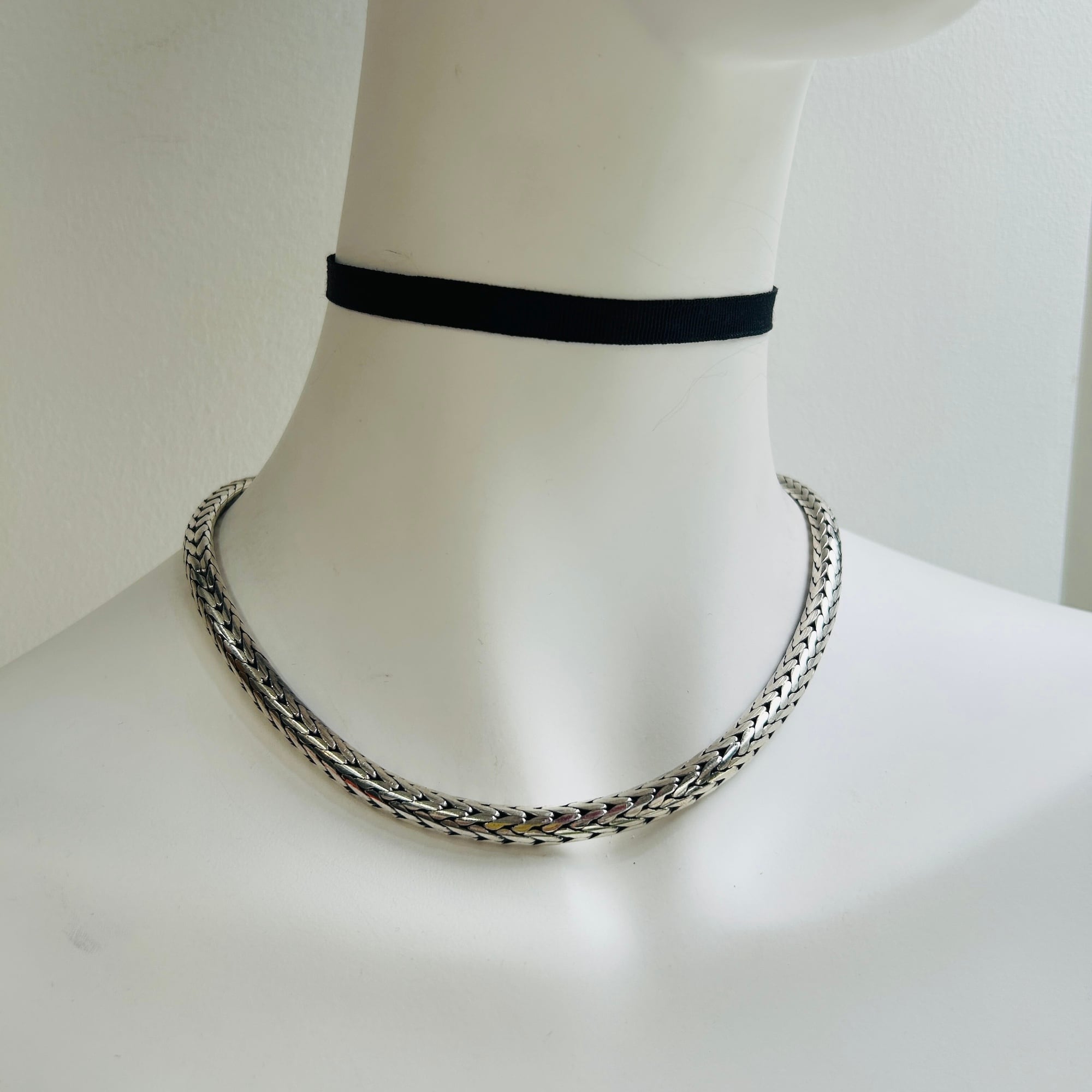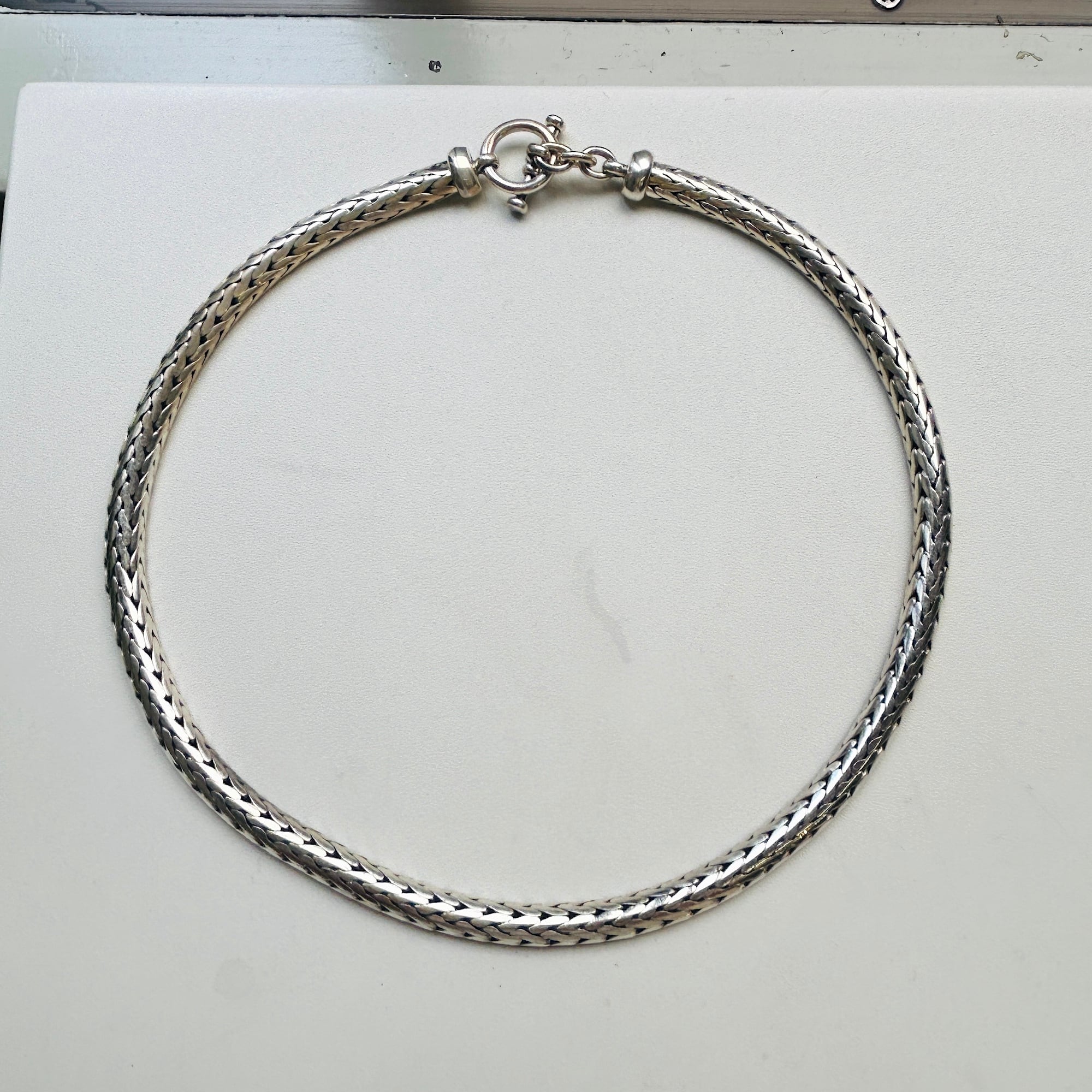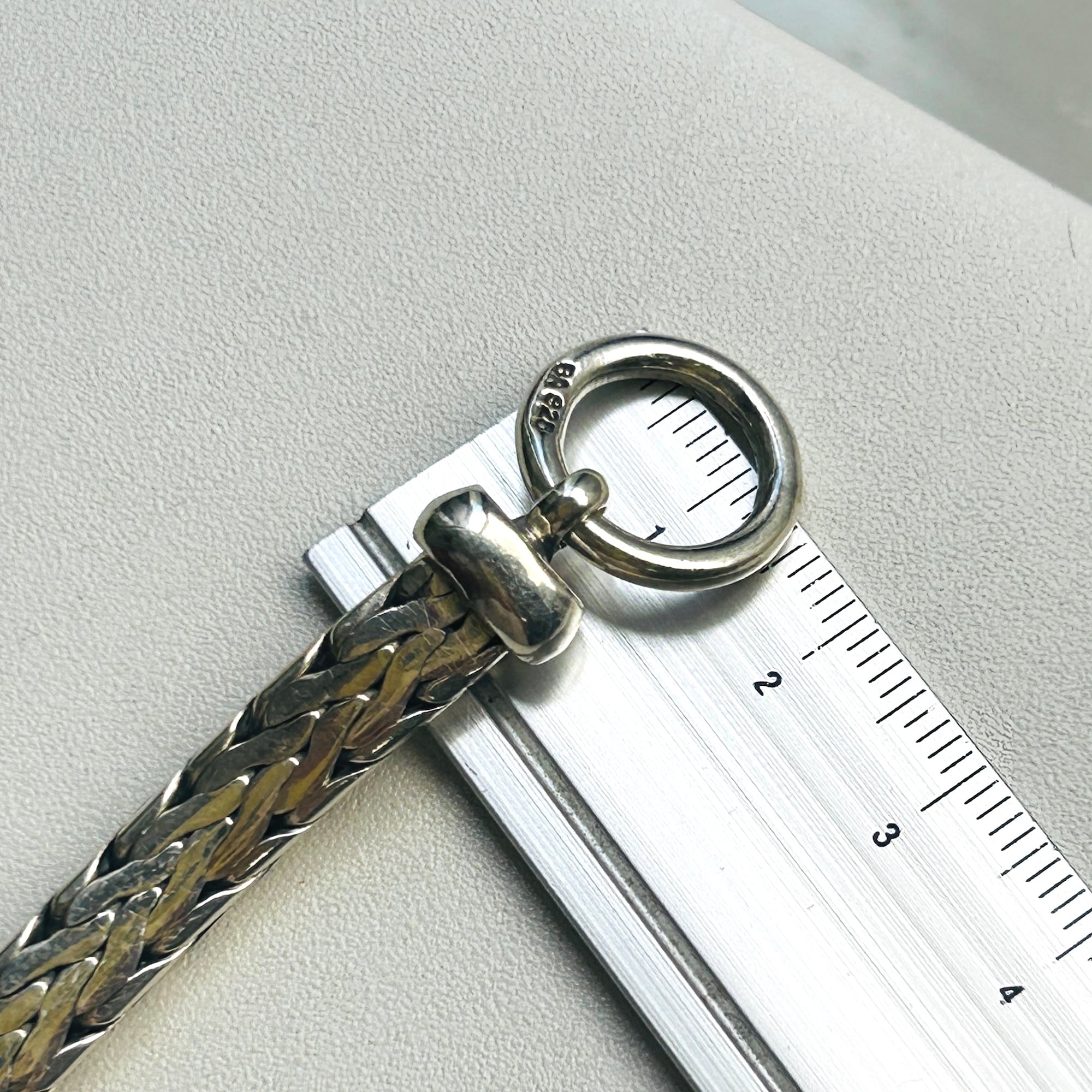 ズシっとヘビーなネックレス。細かいコマが沢山詰まった綱のようなチェーン。エキゾチックでクールです!強度が高く、柔軟性は通常のチェーンほどありません。チェーンの形は底面はフラット、表面は丸い山型になっています。男性でしたら首の付け根あたりにくるチョーカーサイズかと思います。Tバーと輪っかに通すトグル金具。金具を正面に着けてもユニークです。また輪っかにチャームを着けるのもオリジナリティが出てGOODアイデア。輪に「BA」「925」。