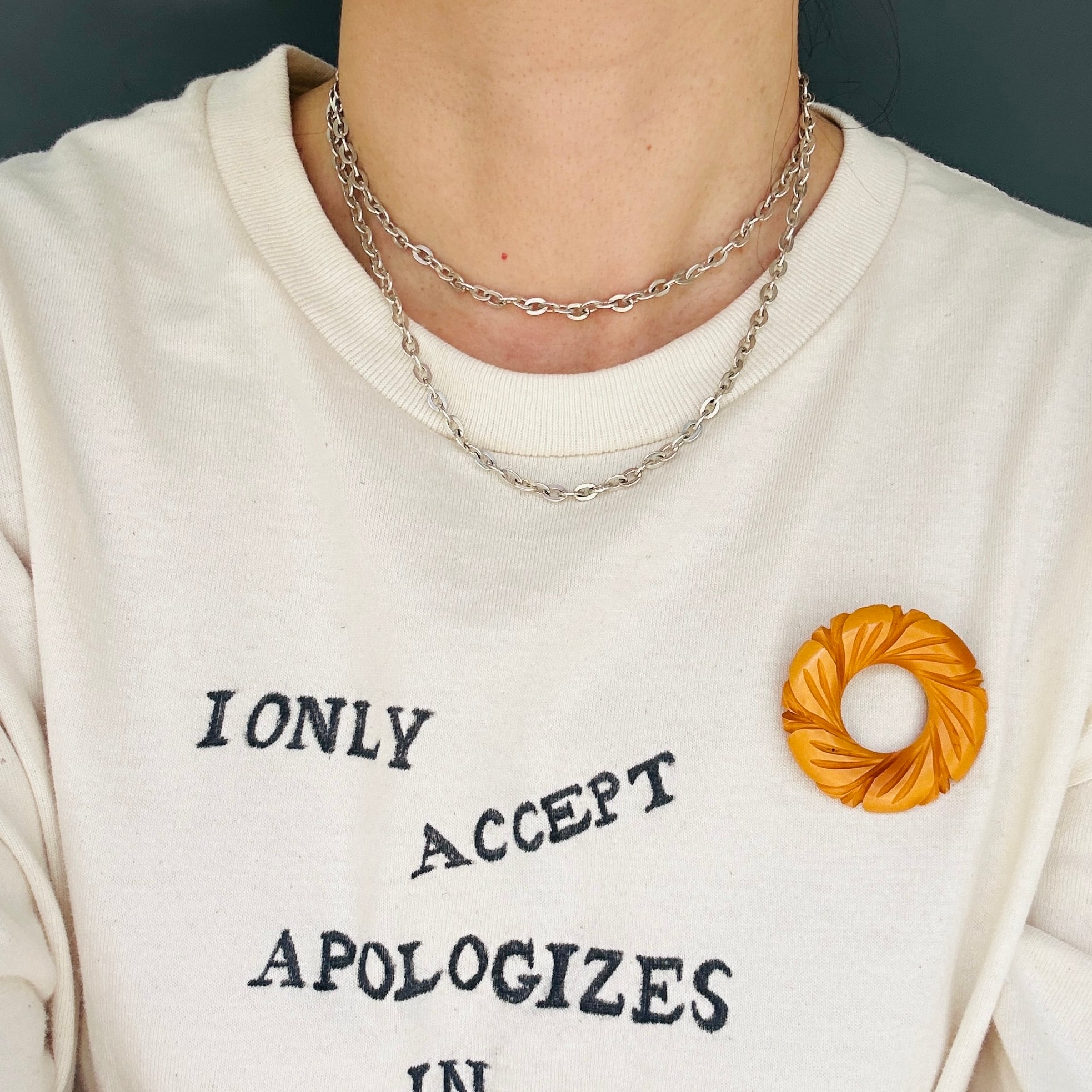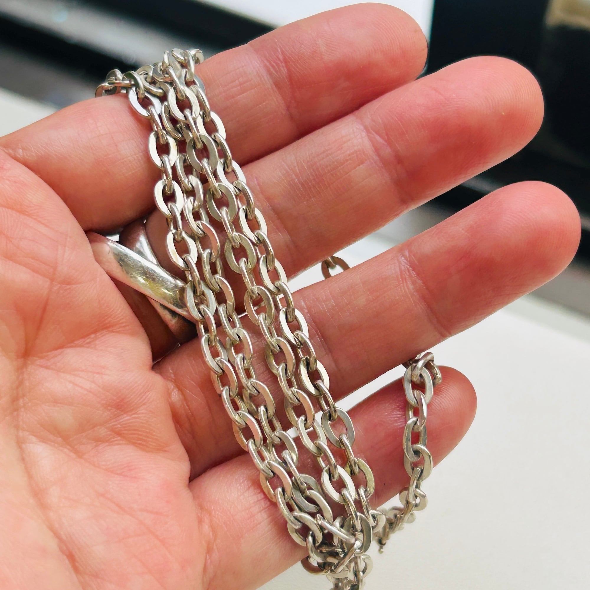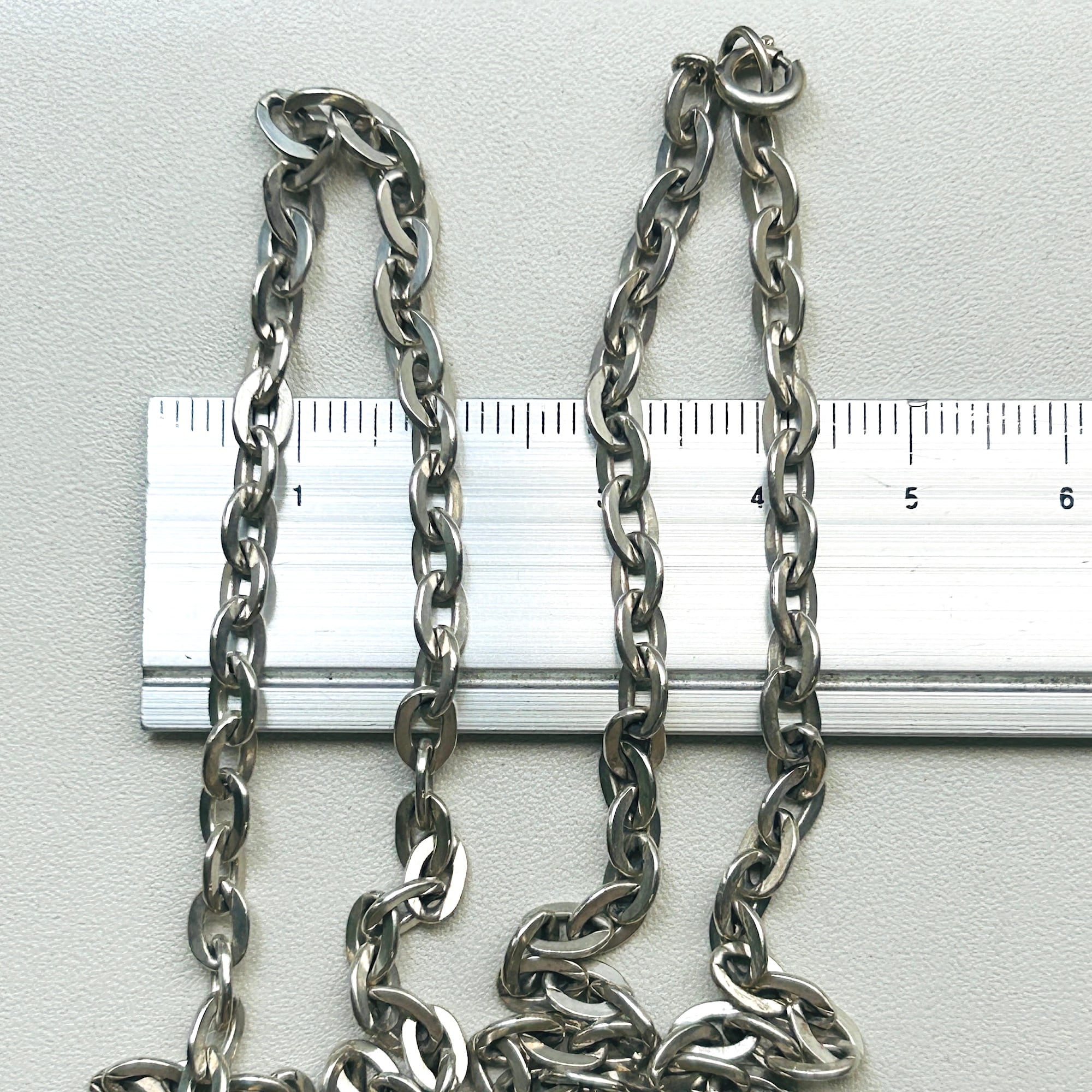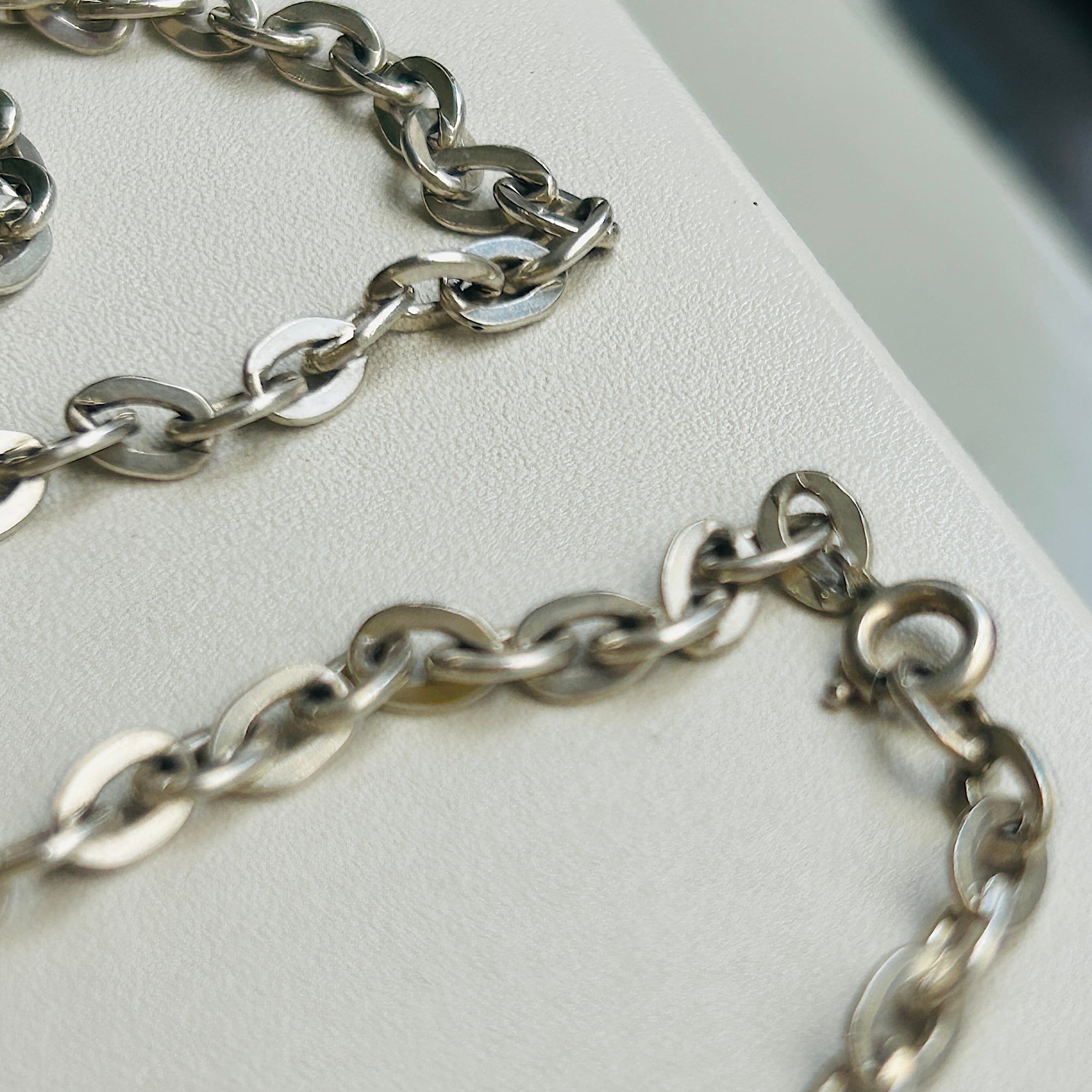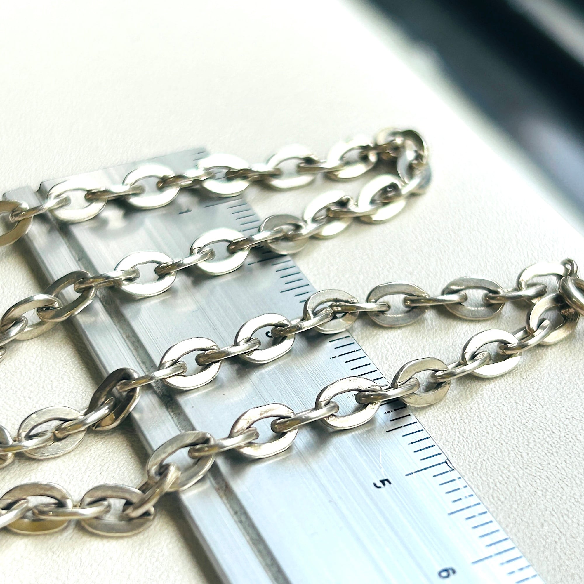 長さ80cm、個性的なアズキチェーンネックレス。セミマットでヴィンテージの風合いあふれるチェーンです。アズキチェーンは楕円コマが交互に連結したベーシックなデザインです。こちらのチェーンはコマの形が少し変わっています。コマのサイズ自体も少し大きく、フラットな楕円型。楕円のアウトラインが太いので存在感あります。フラットなコマなので普通サイズの引き輪ですが、どの位置にでも引っ掛けることが可能です。ロングチェーンは二重巻きで着用できるのも魅力です。引き輪を引っ掛ける反対の楕円型エンドはきちんとコマにロウ付けされています。「835」刻印。ドイツのチェーンです。