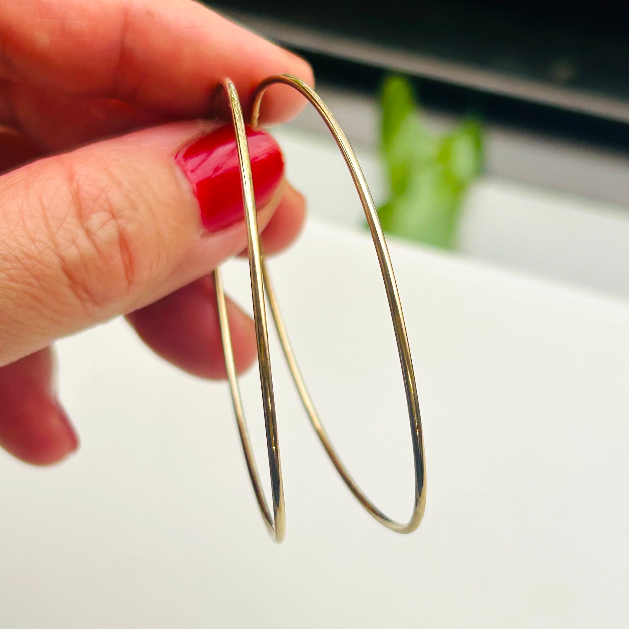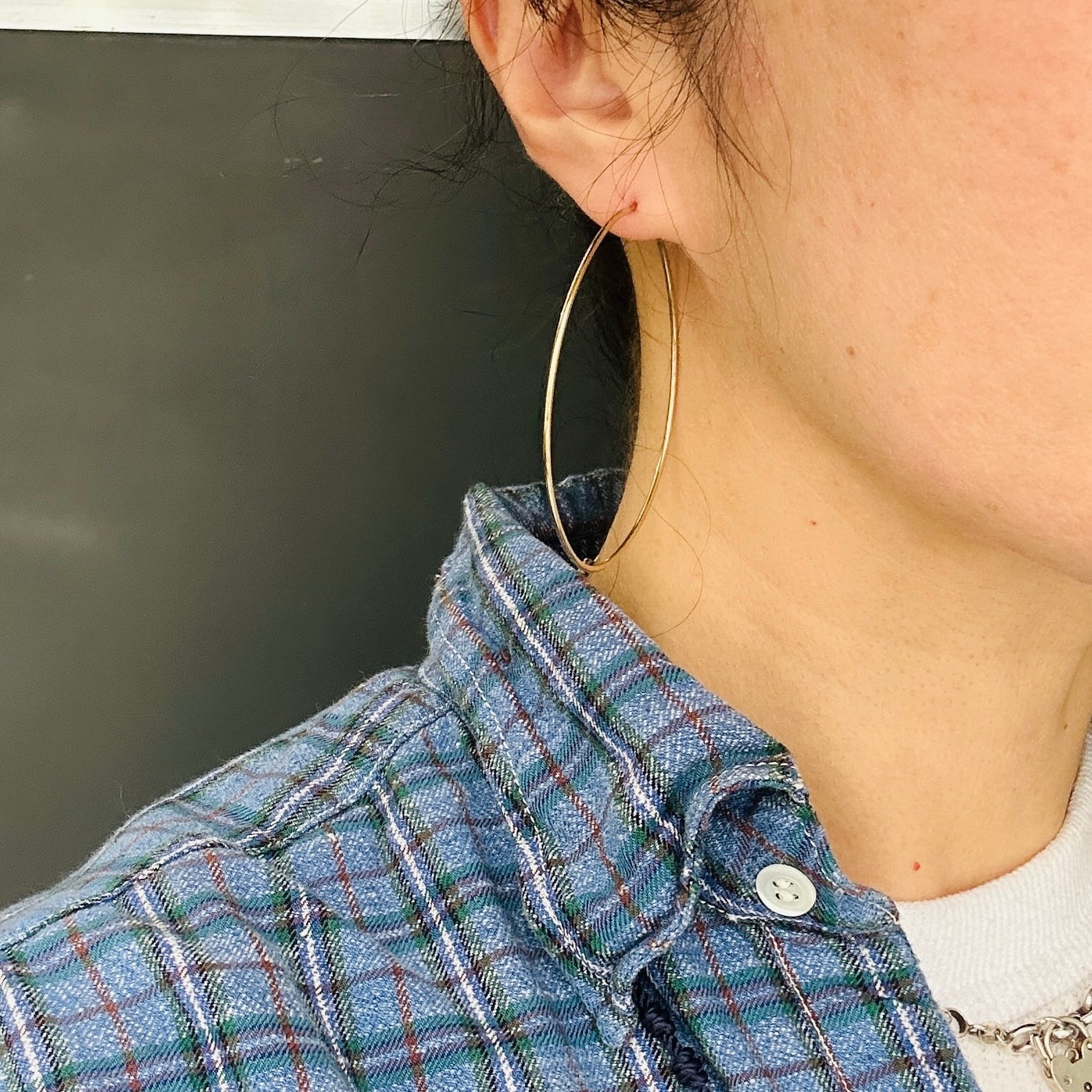 長さ6cm、楕円ゴールドフープ。細めで大きなカタチがHipです:)褐色気味のゴールドで明るい「金色」というより真鍮に近いトーンです。針を穴に通して装着完了ですがシリコンキャッチもお付けしてお届けします。針に「ITALY925」とメーカー名。