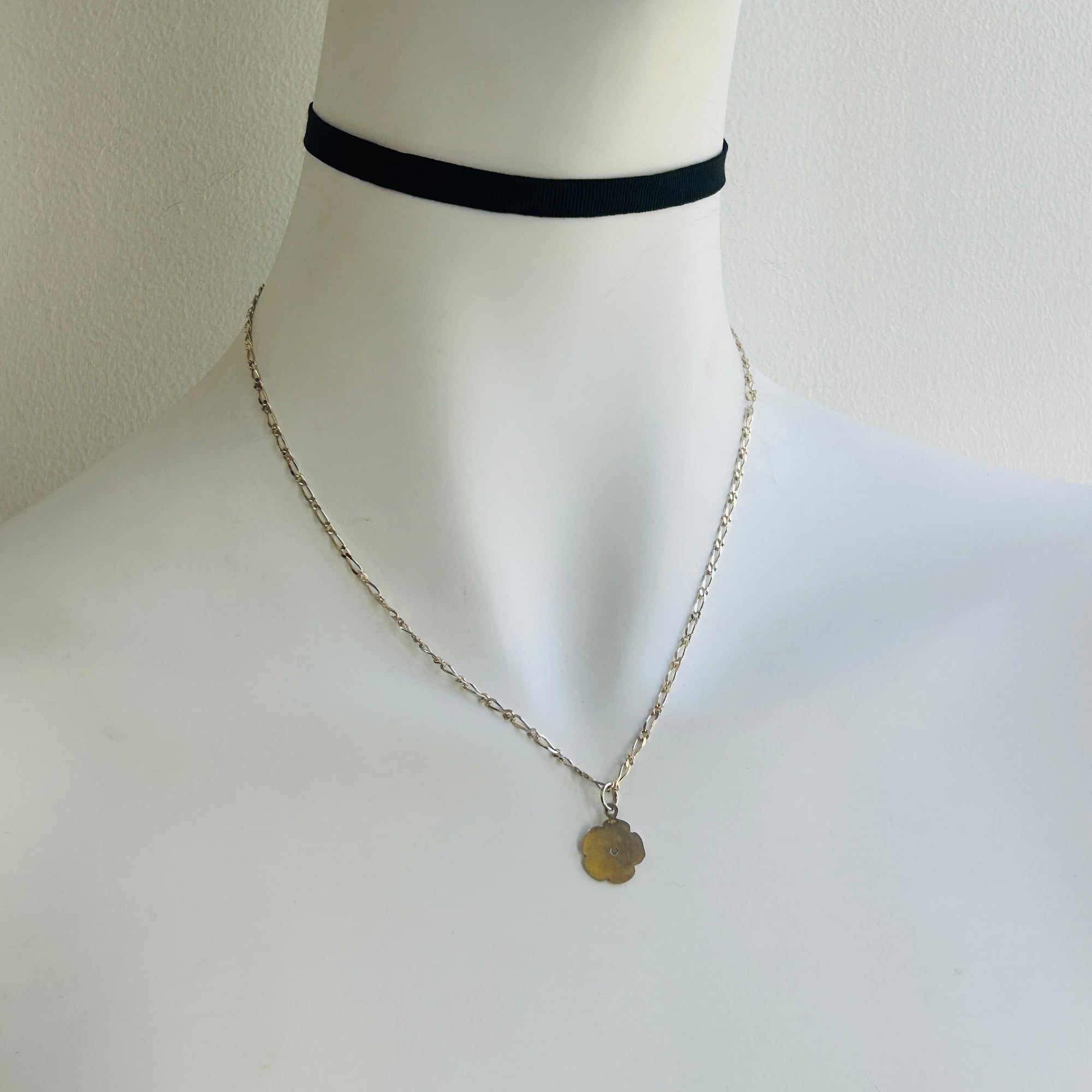 フランスから届いたシルバーチェーン。長短コマ1:1で連結したフィガロチェーンです。シャープでキラキラした輝きが首周りを華やかに演出。フェミニンで優雅なチェーンです。引き輪を長コマに引っ掛けて短く着用も可能です。フランスメーカーマーク。
