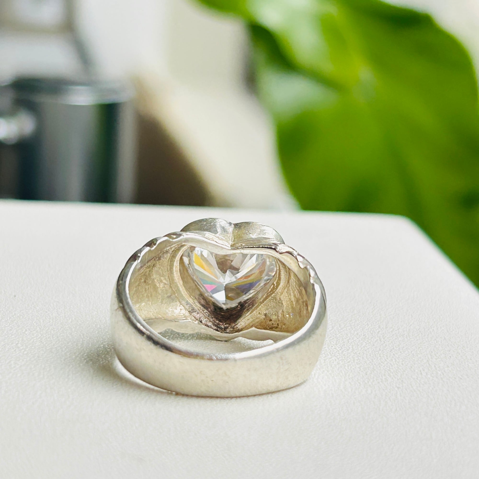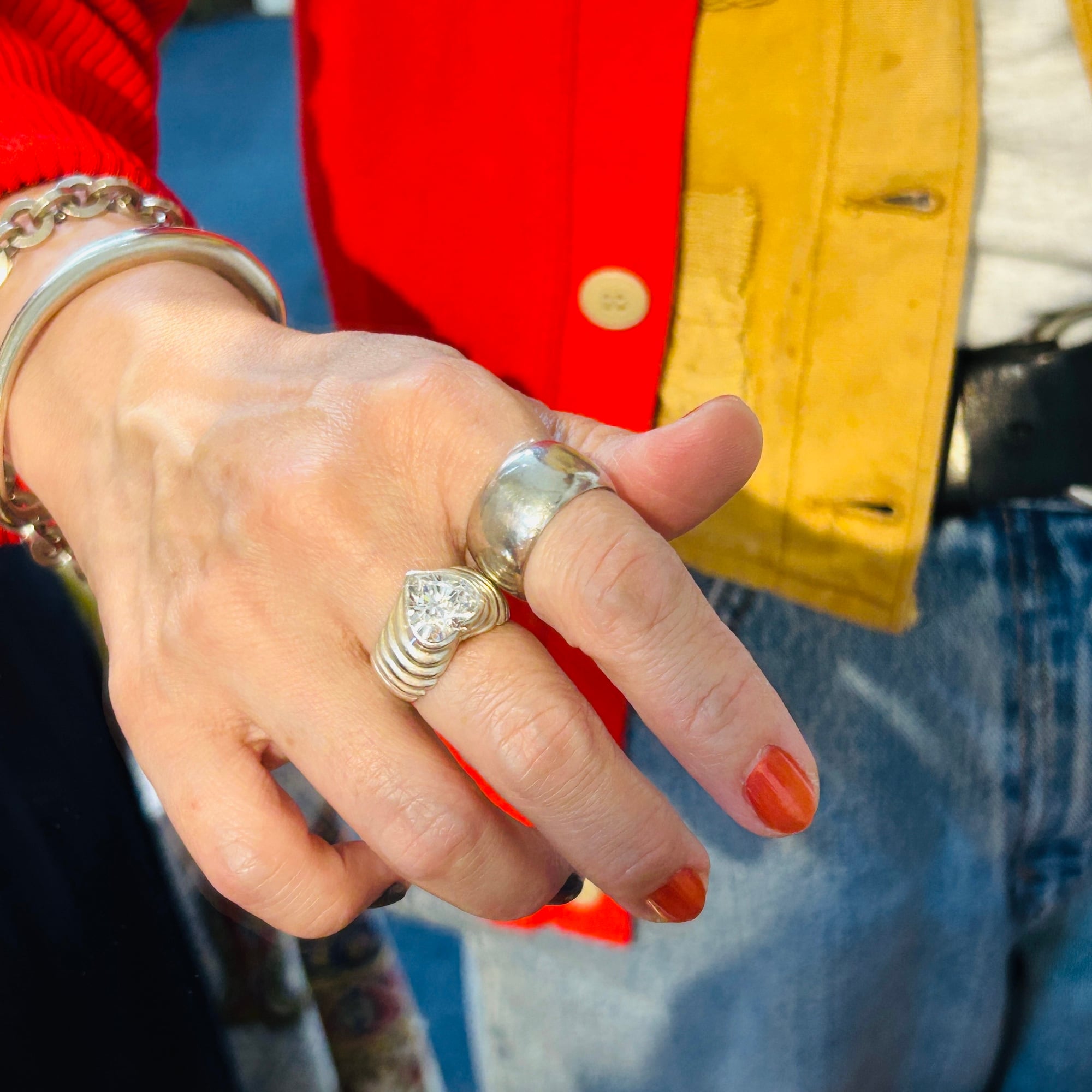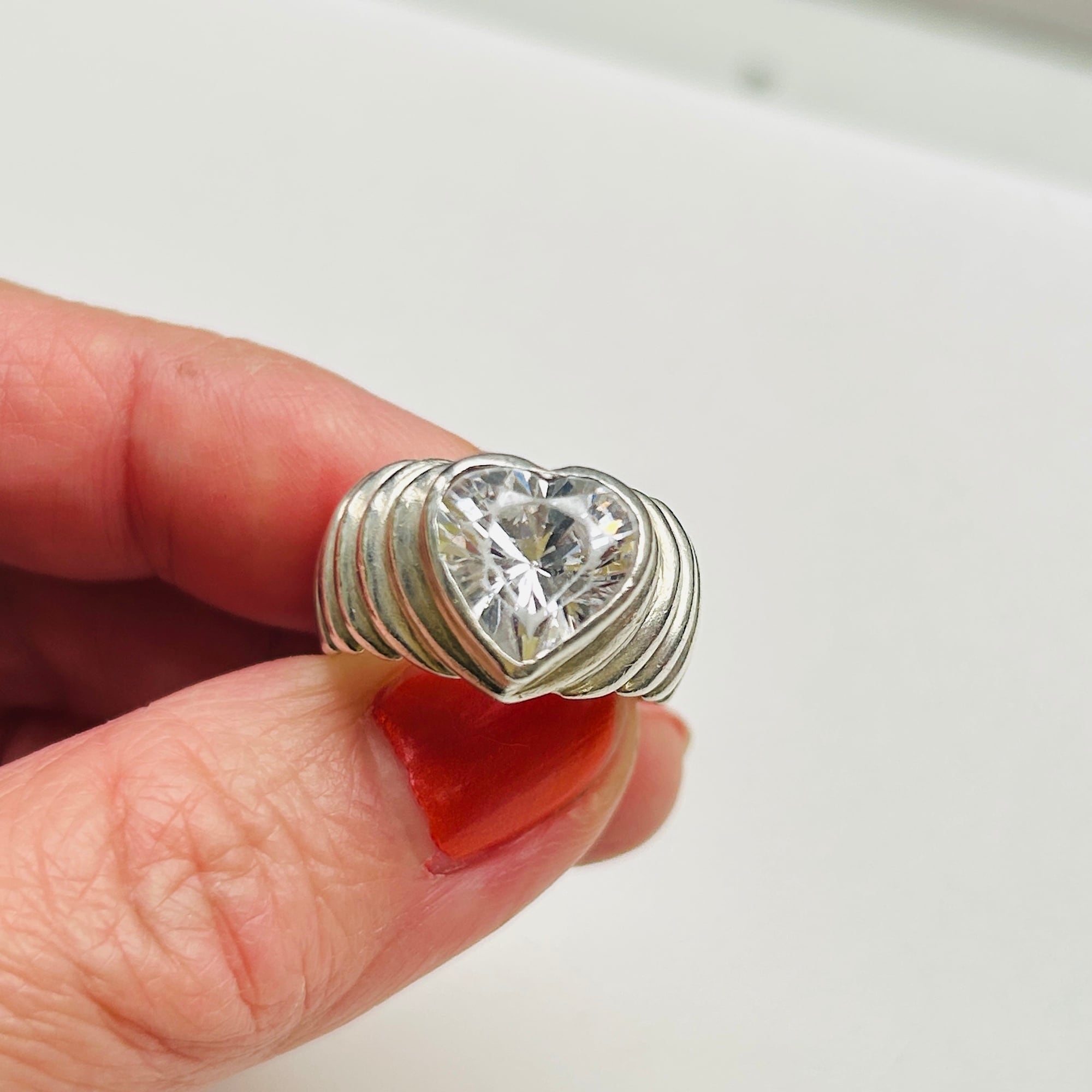 クリアハートのボリュームリング。オモチャっぽくてキュートなデザイン。ステージ状に高く盛り上がったデザイン。手元コーデの主役になるリングです。ハートのトップはスレがあります。肉眼では気になりません。「STERLING」刻印。サイズ棒で11.5号。私は12号中指、14号人差し指の両方に着用できます。