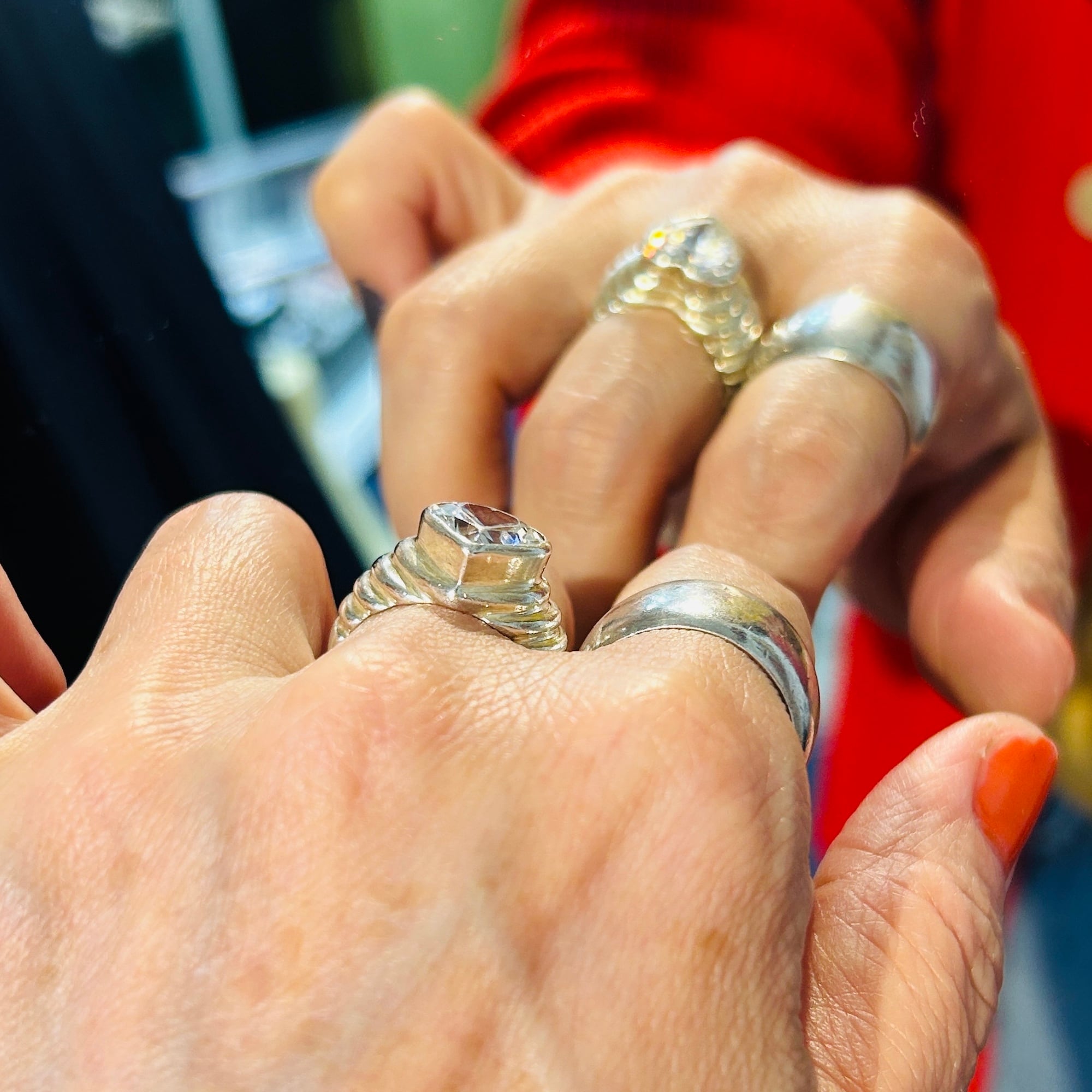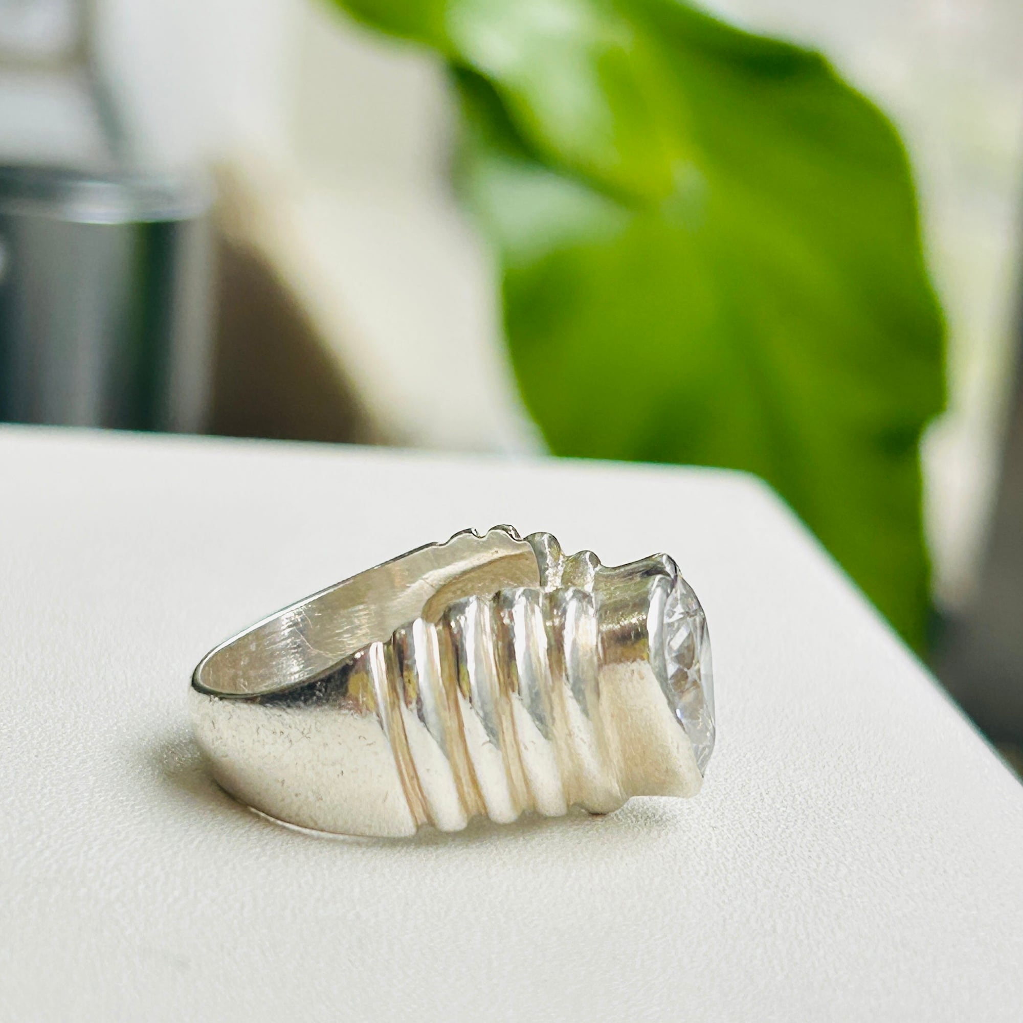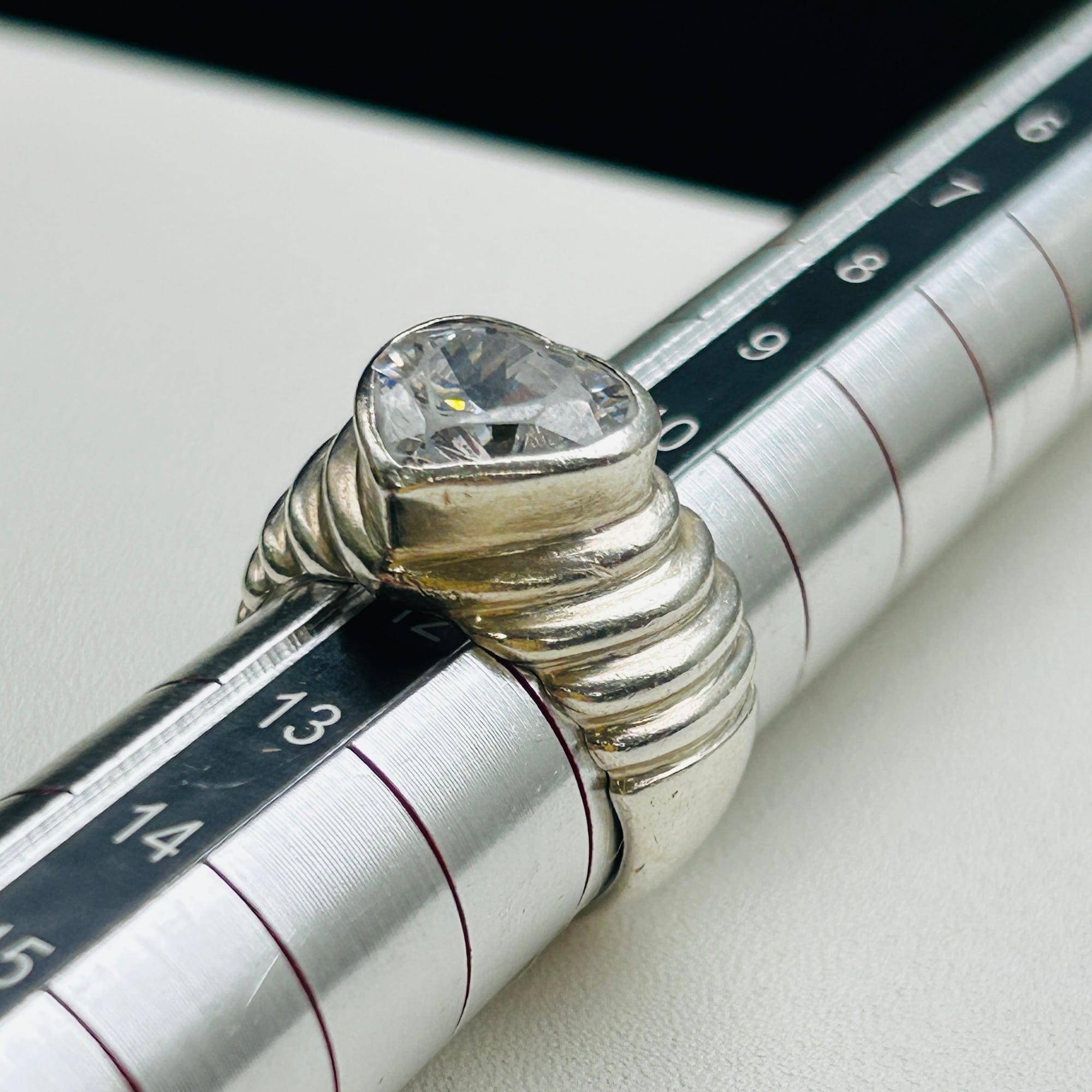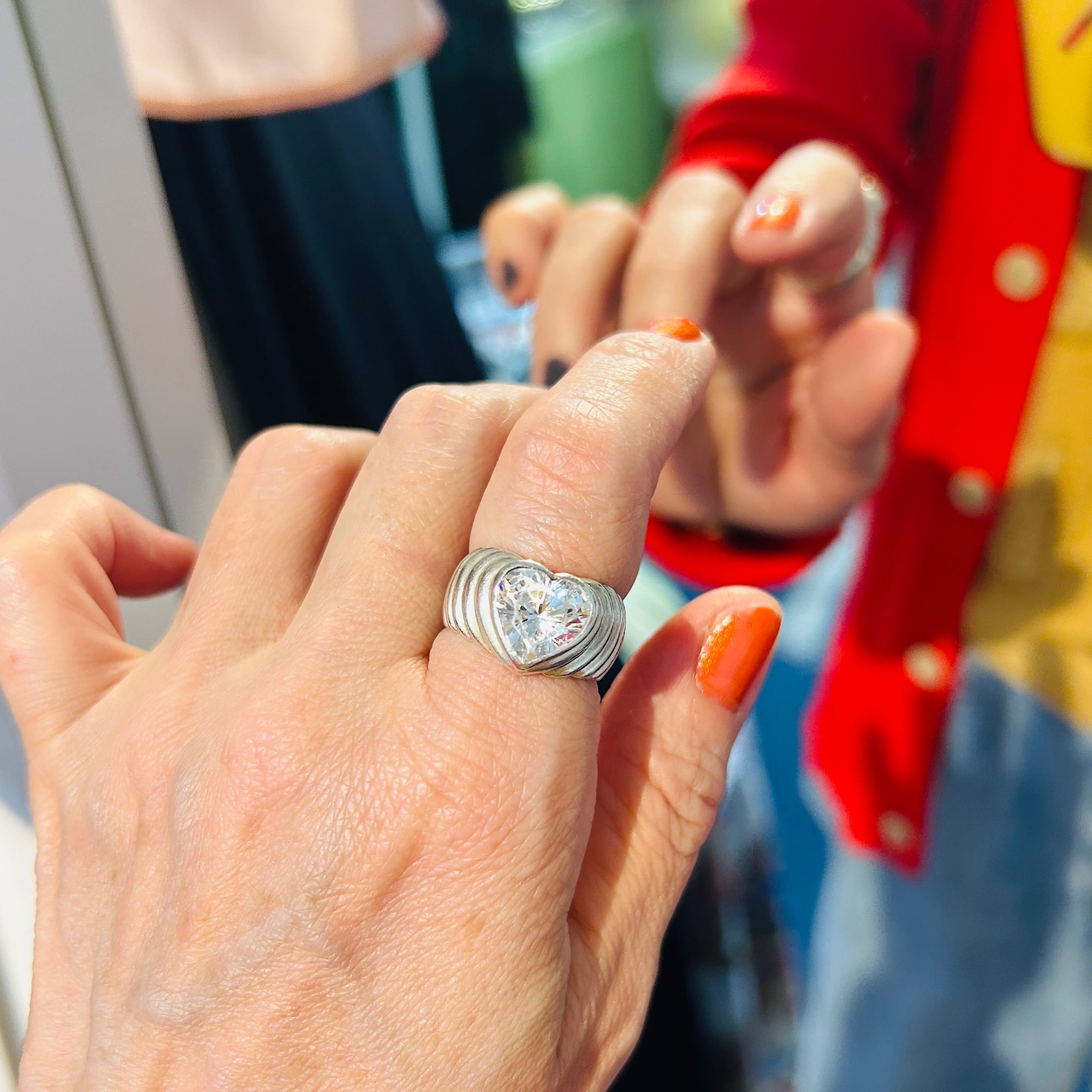 クリアハートのボリュームリング。オモチャっぽくてキュートなデザイン。ステージ状に高く盛り上がったデザイン。手元コーデの主役になるリングです。ハートのトップはスレがあります。肉眼では気になりません。「STERLING」刻印。サイズ棒で11.5号。私は12号中指、14号人差し指の両方に着用できます。