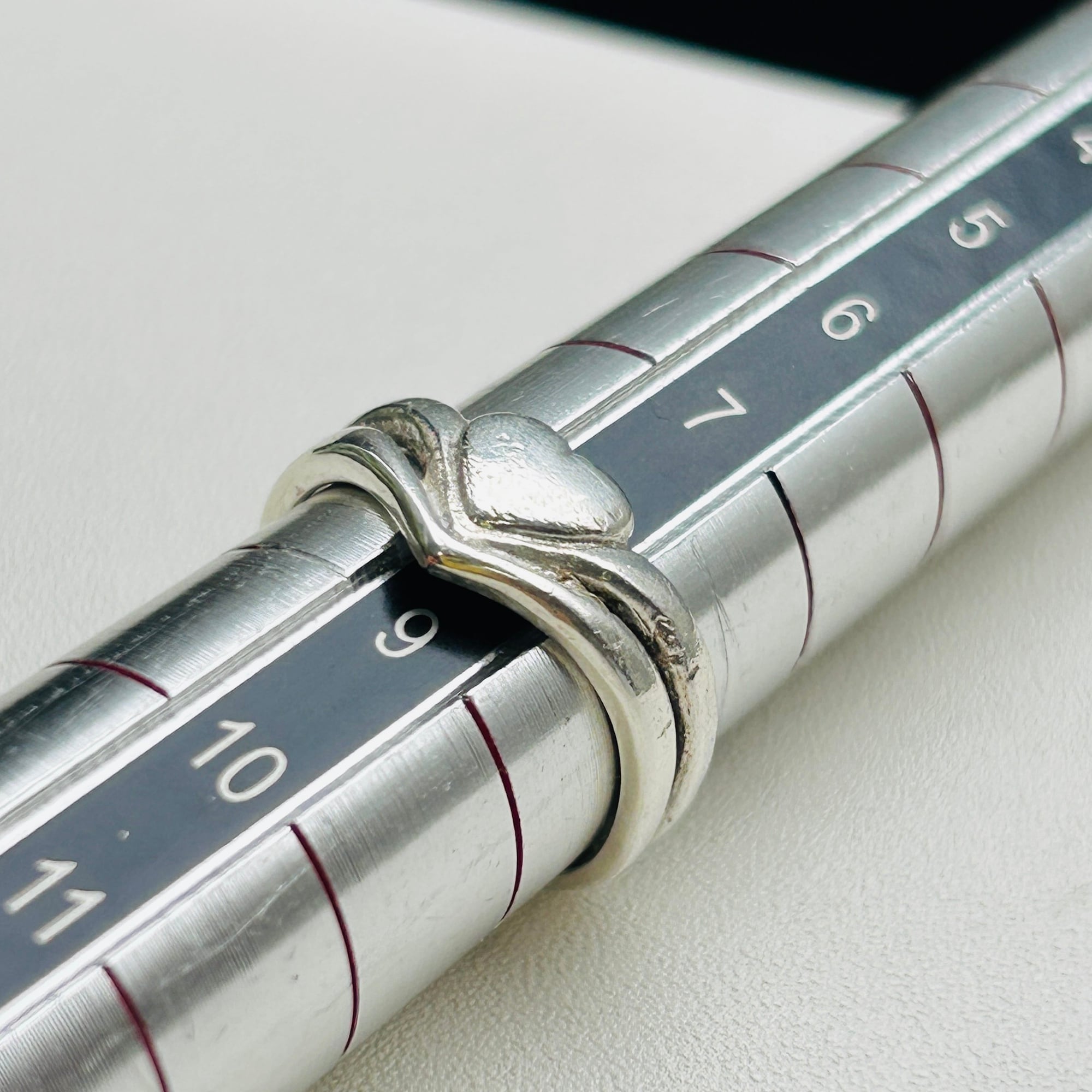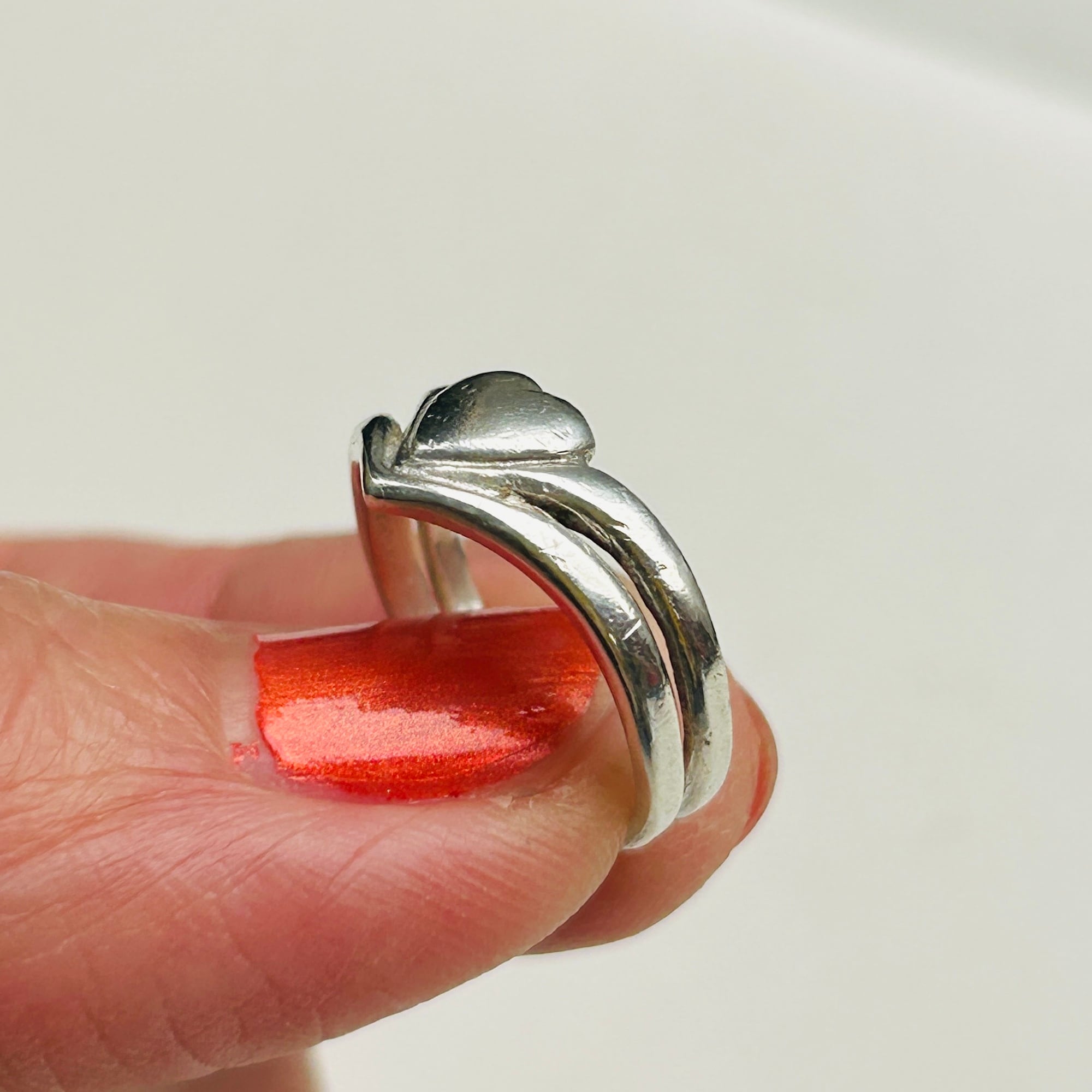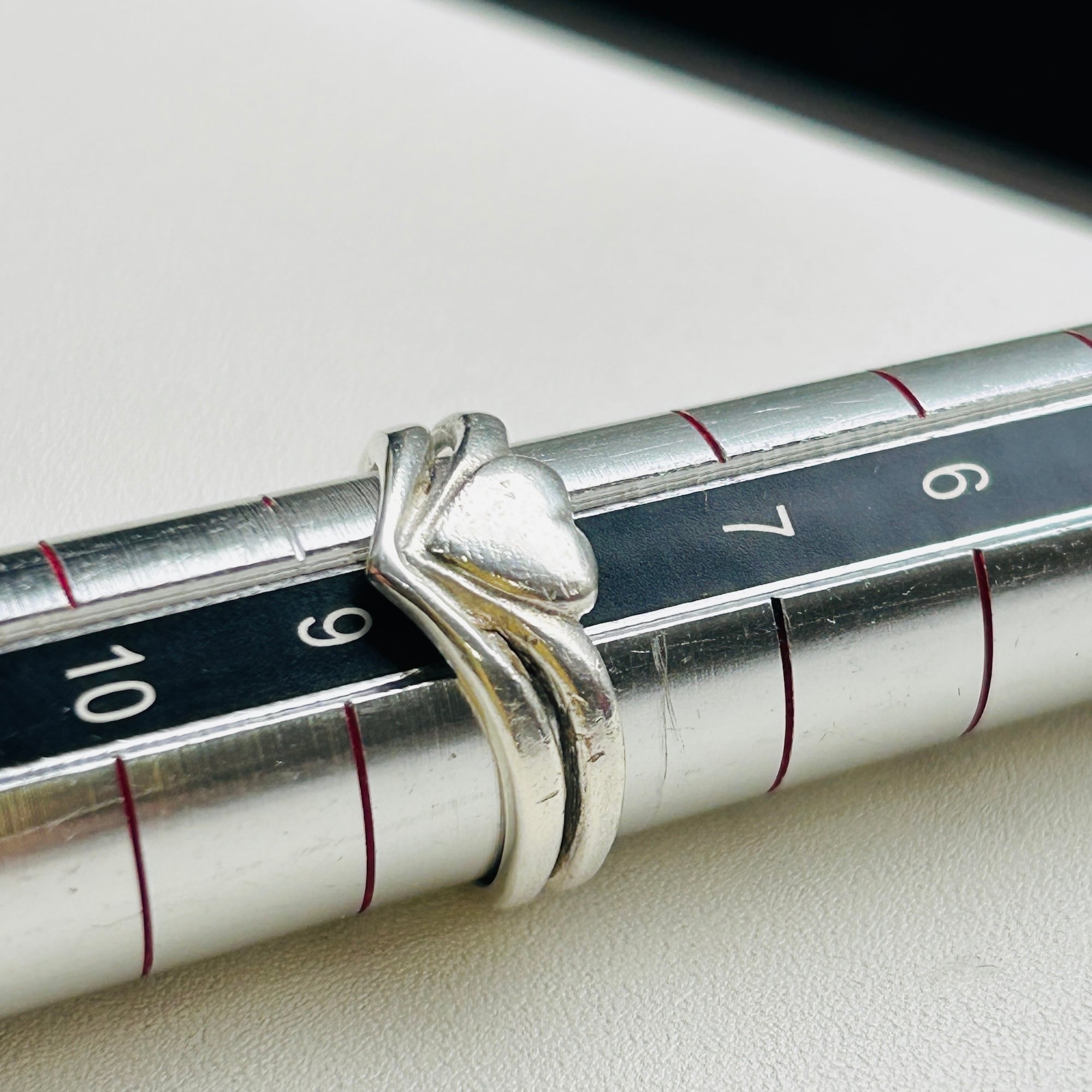 8号サイズのハートリング。海外で小さいサイズはなかなか見つかりませんので指が細い方におすすめです。ハートを2本のバンドが支えるデザイン。本当は3本ラインでしたが1本折れていたのでこちらで補修しています。内側に「925」刻印。Good Price!