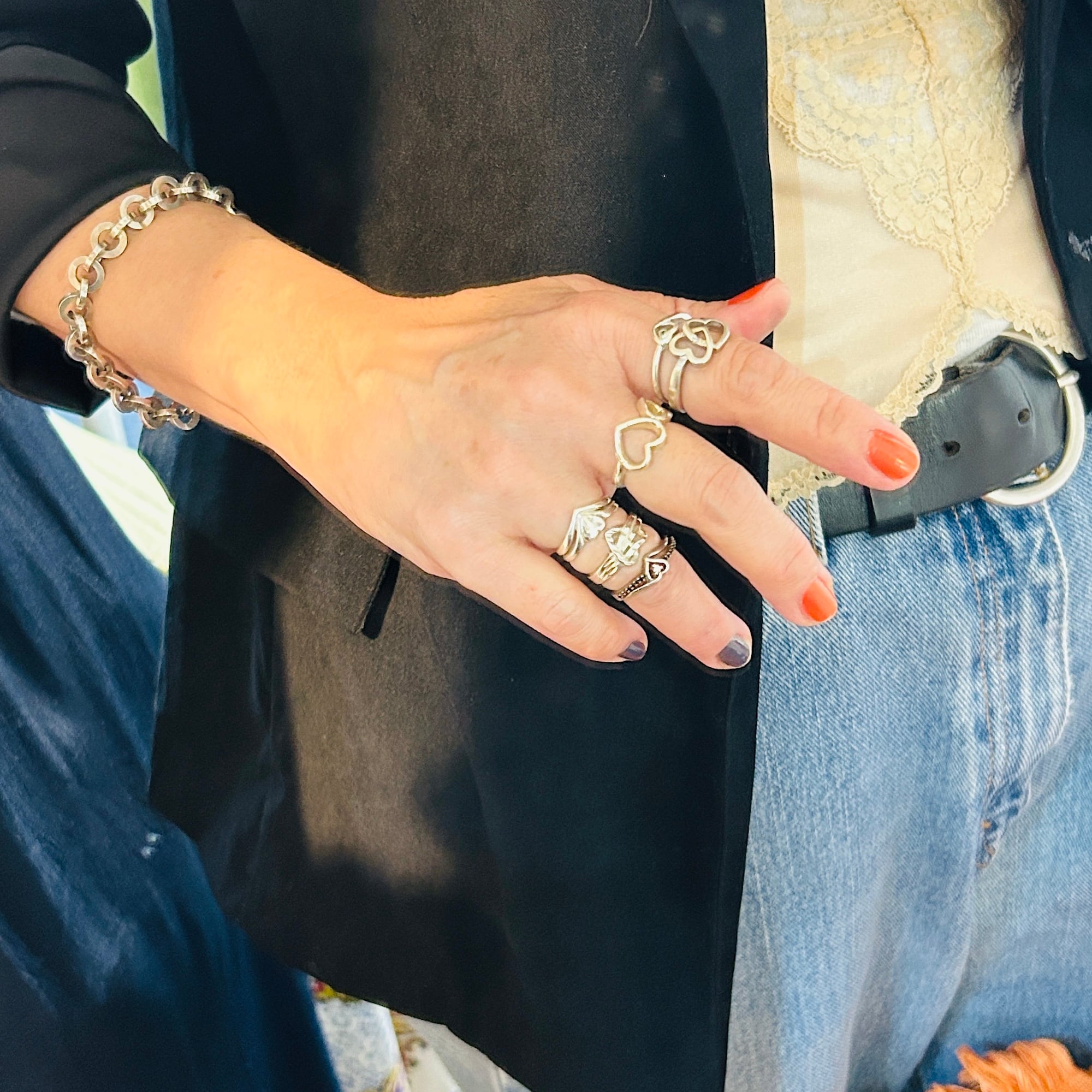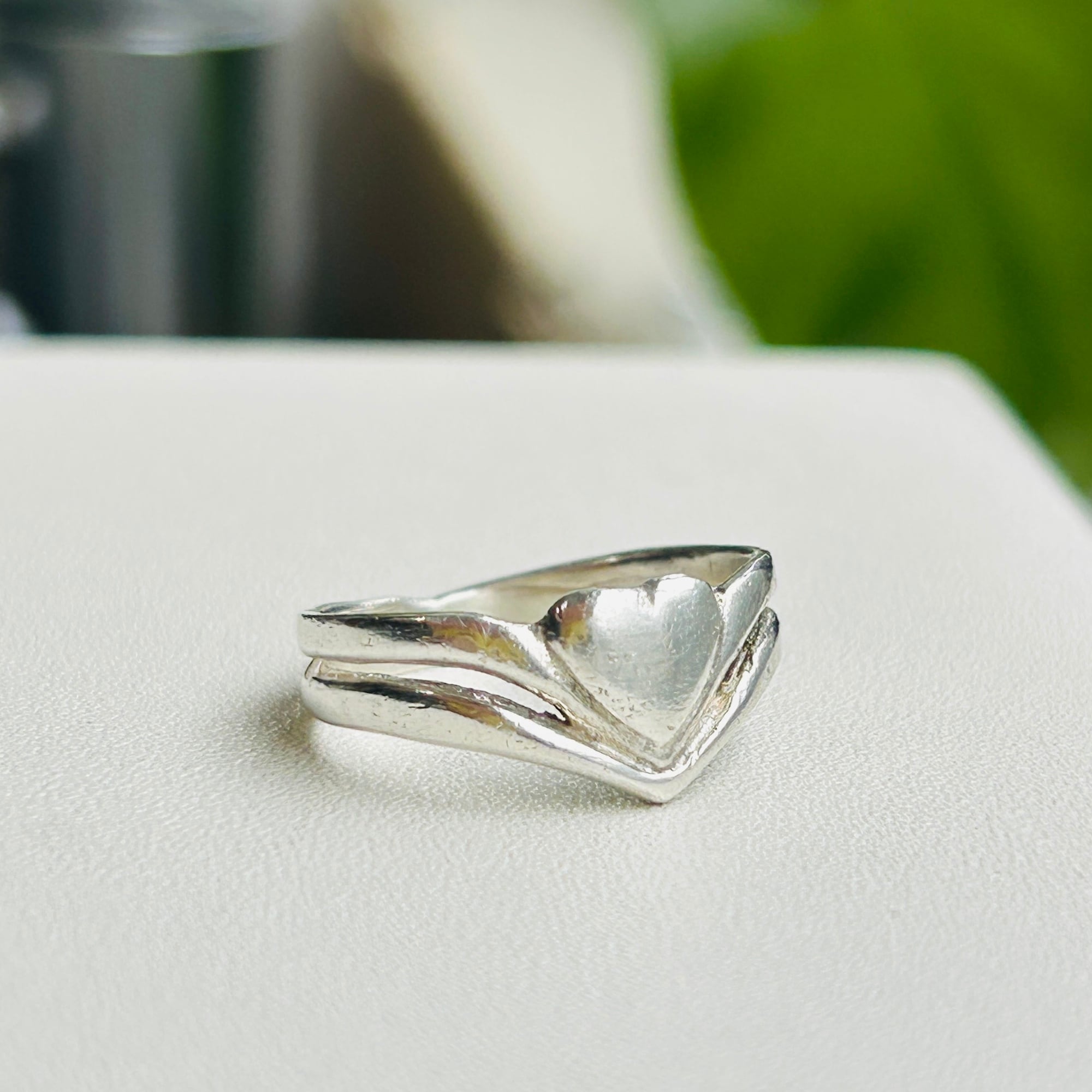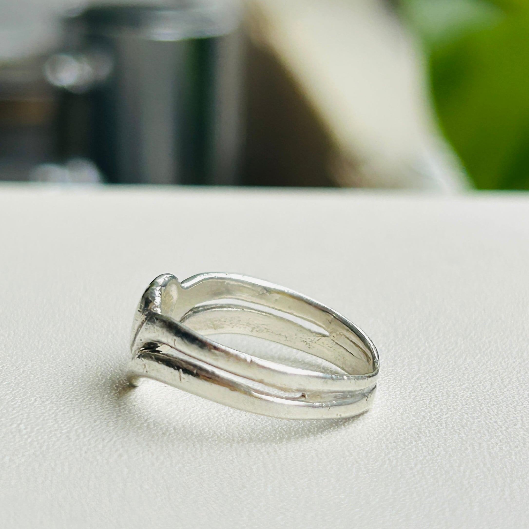 8号サイズのハートリング。海外で小さいサイズはなかなか見つかりませんので指が細い方におすすめです。ハートを2本のバンドが支えるデザイン。本当は3本ラインでしたが1本折れていたのでこちらで補修しています。内側に「925」刻印。Good Price!