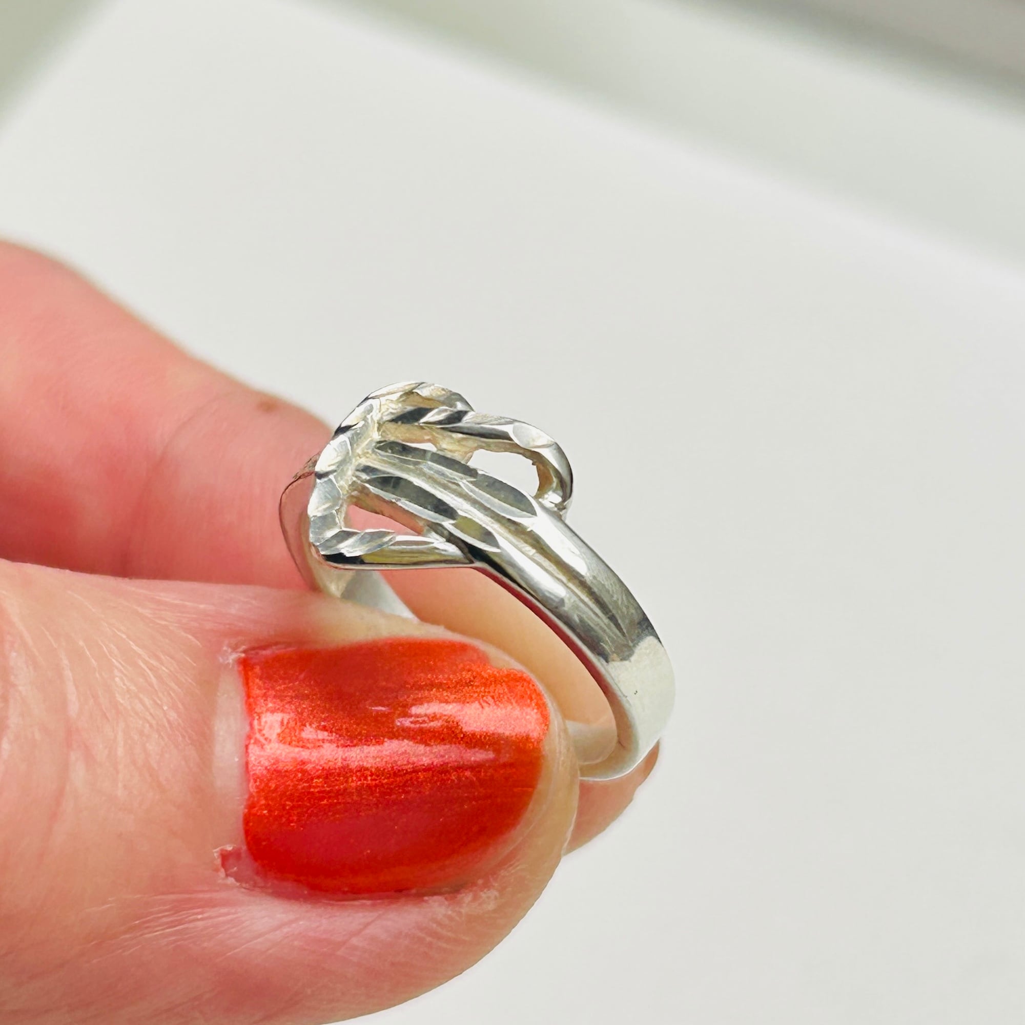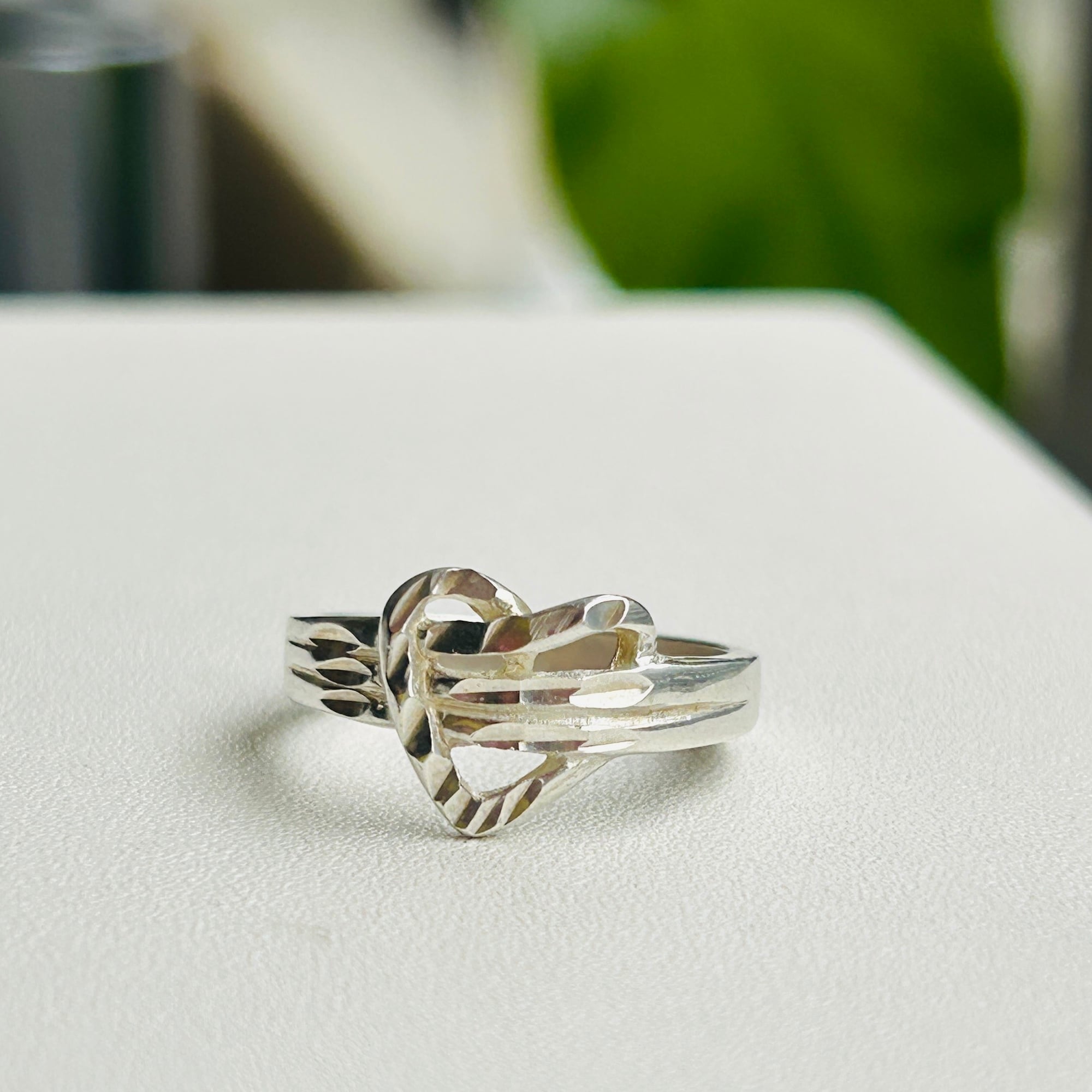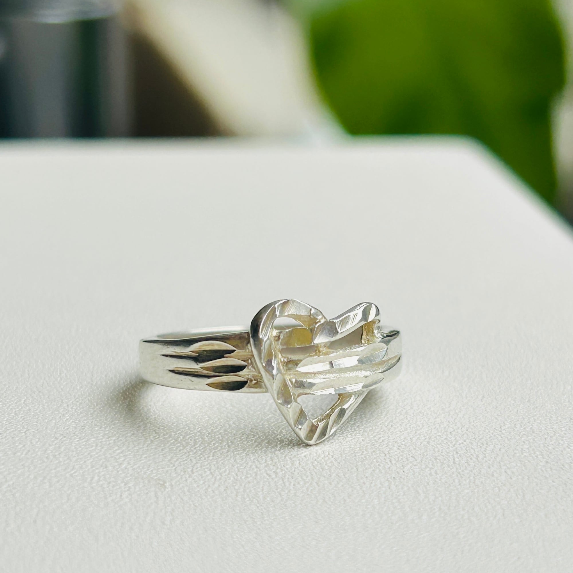 カット模様が入った捻りハートリング。このようなカット模様が放つ独特の輝きがお気に入りです。嬉しい小さめサイズ。沢山着けて可愛い手元に!内側に「925」刻印。
