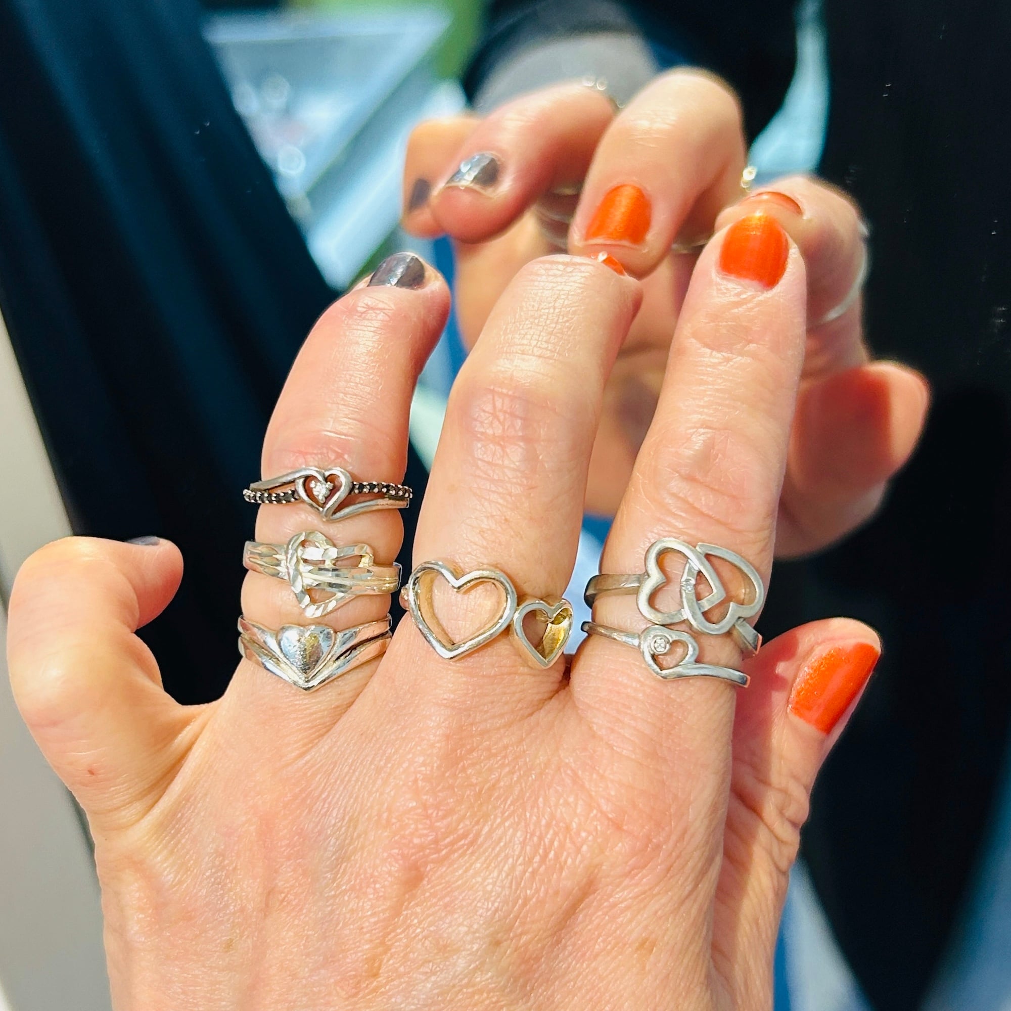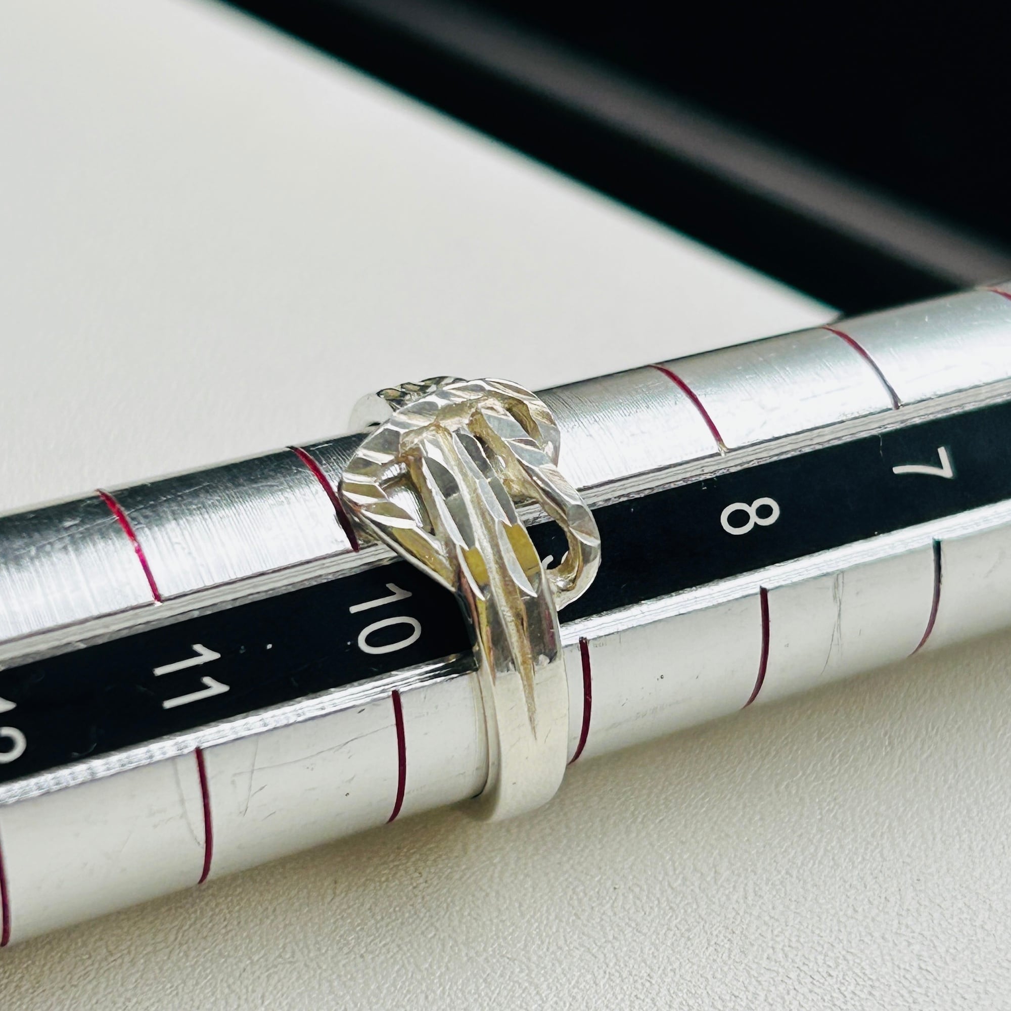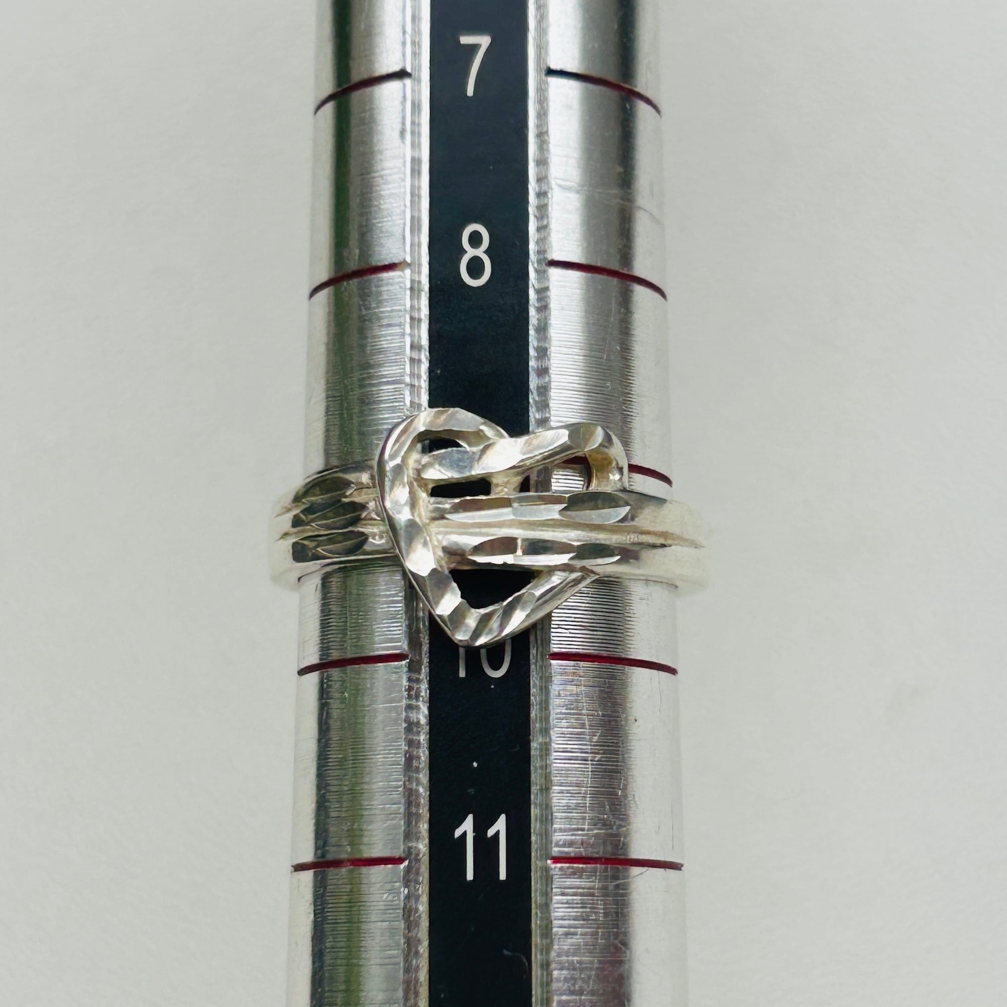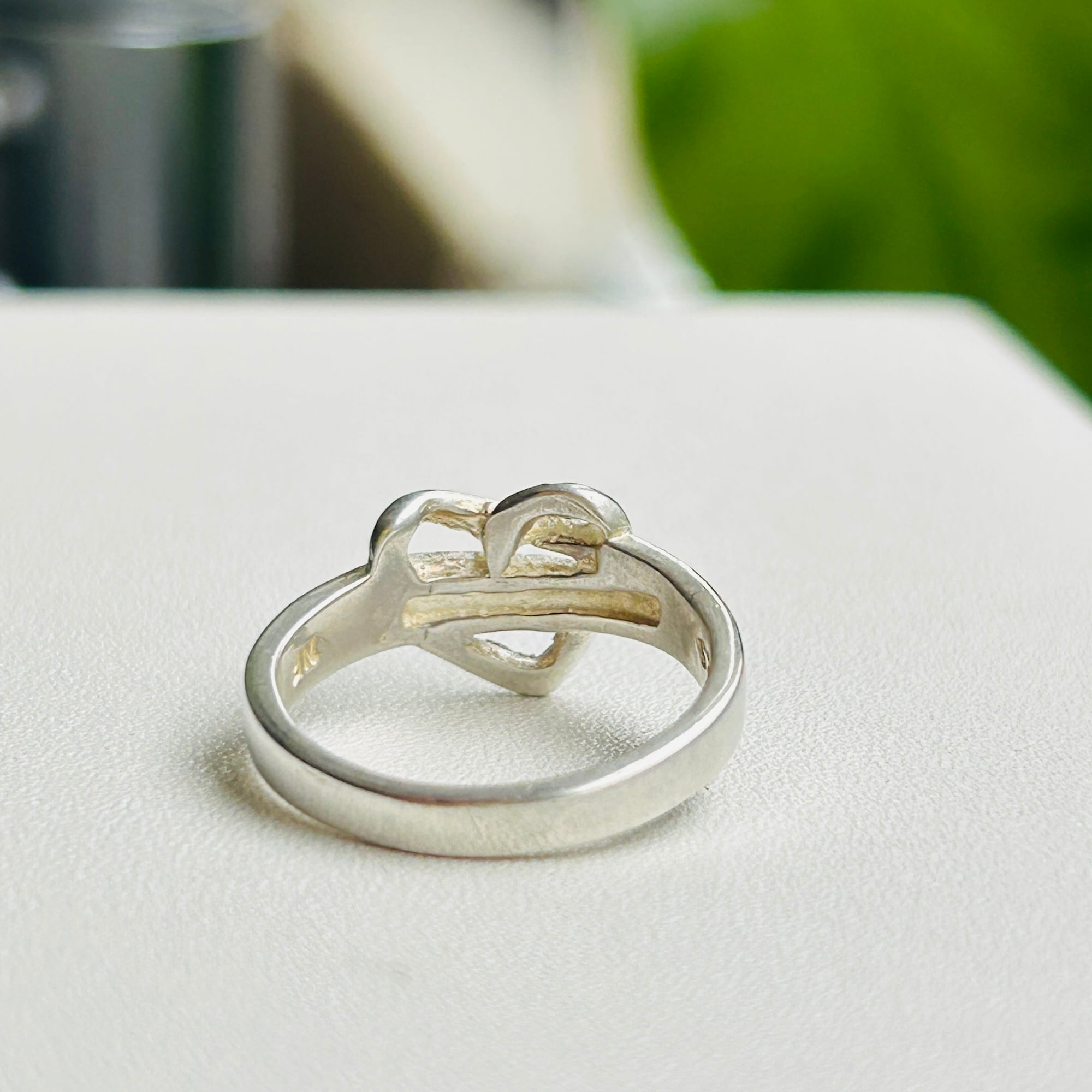 カット模様が入った捻りハートリング。このようなカット模様が放つ独特の輝きがお気に入りです。嬉しい小さめサイズ。沢山着けて可愛い手元に!内側に「925」刻印。