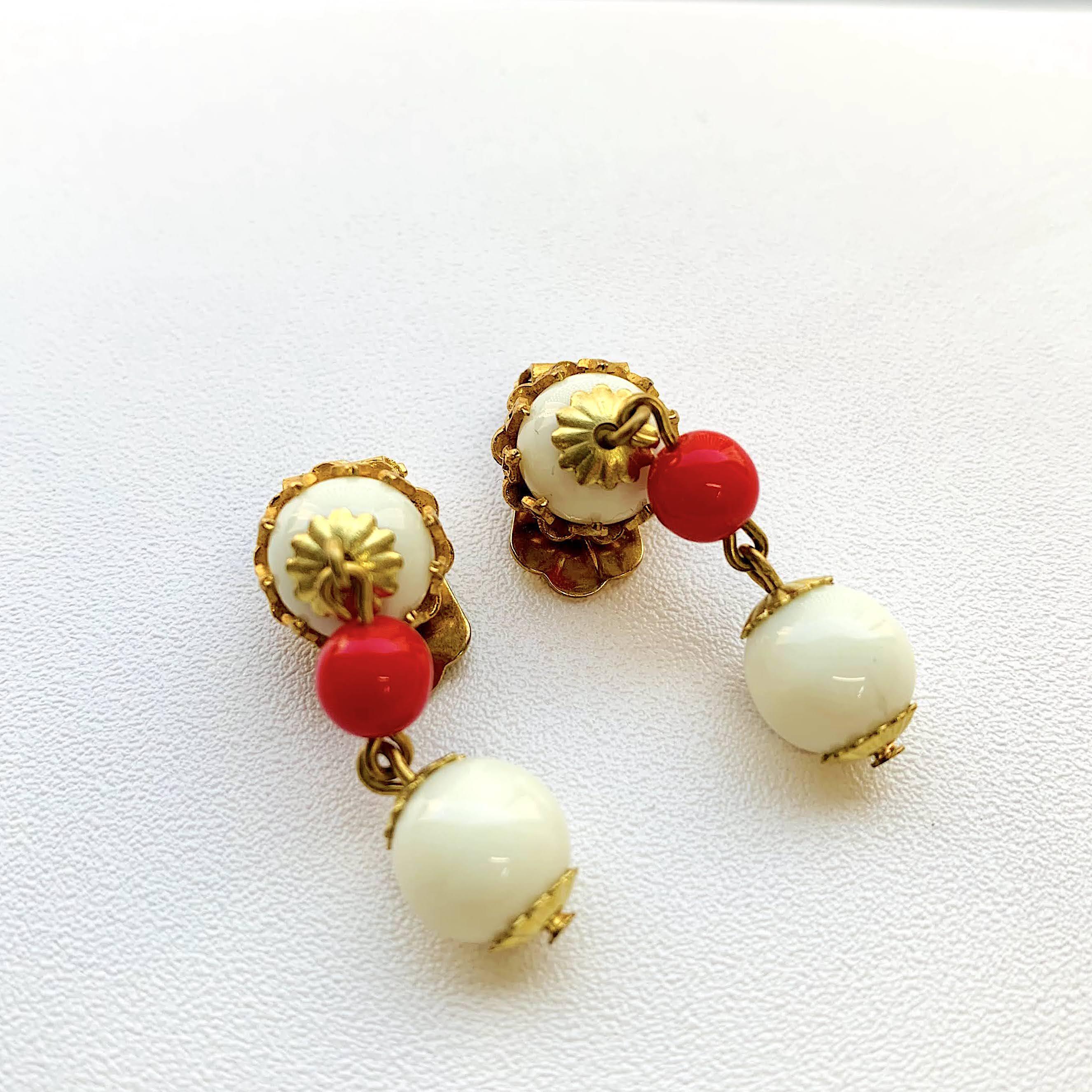 仏 ヴィンテージ DEADSTOCK dangle bead イヤリング(白・赤)