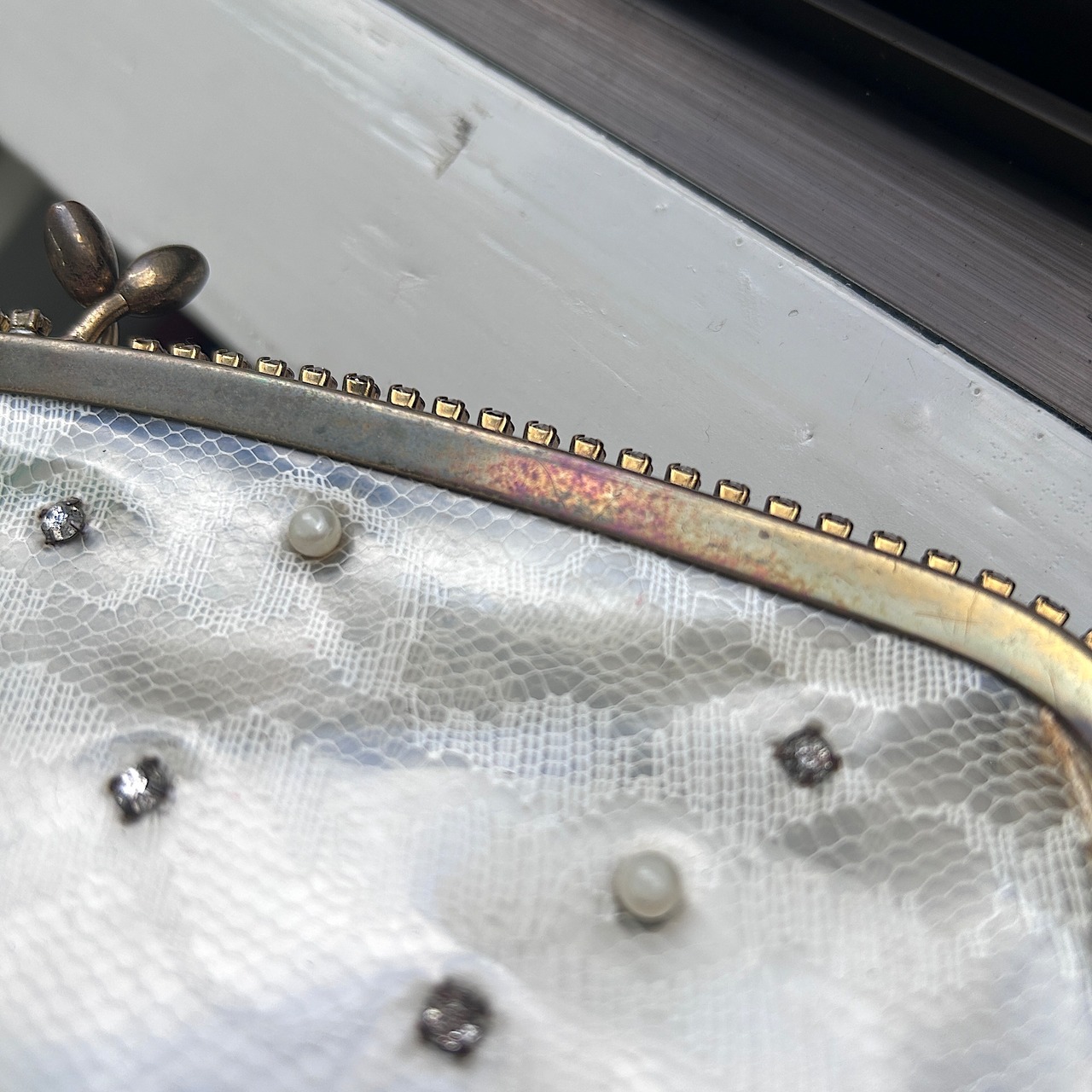 レース模様のヴィンテージクラッチバッグ。本当のレースをビニールに挟んで作られています。ガマ口のフレームにはラインストーン(両サイド1つずつストーン取れています)。バッグの表側にもパール調ビーズ&ラインストーンが散りばめられています。女子力高いヴィンテージならではのデザイン。ビニール部分は黄ばんでいますが、ヴィンテージシャンパンベージュという表現で現したい古い味わいあるお洒落なヴィンテージバッグです。ビニールはカチっとしたしっかりした作り、ガマ口フレームのメタルに変色あります。実物はそれほど気になりません。GOODコンディションです。