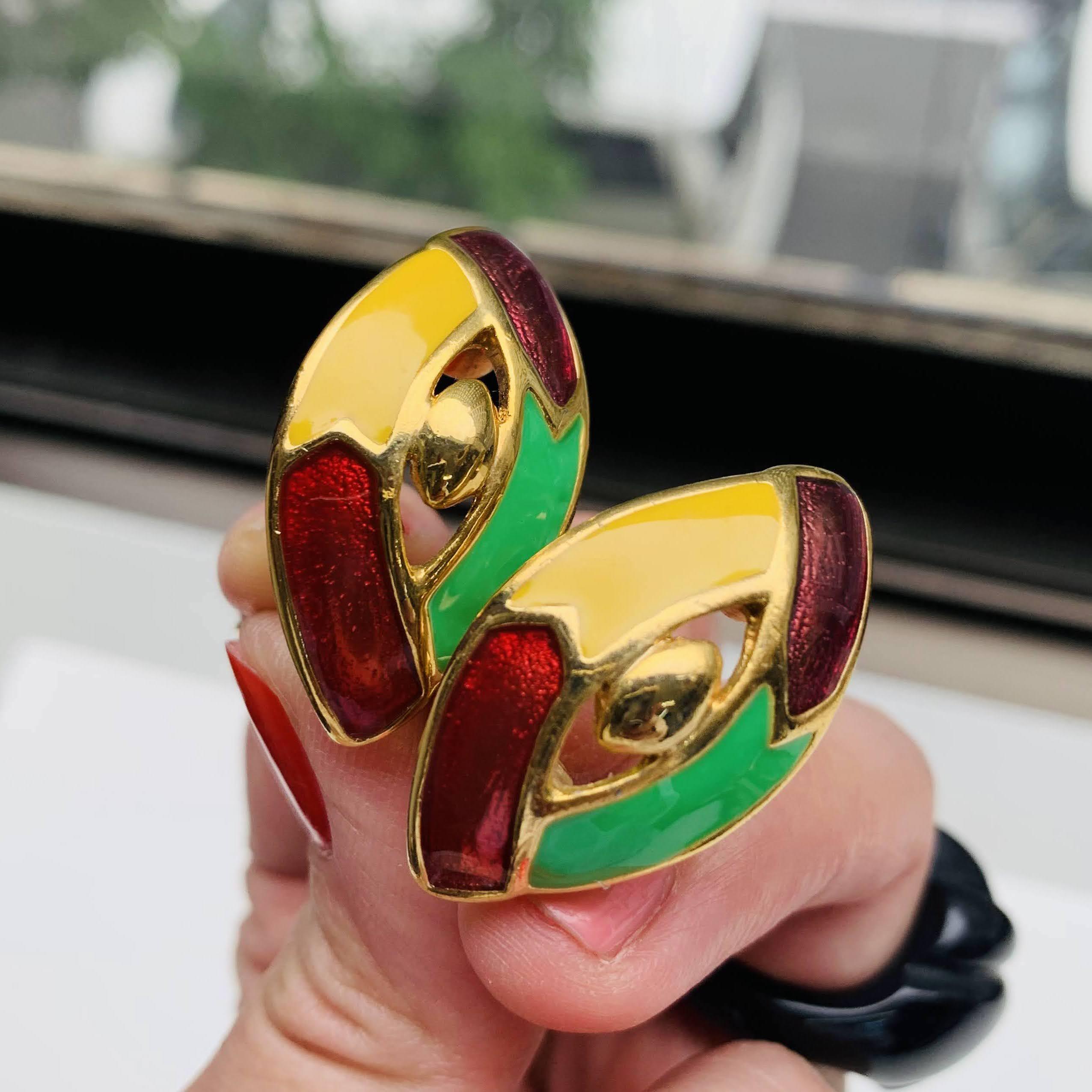 配色が素敵なクリップ・イヤリング。ぽってりしたゴールドメタルにエナメルと七宝風のレトロなデザインが新鮮です。大きなクリップで安定感ある着け心地で重さは気になりません。圧迫感はありません。