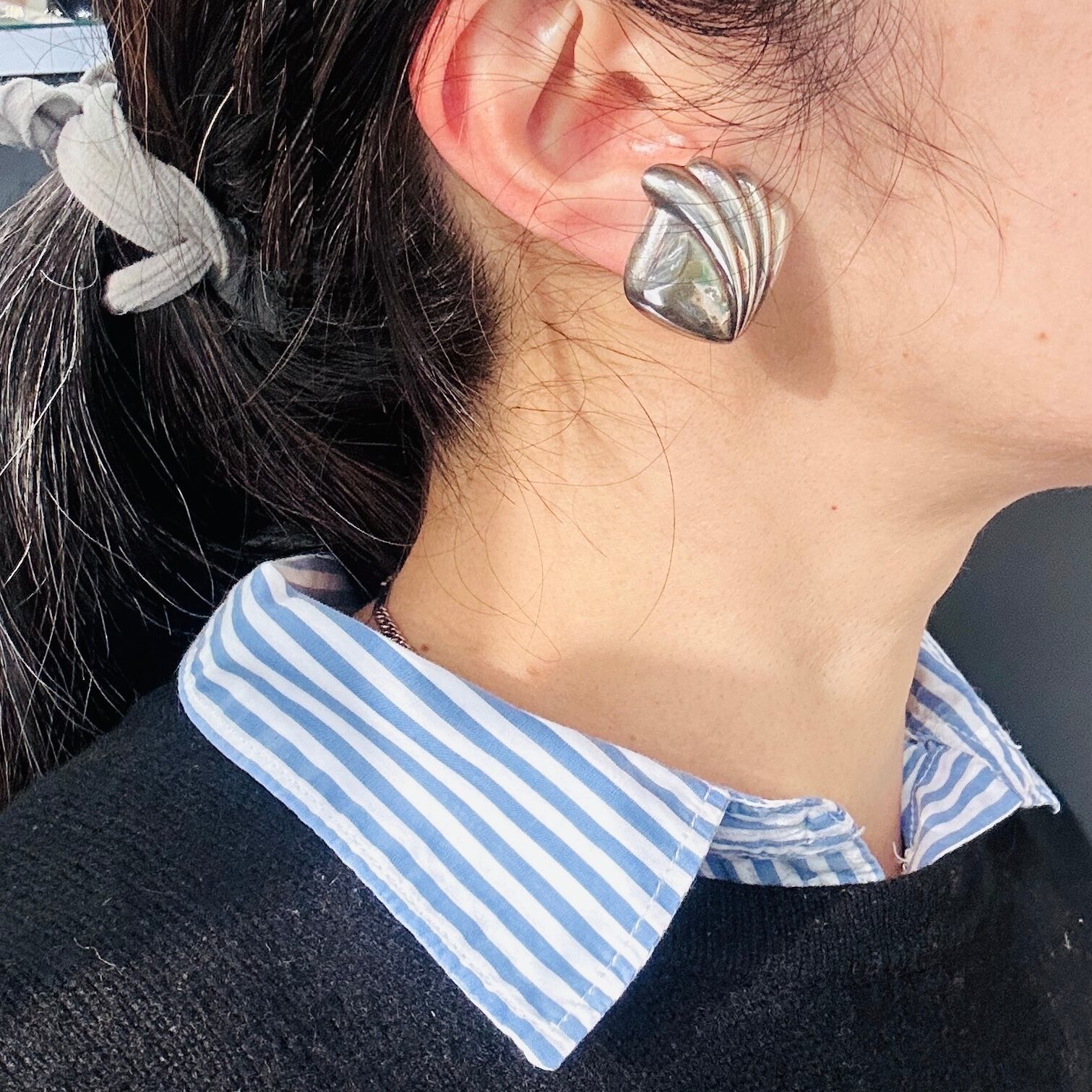 スクエアシェイプに斜めラインのレトロなデザインイヤリング。中空で非常に軽いです。厚み6mm、プクっとした形が耳元で映えます。きめ細かい表面でツヤがキレイなシルバーです。クリップは優しくしっかり耳に留まります。裏側に「Thailand」「925」。Good Price!