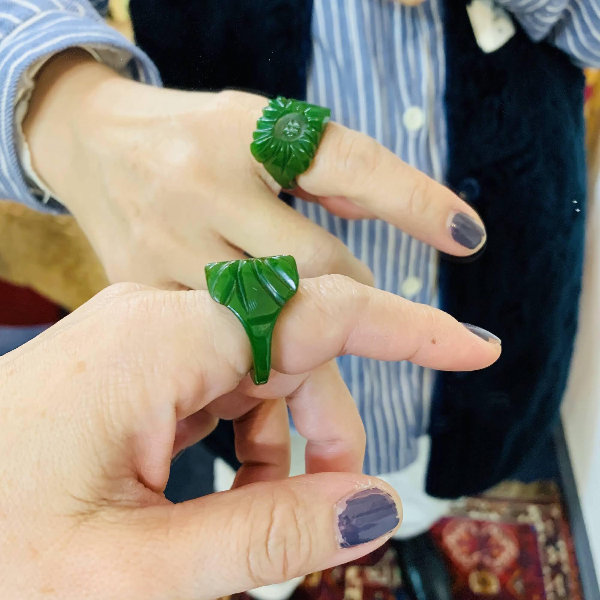 半透明のグリーンベークライトリング。光に当てるとバンド部分がわずかに光を通す程度の半透明です。スクエアトップにお花の彫り模様。ツヤのあるキレイなベークライトです。私は中指と人差し指にはめることができます。中指は通常12号でこちらのリングもジャストサイズ。人差し指はギチギチで抜くのが痛かったです。稀少な彫り模様ベークライトリング、大変オススメです。