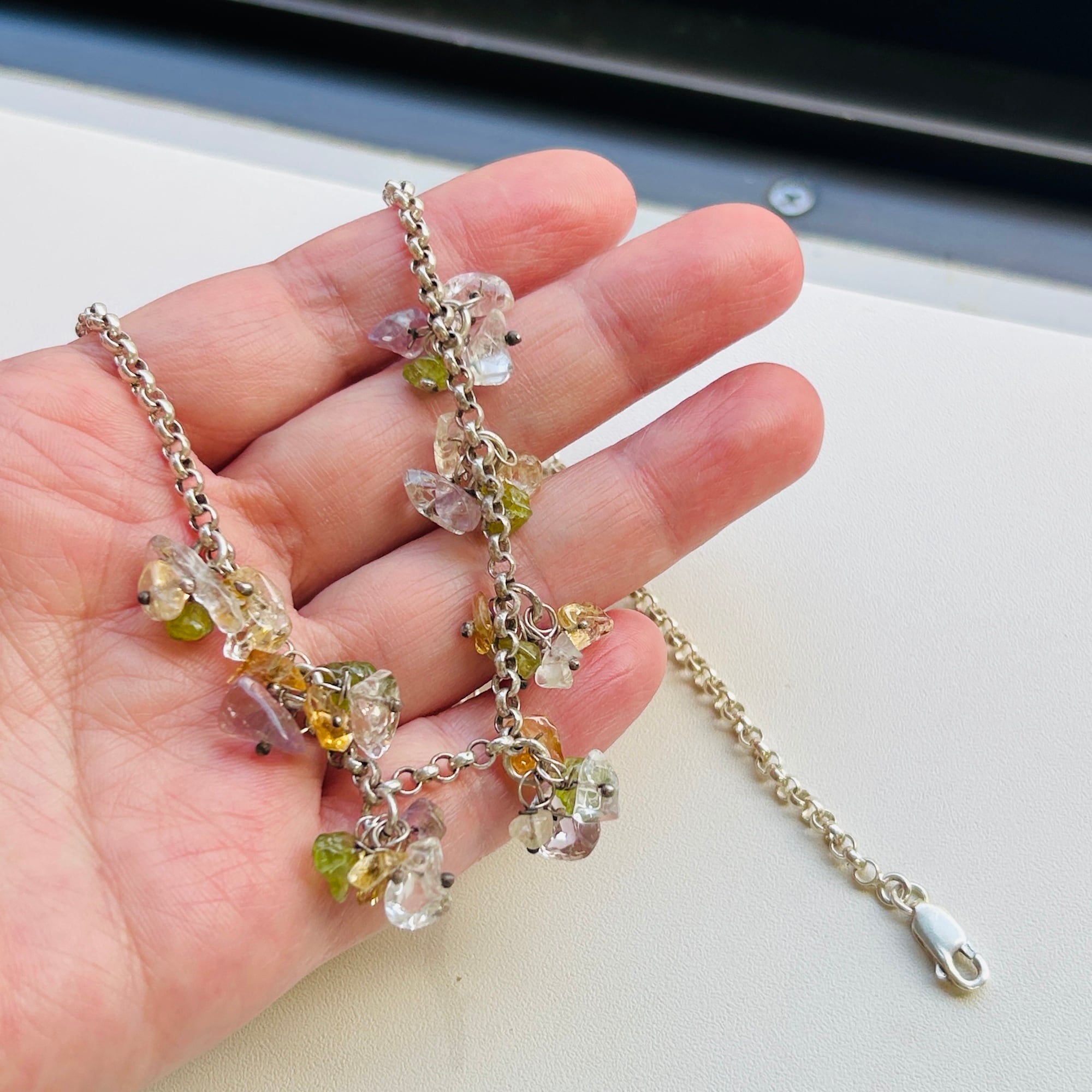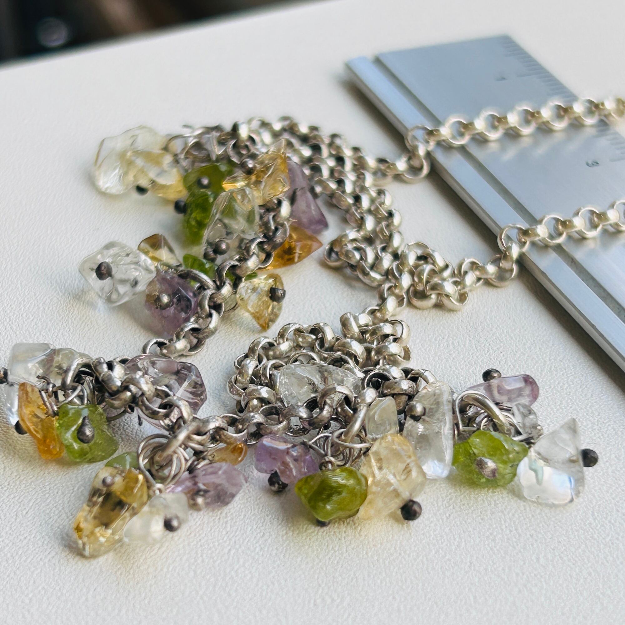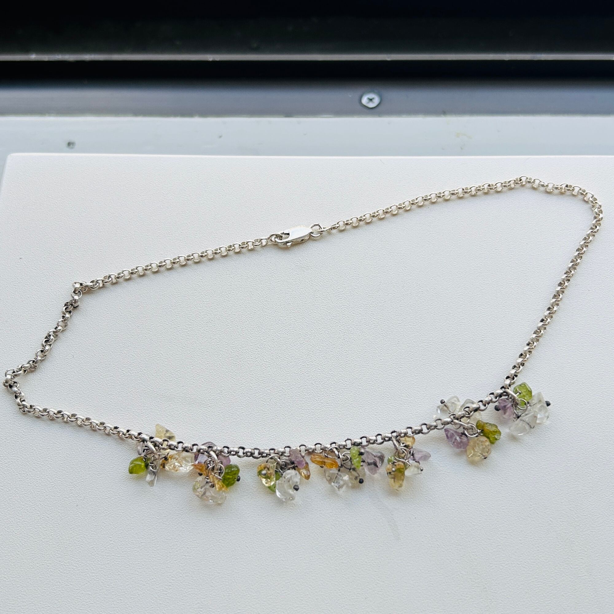 フランスから届いたヴィンテージネックレス。水晶やアメジスト、シトリン、ペリドットの天然石ビーズクラスターが沢山着いています。小さくて丸いシルバーロロチェーンはしっかりした作りでビーズクラスターを支えています。華奢な天然石アクセサリーとは少し異なる、存在感あるネックレスです。単体で楽しむのもGOOD、長さやタイプの違うネックレスをジャラジャラと重ね着けして外国人風に着けるのも可愛いと思います。留め具に「925」、フランスメーカーマーク、シルバー800を保証する「ミネルヴァ」マーク。1994年以降に使用された刻印です。。