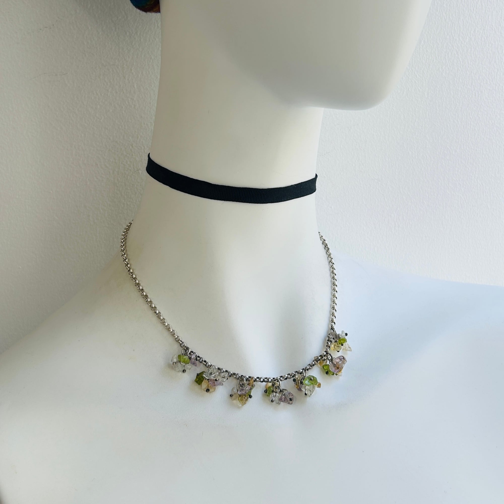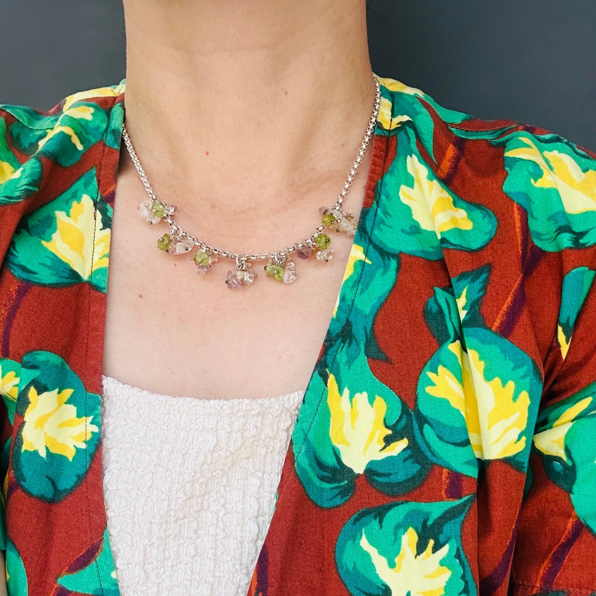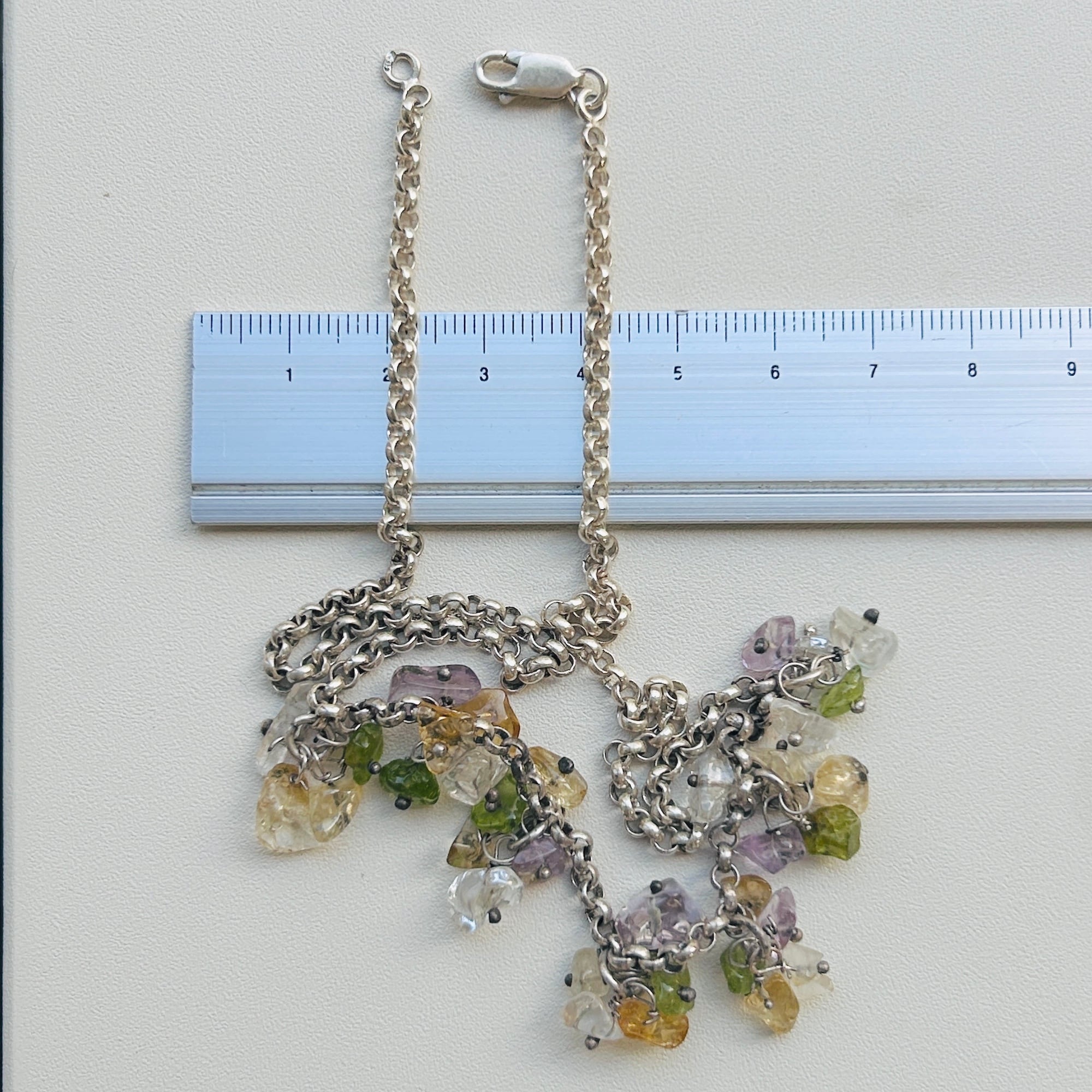 フランスから届いたヴィンテージネックレス。水晶やアメジスト、シトリン、ペリドットの天然石ビーズクラスターが沢山着いています。小さくて丸いシルバーロロチェーンはしっかりした作りでビーズクラスターを支えています。華奢な天然石アクセサリーとは少し異なる、存在感あるネックレスです。単体で楽しむのもGOOD、長さやタイプの違うネックレスをジャラジャラと重ね着けして外国人風に着けるのも可愛いと思います。留め具に「925」、フランスメーカーマーク、シルバー800を保証する「ミネルヴァ」マーク。1994年以降に使用された刻印です。。