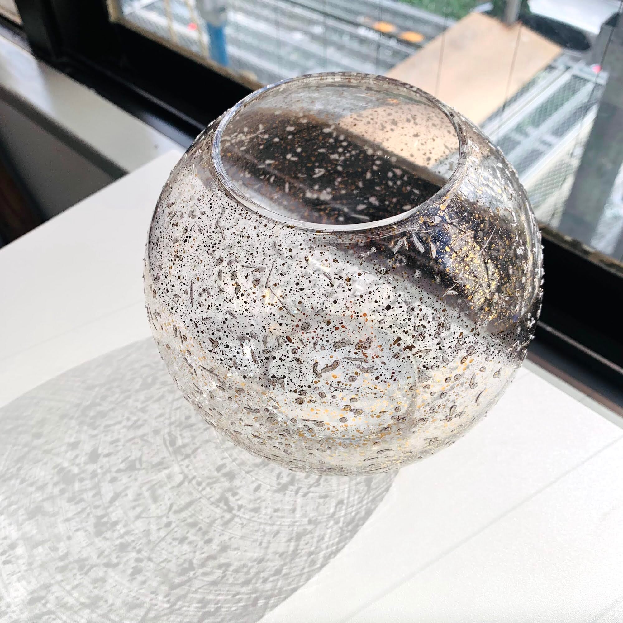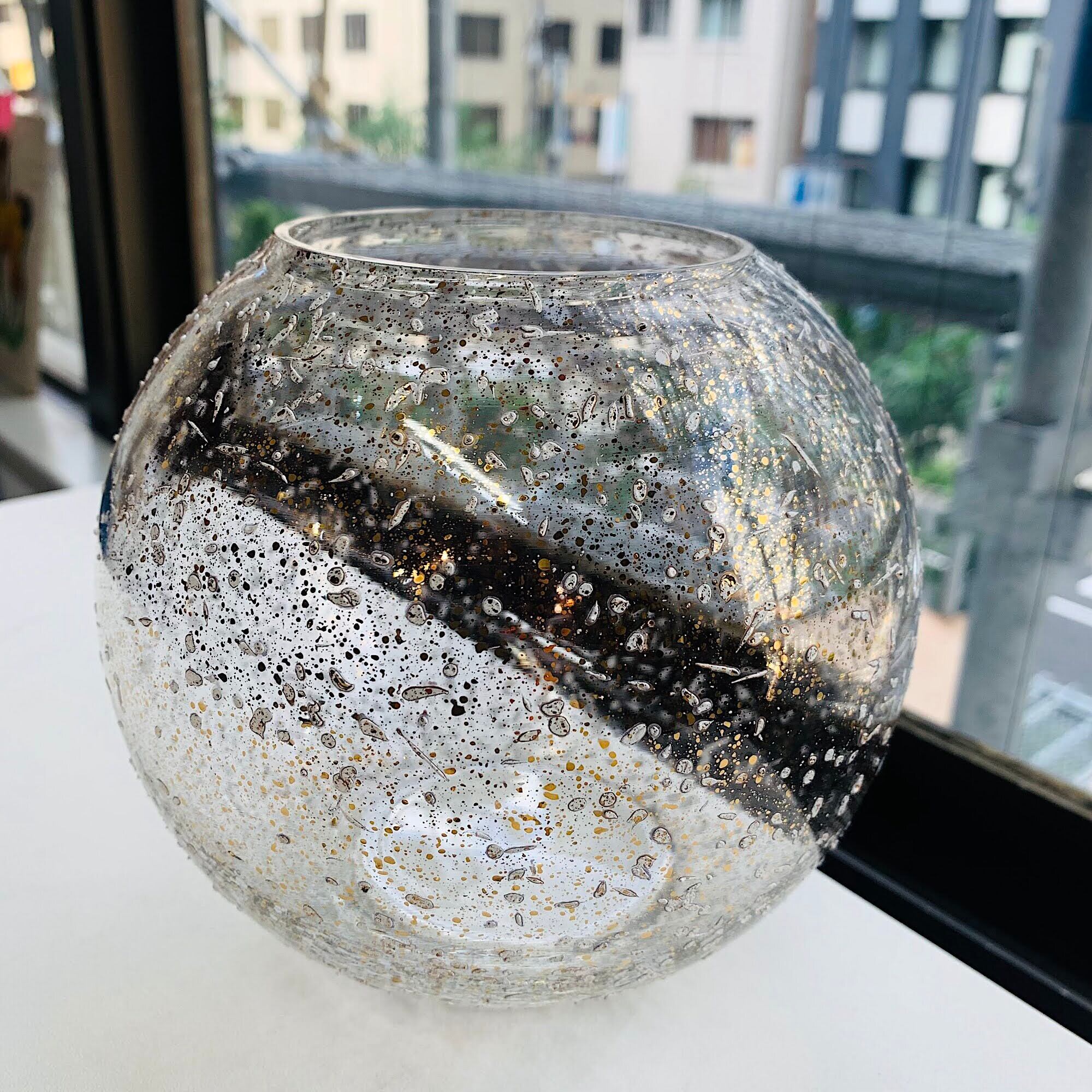 ゴールドと白のラメ模様が可愛い、コンパクトな丸ガラス花瓶。カタチ、大きさ、デザイン、全てGOODなミッドセンチュリー時代の花瓶です。個人的に大好きなデザイン。ゴールドと白のコンフェッティ模様はペイントです。ガラス表面にペンキを飛び散らせた模様が施されています。ガラス表面は凹凸ある手触りです。中に円柱型のガラスの瓶等を入れて、花やグリーンを活けてもらうといいと思います。