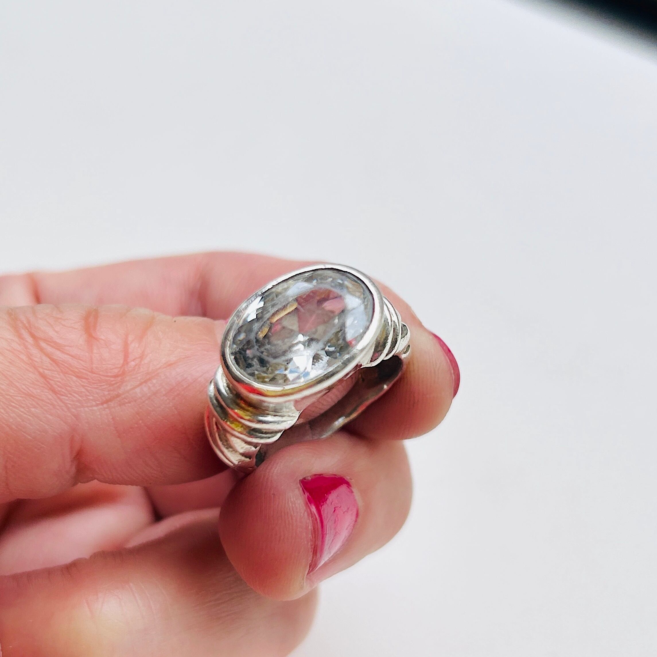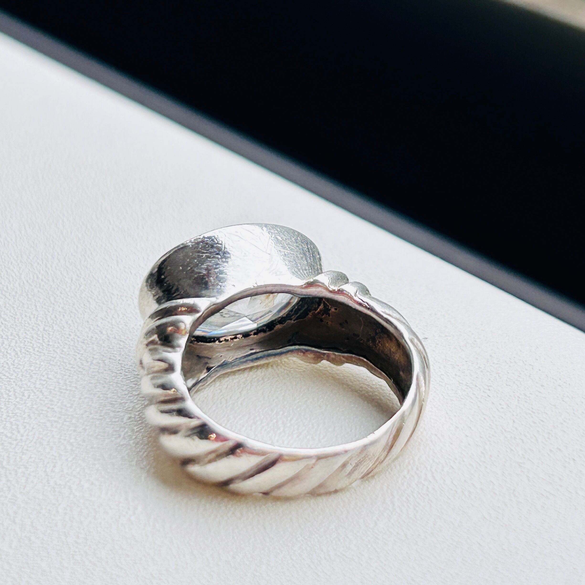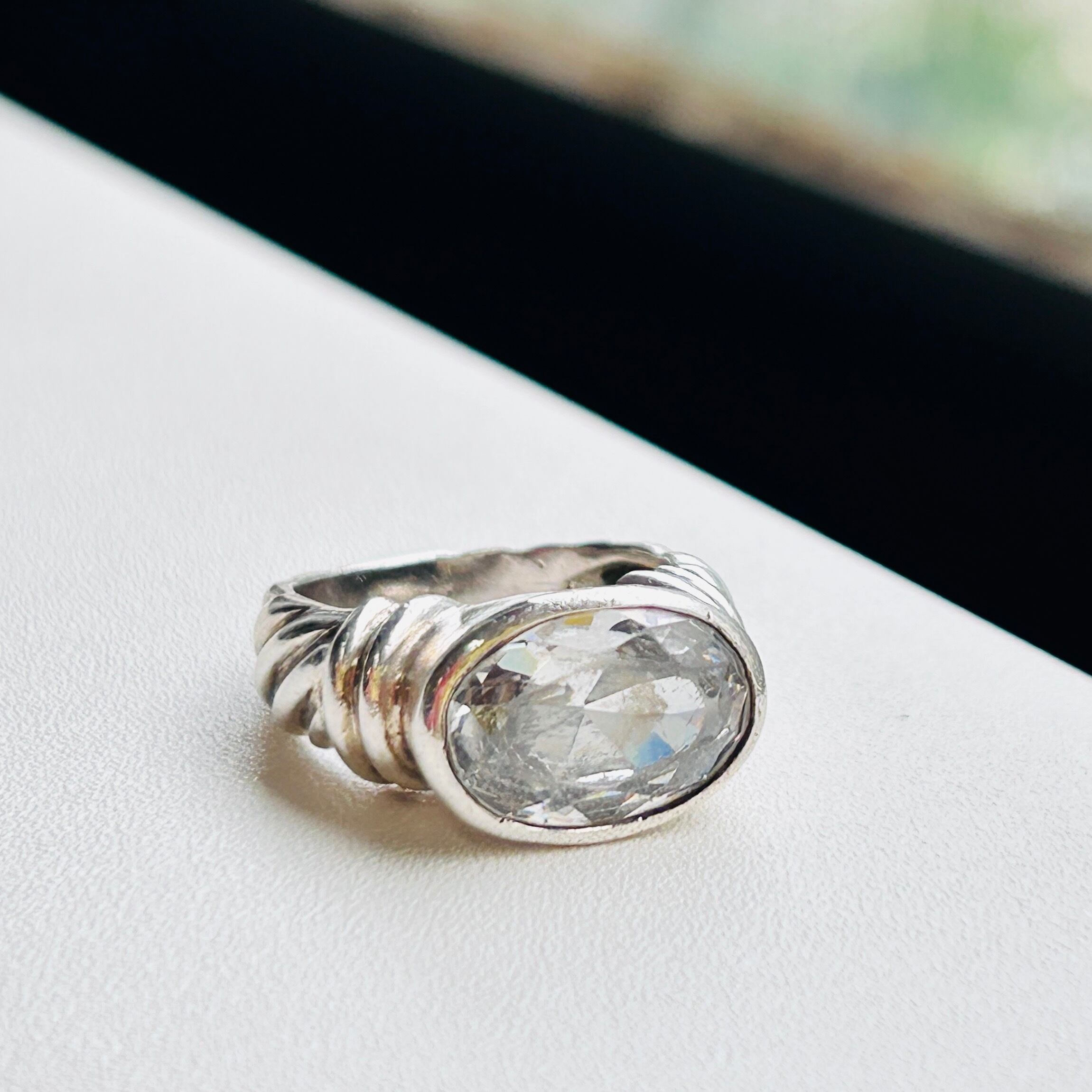 横に長い楕円型クリアガラスリング。トップはやや高く盛り上がったベゼルセット、ネジネジ模様バンド。全体に装飾が凝らされたデザインです。エスニックな雰囲気とクリアストーンがいい感じにマッチしています。ガラス表面は小傷が多く、他のクリアストーンと比較するとやや輝きが鈍いですが、単体で手元で見る分には特に気が付かない程度です。内側に「925」刻印。