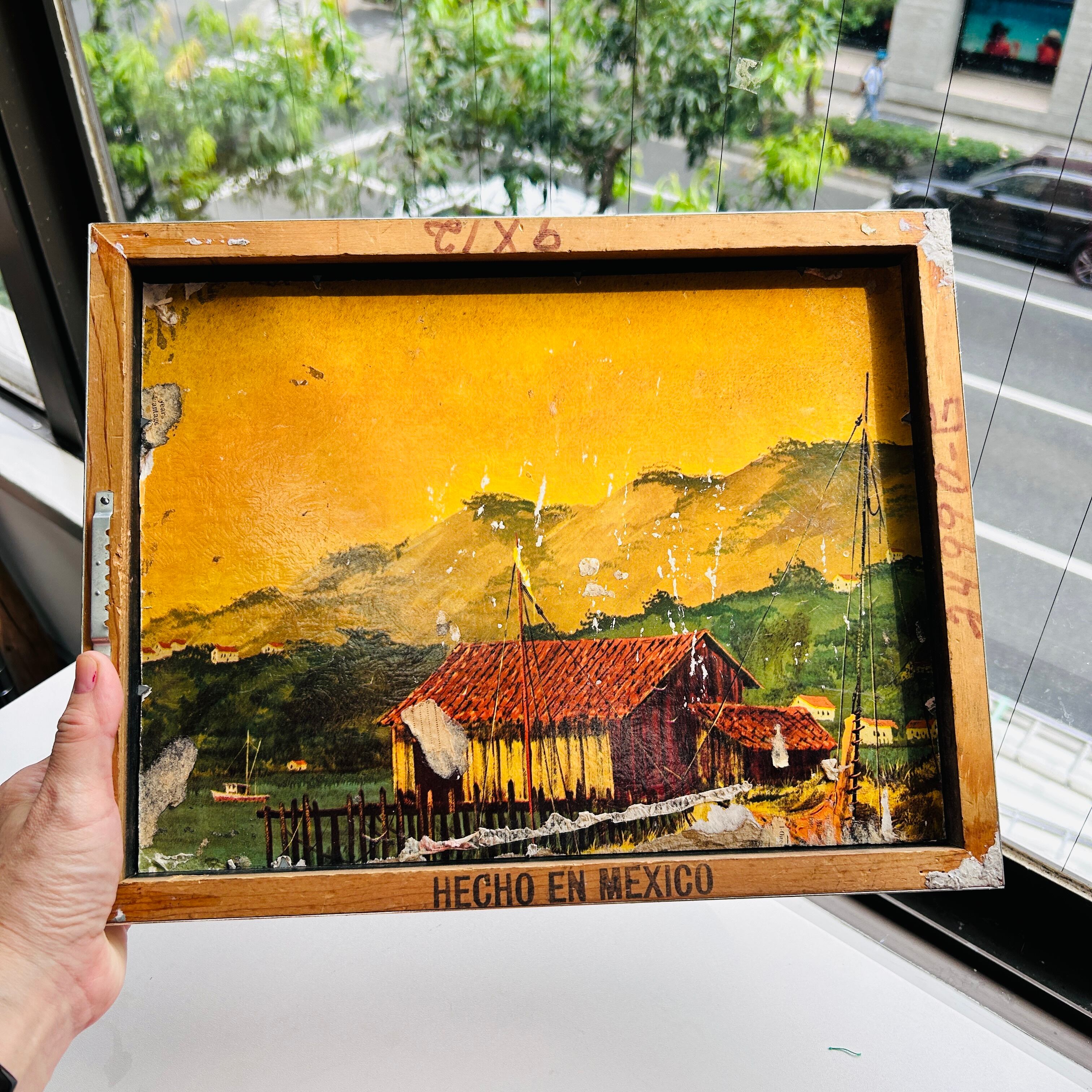 シルバートーンのフレームも大変素敵です。擦り傷や水シミのようなのが全体にあります。が、メタリックな質感で目立ちません。裏には「Hecho en Mexico」の文字。また裏の角には壁の固定に使われていた粘着粘土がまだ少し付着しています。