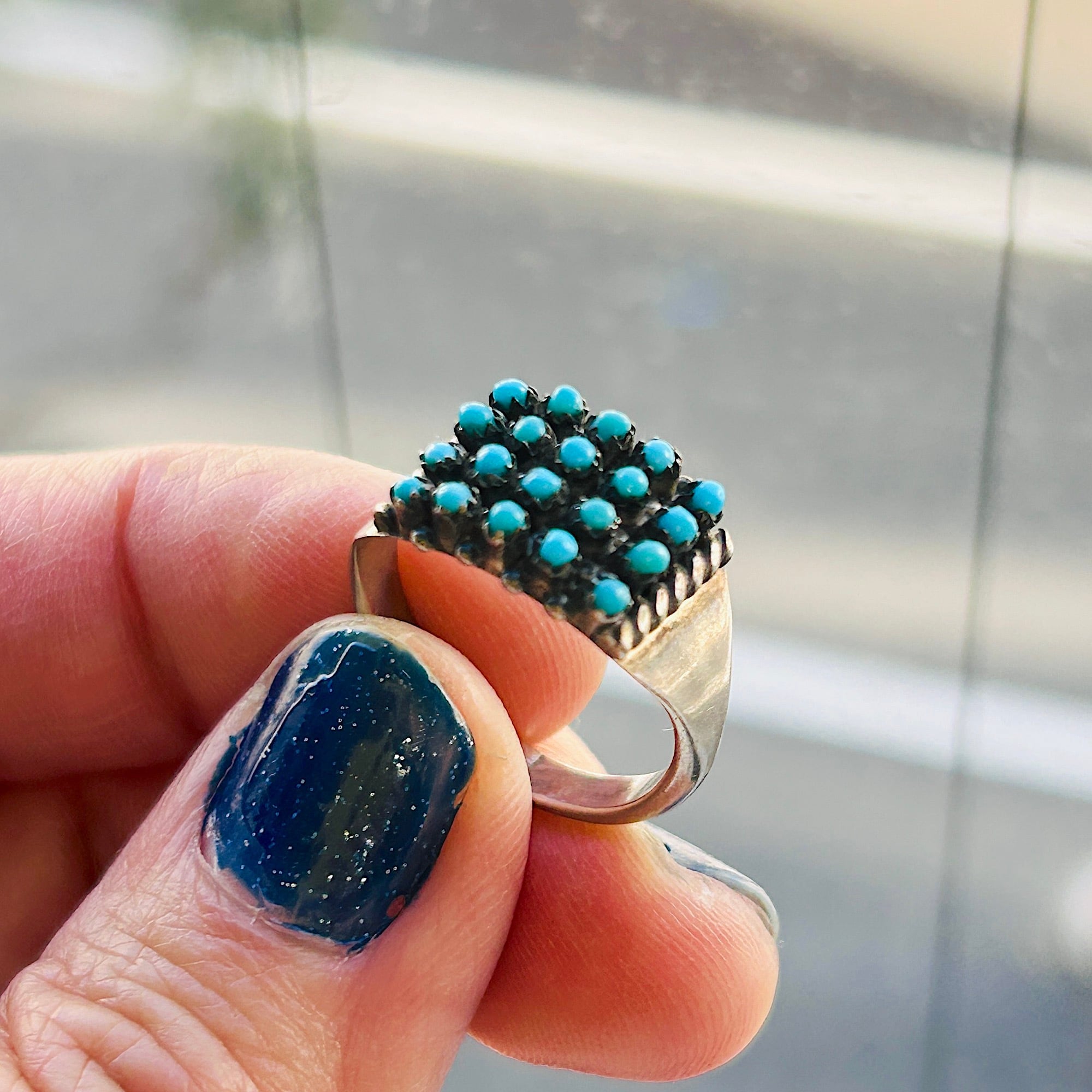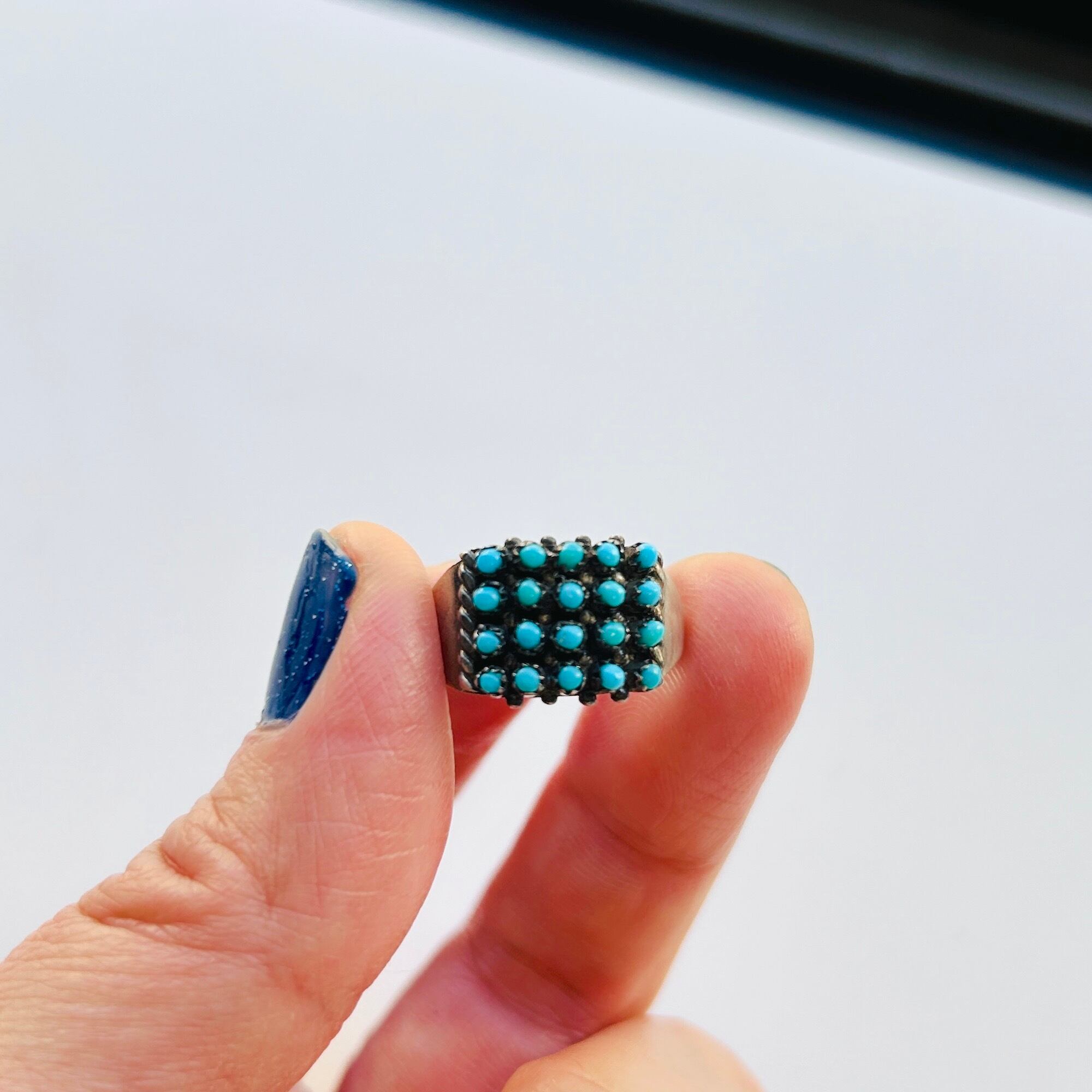 小さなターコイズドットが4 x 5で四角く配列されたスネークアイと呼ばれるデザイン。ZUNI族アーティスト Haloo ファミリーの伝統的デザインです。粒々ターコイズは立体感があって手元で際立ちます。家族で長く継承しているHalloファミリー、こちらは内側に手描きで「Haloo」のサイン。家族の中のどのHalooさんなのか分かりません。サイズは実寸通り、普段14〜15号の人差し指にピッタリですが、普段12号の中指にも着用できます。ストーンの裏側が滑らかで肌当たりが気持ちいです。