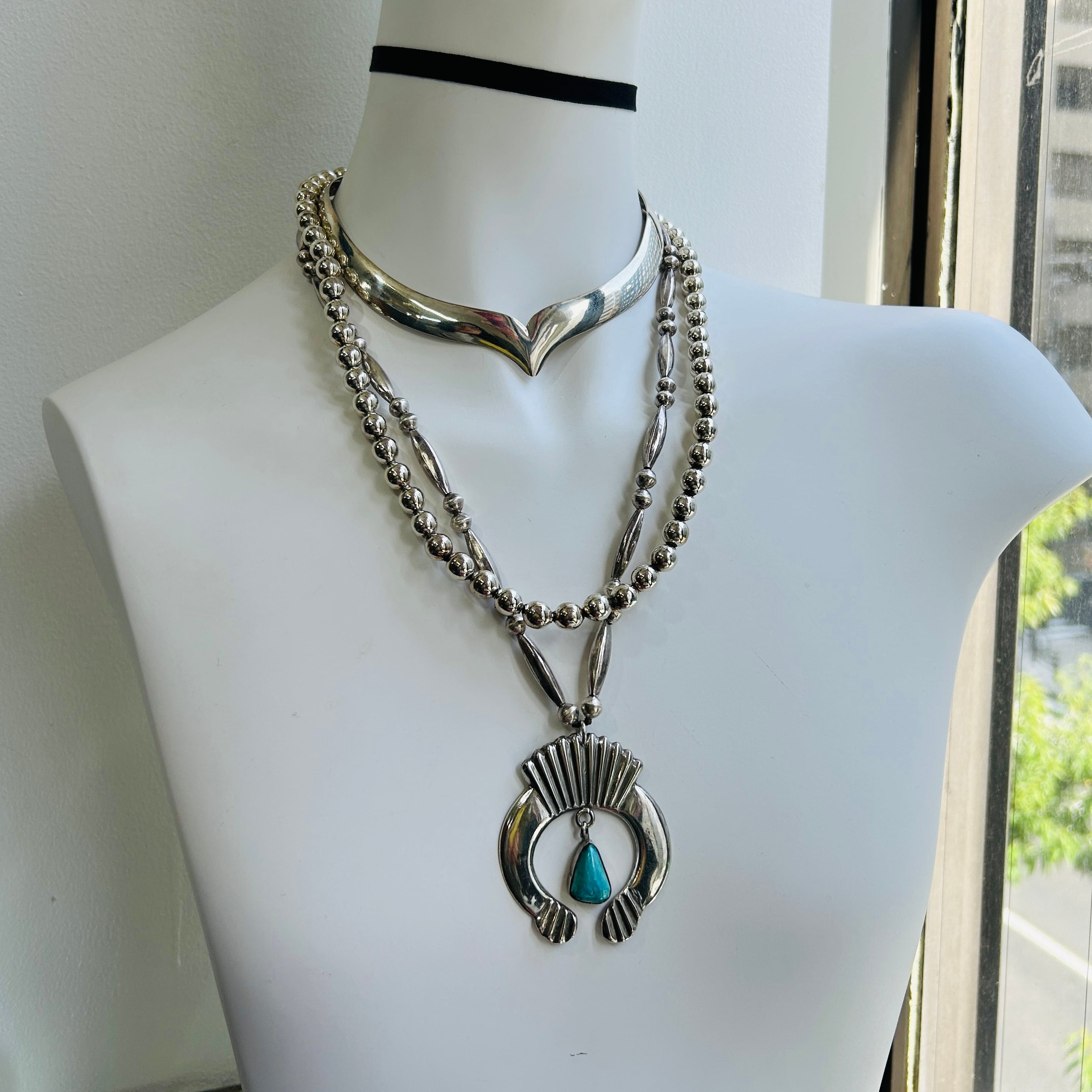差し込み金具のメキシカンシルバーネックレス。ツヤッツヤの煌めくシルバーボールビーズです。中にはワイヤーのようなチェーンが通っています。遊びはそれほどありませんが、小さくまとまるしなやかさもあります。格好よさとエレガンスの品格あるネックレス、大変オススメです。差し込み金具は入り口が少し硬め。いいことだと思います。奥まで差し込むとカチっと留まります。留め具にTAXCO(メキシコ・タスコ)マーク「TE-45」と「925」。「MEXICO」刻印がありません。メキシカンシルバーらしい素朴さだと思います。*送料無料・宅急便でお届けします。