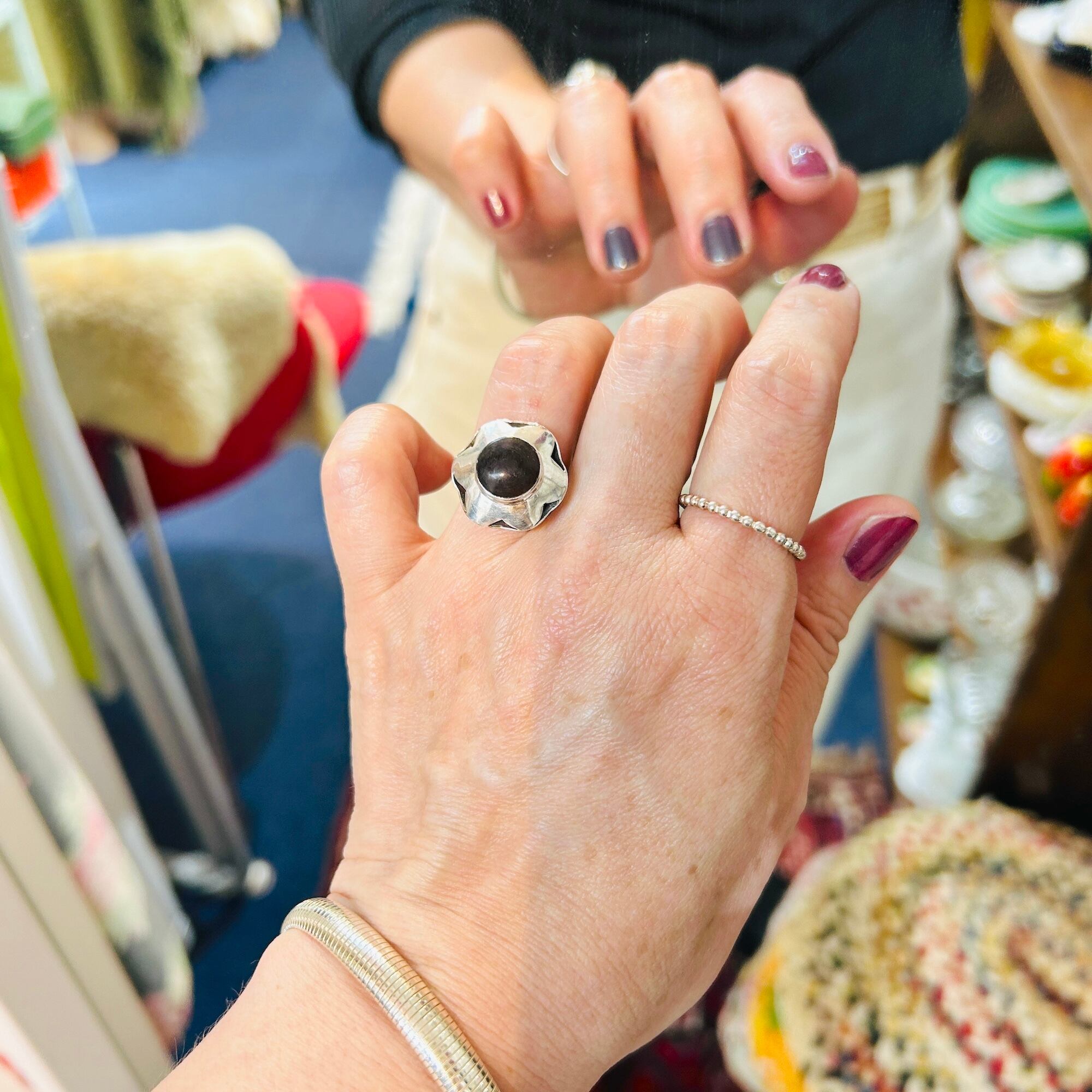 丸い花型リング。薄作りでユニークな作りのフラワーです。少し盛り上がったトップは2枚あわせで出来ています。上部は中央にストーンの丸い花。下側も丸い花びら型。花びらと花びらの間に見える黒い部分は上下の隙間で中は空洞、とても軽いリングです。ストーンは何か分かりません。赤味がかった暗いストーンです。樹脂ではないと思うのですが、、、、判別できません。