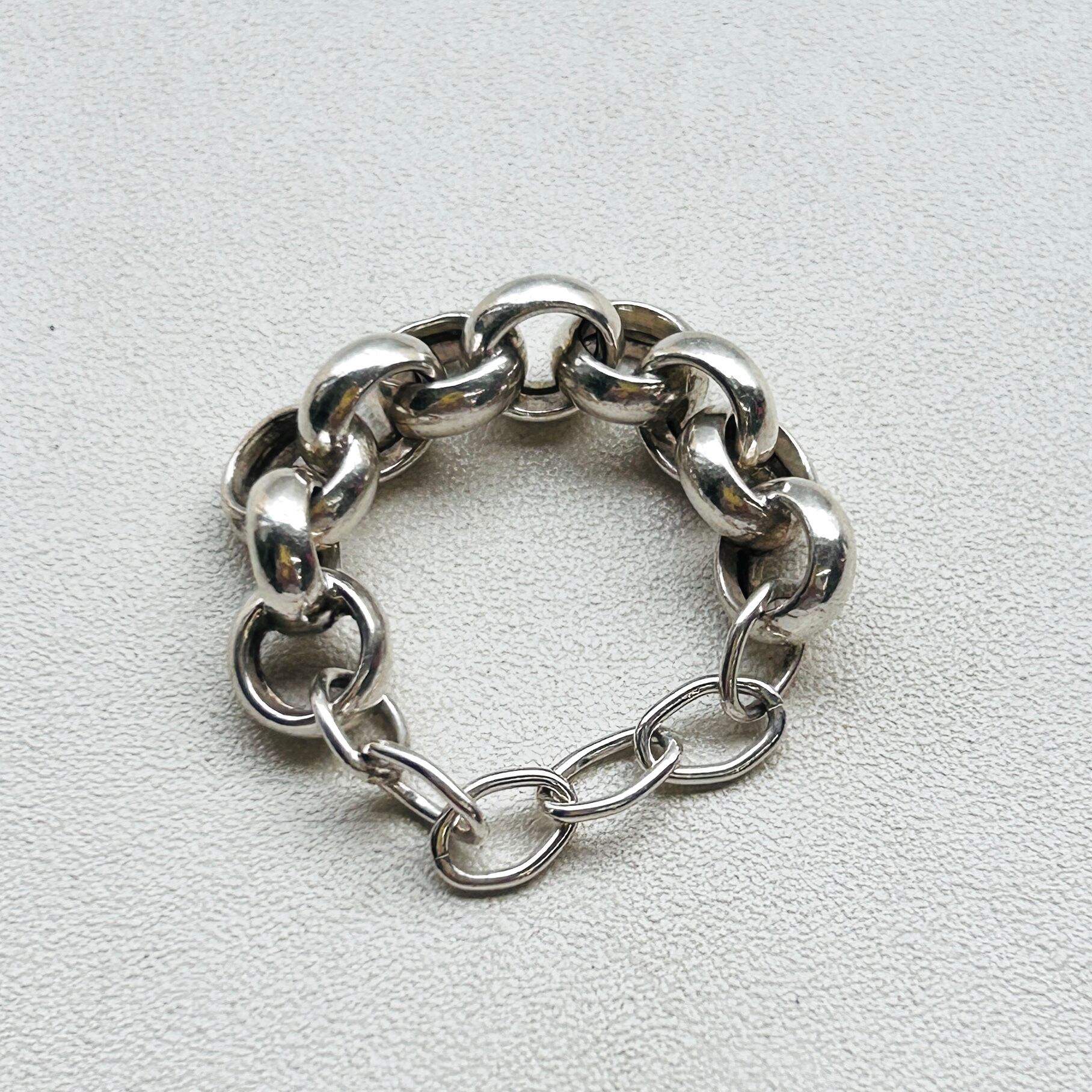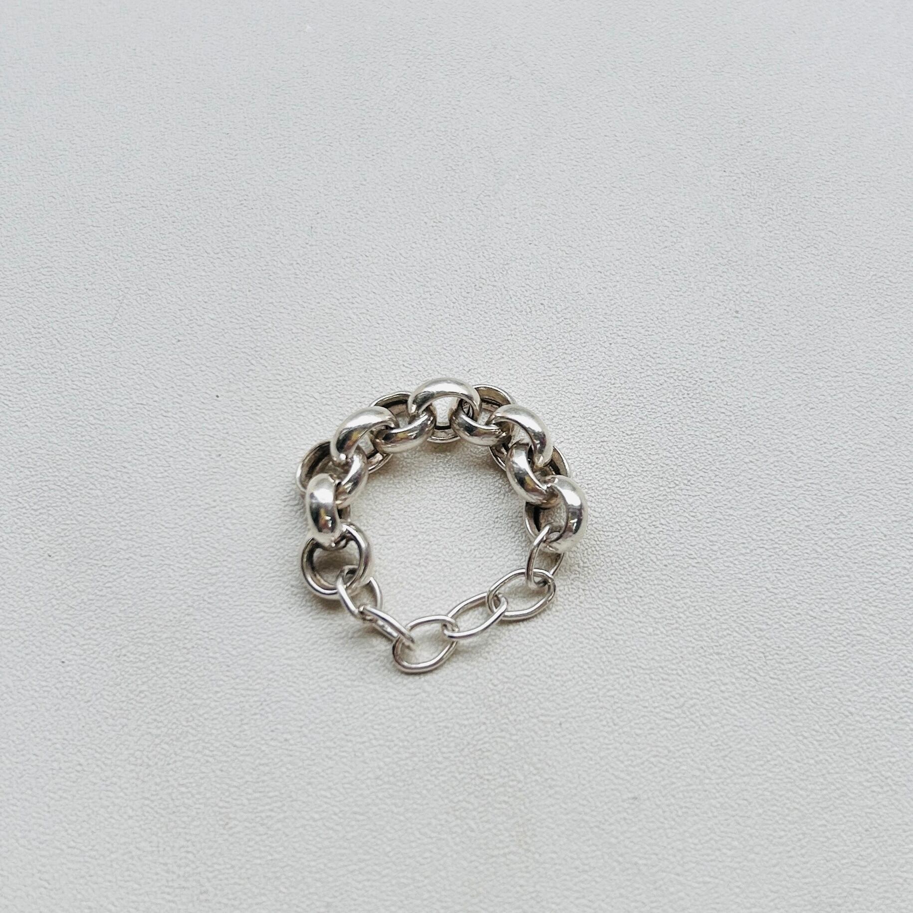 シルバー925チェーンの切れ端を修理屋さんでリングにしてもらいました。こちらは丸丸したロロチェーン。2/3はロロチェーン、1/3は修理屋さんの新品チェーンです。転がして指に入っていくので着けやすいです。チェーン幅7mm。若干、チェーンが隣の指に干渉しますが気にならない程度です。