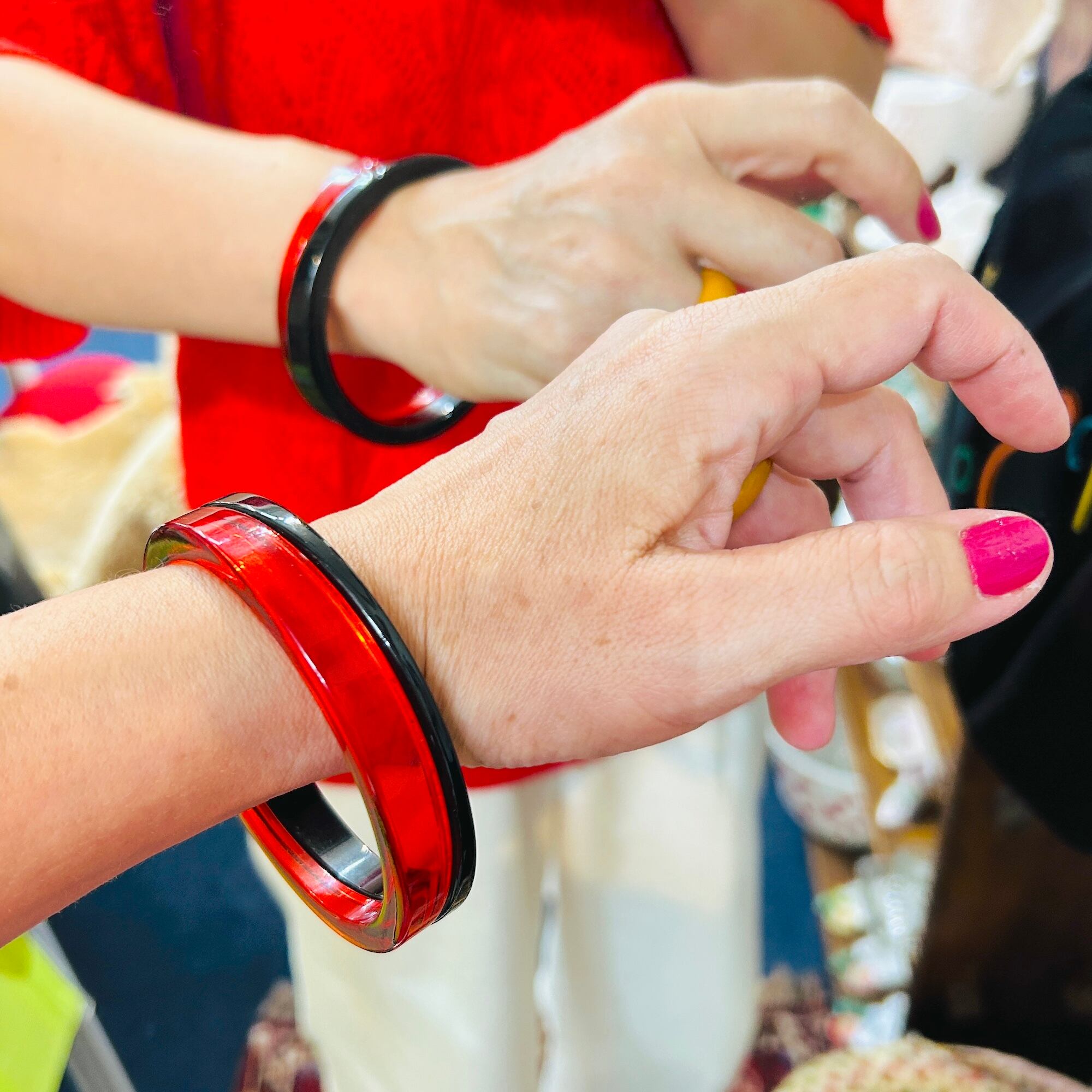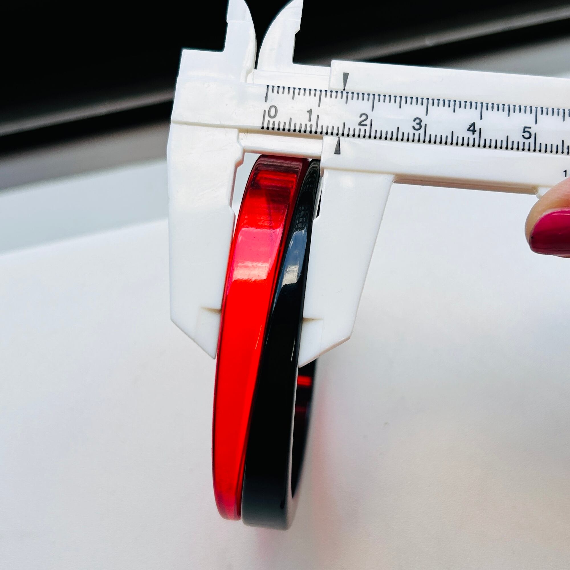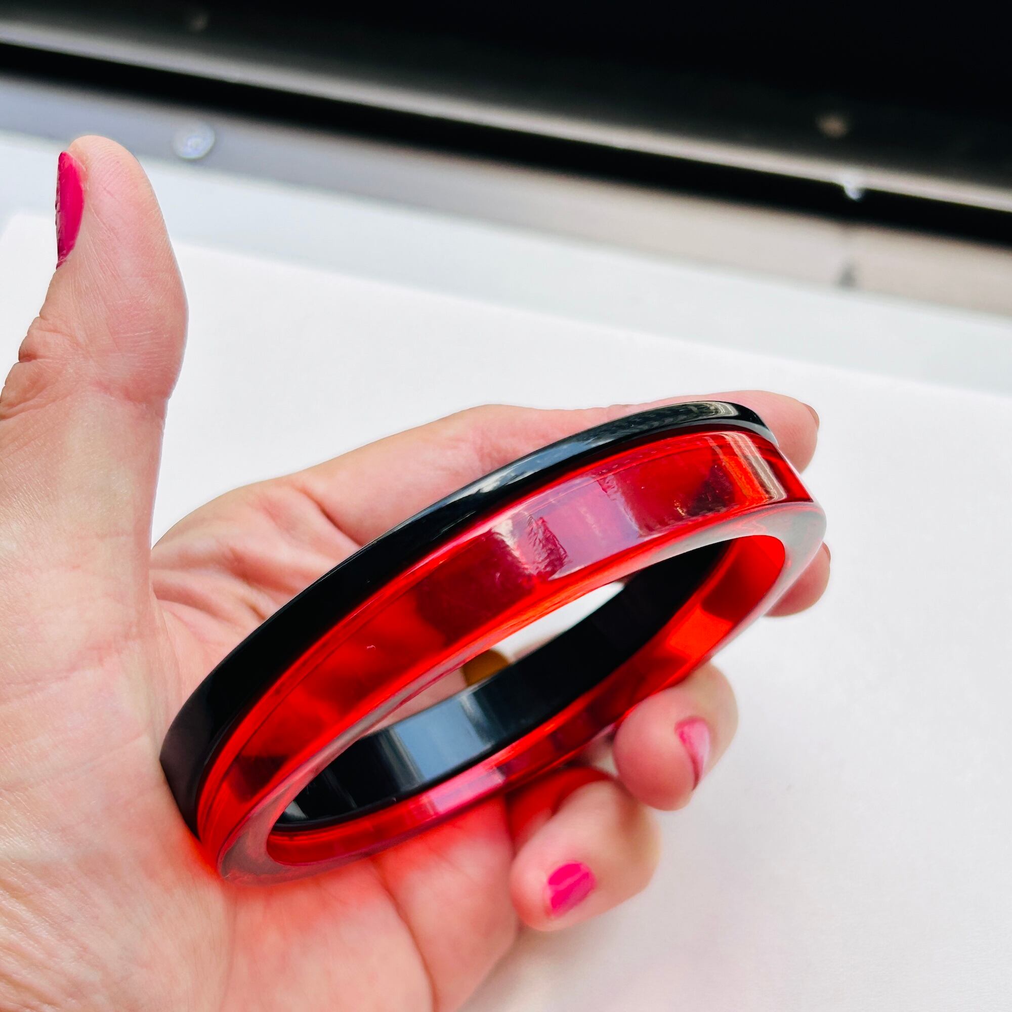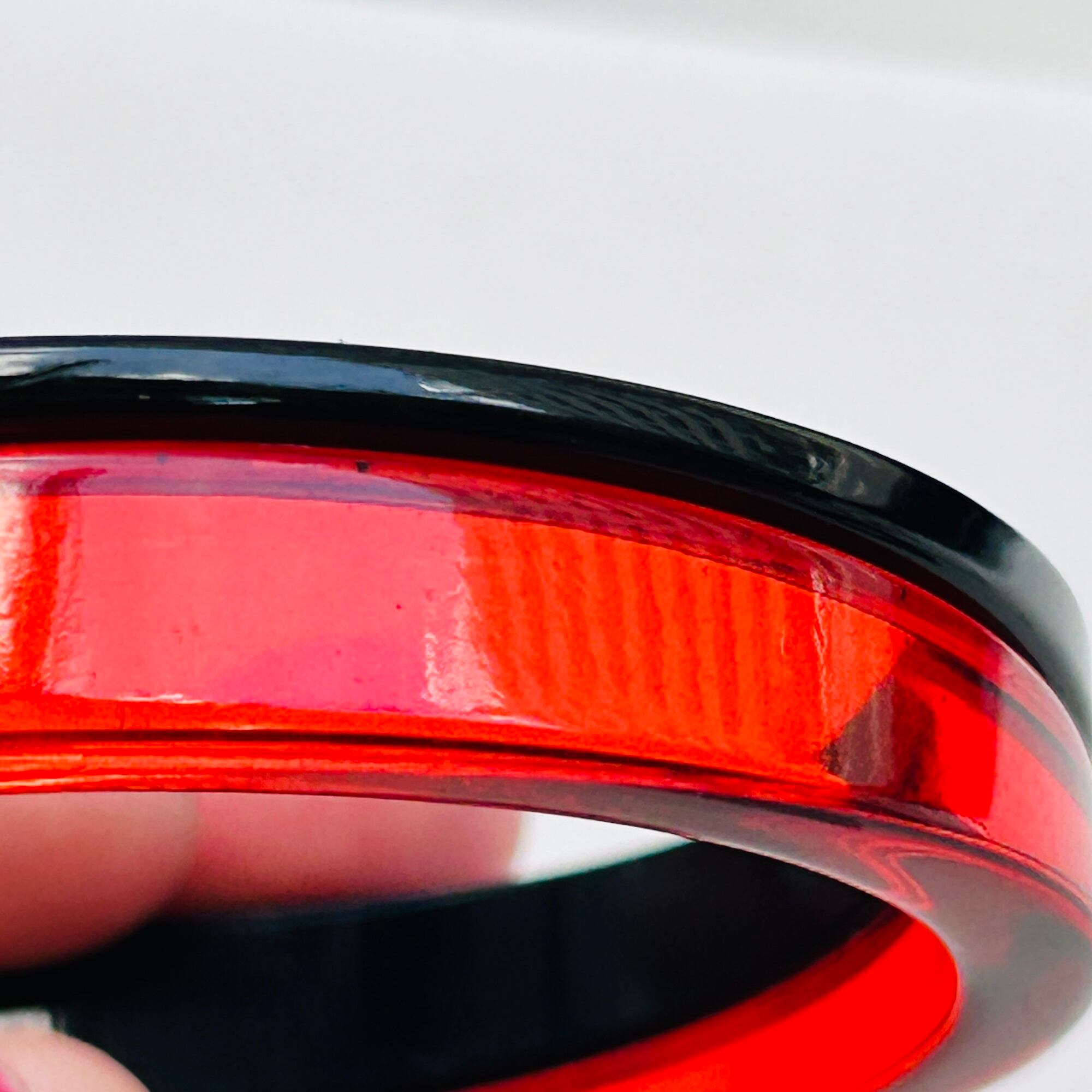 クリアレッドが目を引く2トーンバングル。斜めの配色が洒落ています。両側面に使用によるスレが見られます。写真で見るよりも気にならない程度です。