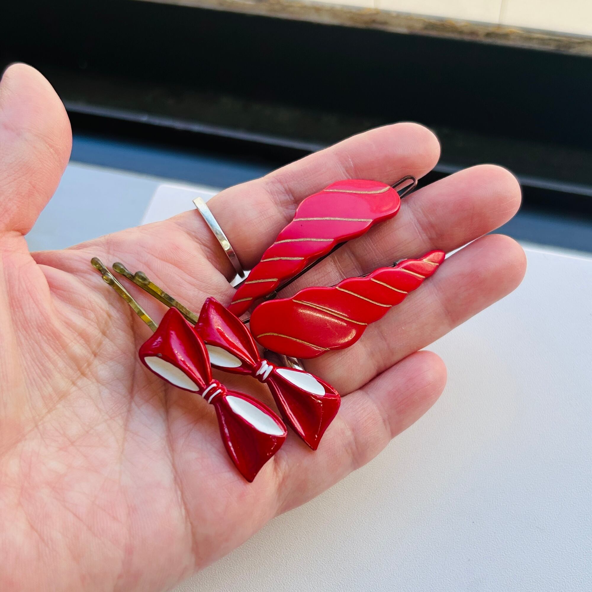 フランスから届いたヴィンテージ髪留め。2本セットでお届けします。シェルみたいな、羽みたいな、雲みたいなカタチ。小さな髪留めです。色はくすみレッド。マットゴールドの縞ラインです。金具の動きに問題ありません。