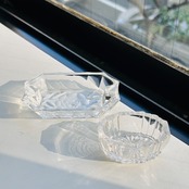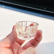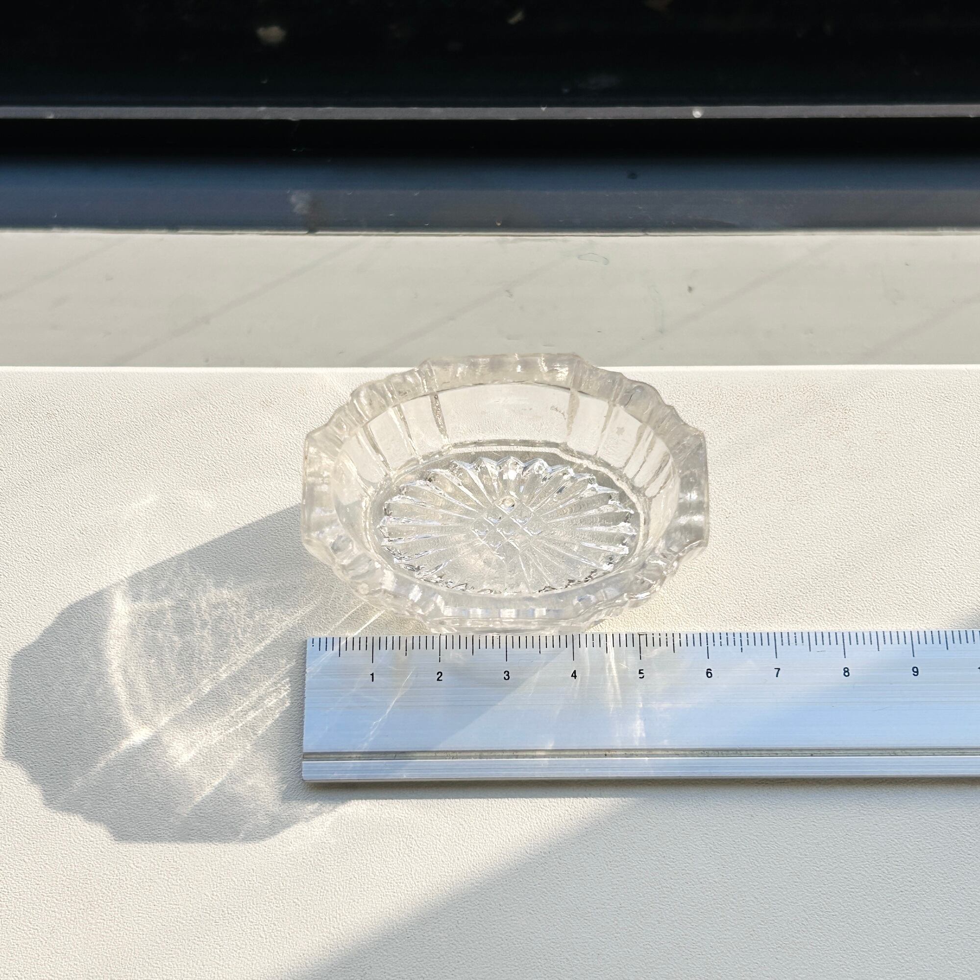 お造りのお醤油入れなど小さくて深さがある小皿を「のぞき」と呼びます。「のぞき」によく似たカタチなのでそうのように題しました。アメリカでは「small salt dish(小さな塩小皿)だと思います。古い時代を感じる分厚くてシャープなエッジのプレスガラスです。フチの外側・内側に小さなカケがいくつかあります。指で軽くなぞると凹凸を感じます。